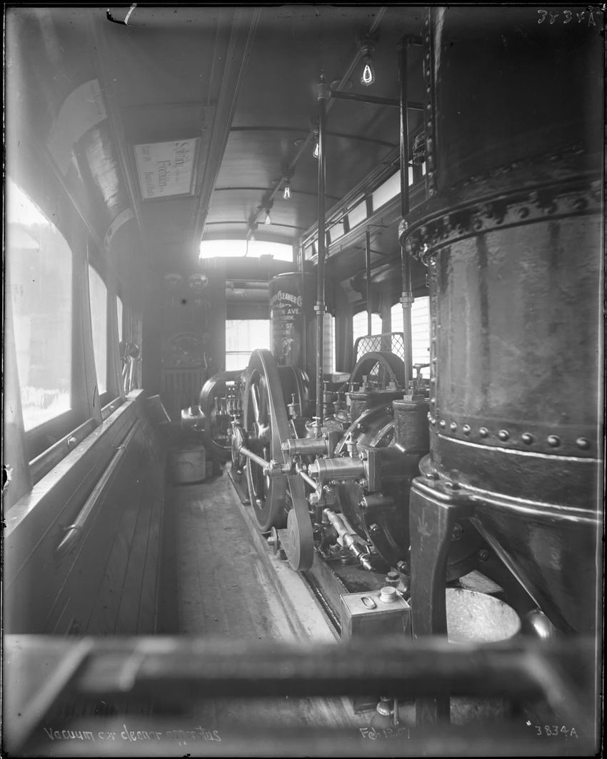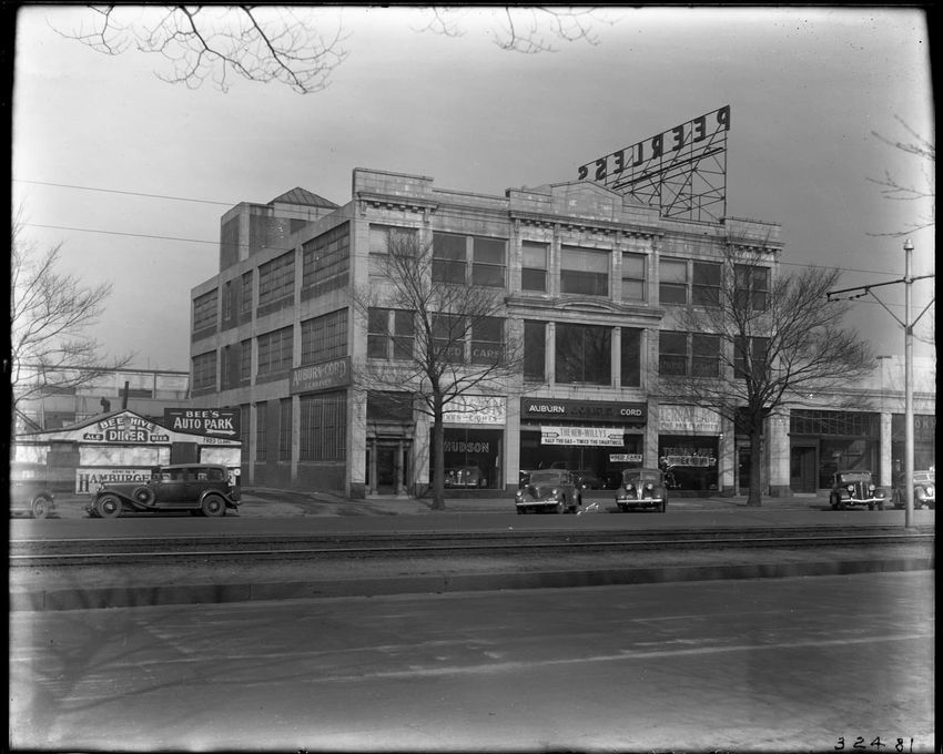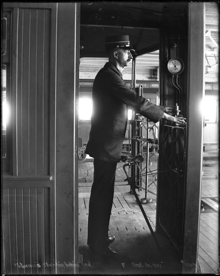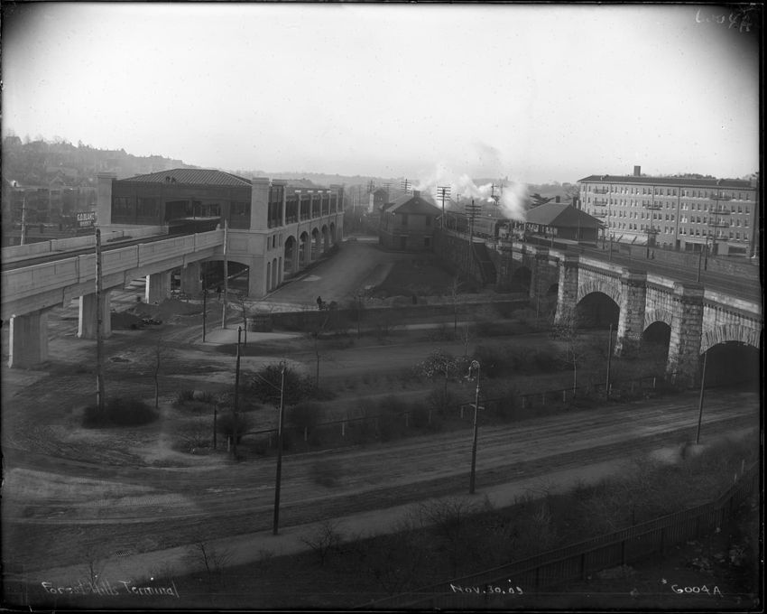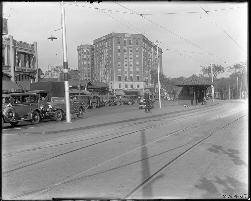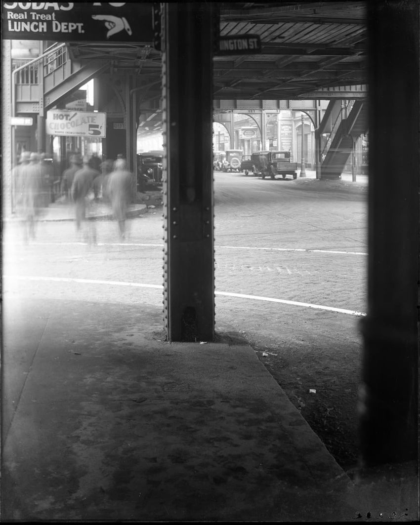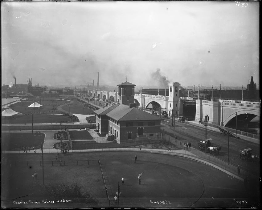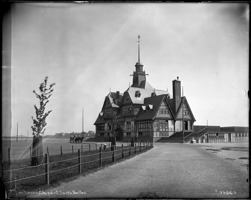 Street scene (winter), snow on the ground. Horse drawn wagon, trolley #91, sign: South Station, North Station, First National Bank Building, sign: left: New England Mutual Life Insurance Building, Angel Memorial Park, Far Right: Post Office + Subtreasury. Building, pedestrians.