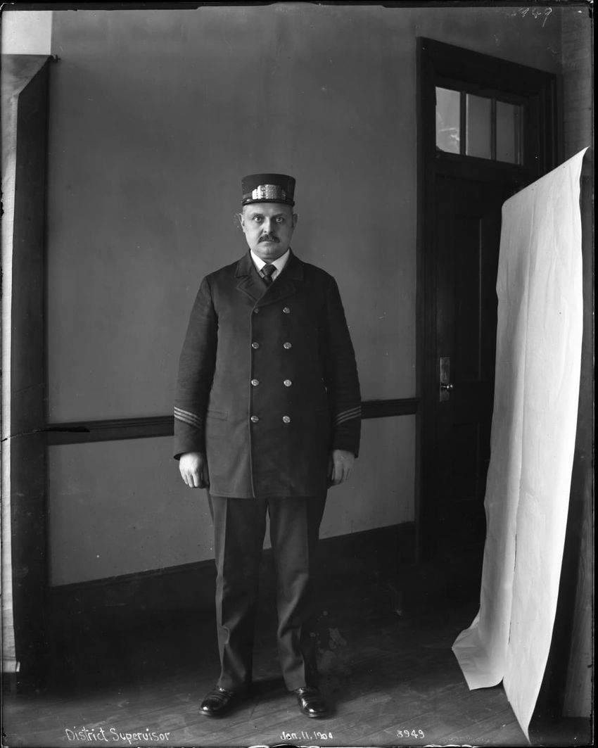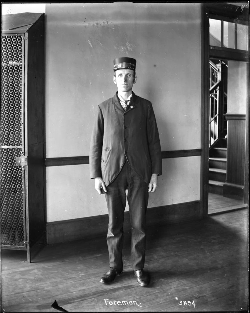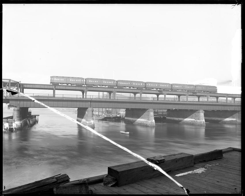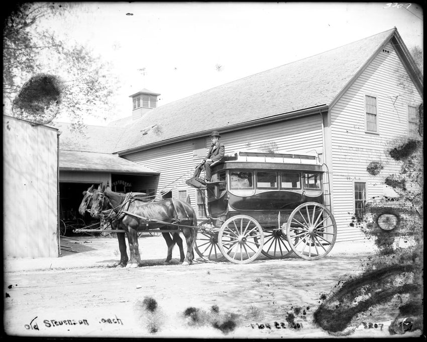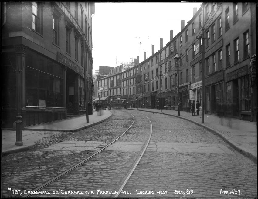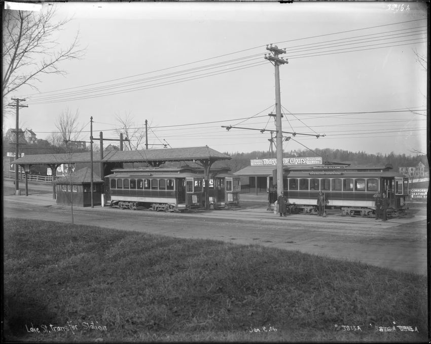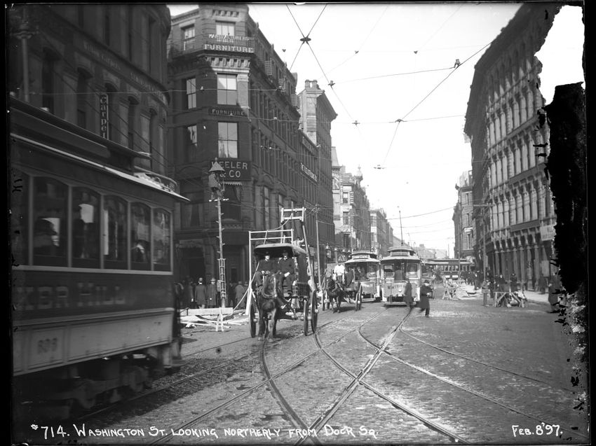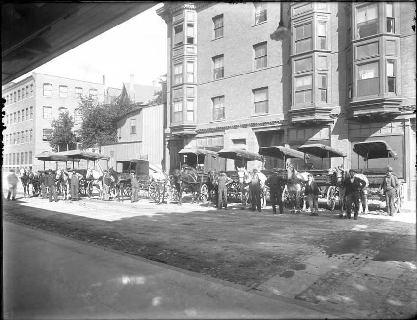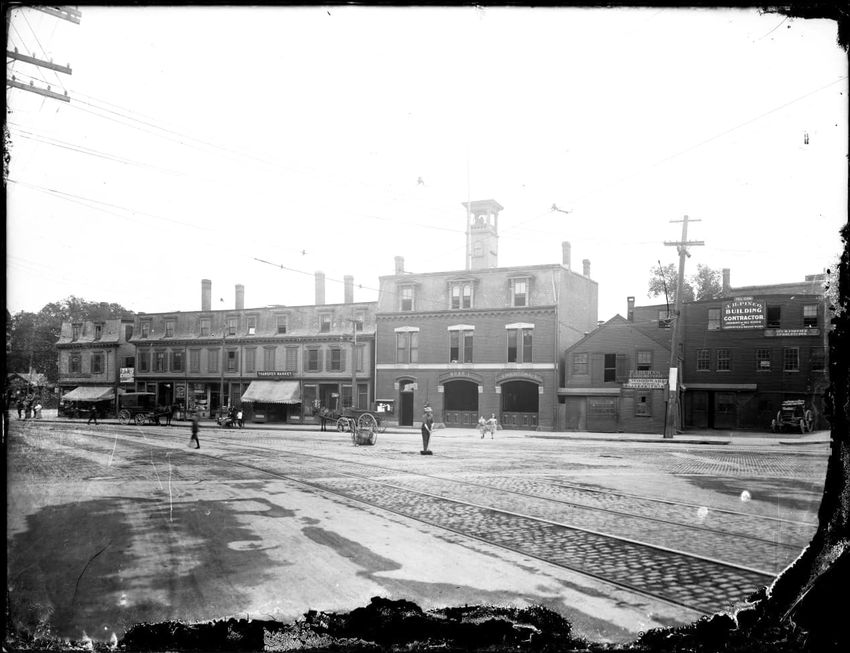 Transfer Market; Sing Lee, laundry; Fire Station, Hose House #1 and Chemical Engine #1 (140 Washington Street); P. J. Burns, Horse Shoe Forge; J. H. Pineo, carpenter and builder. Shops, signs, horse + wagons, people. Neg. Edge Peeled; corner 'chipped.' 6 1/2 X 8 1/2.