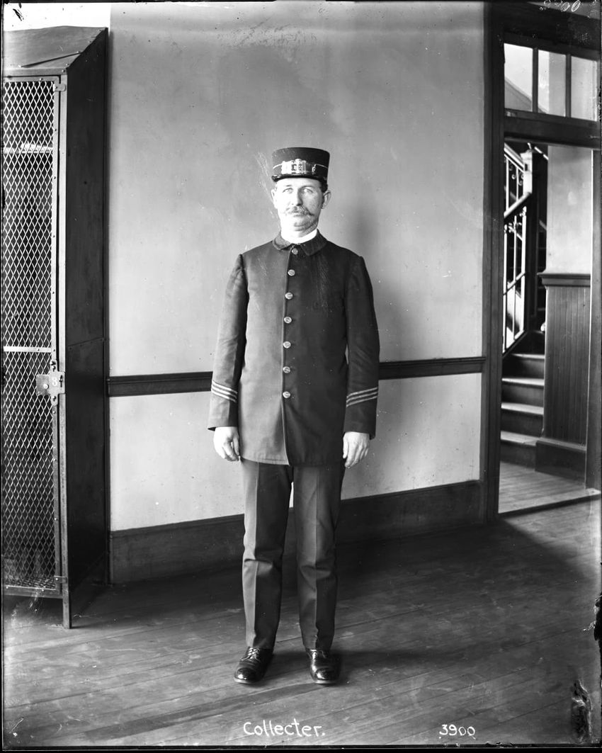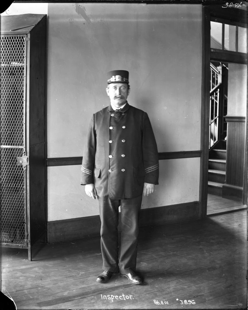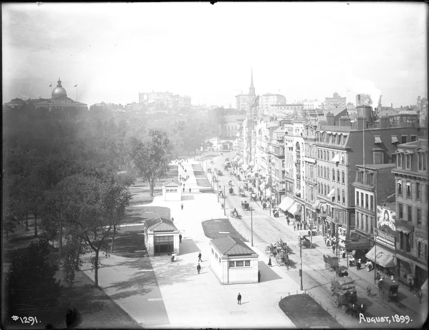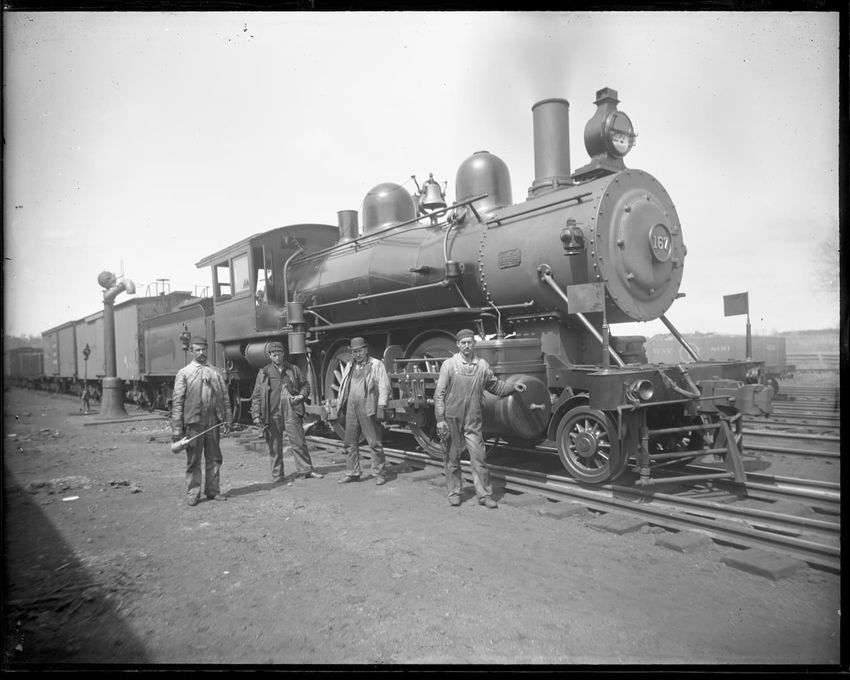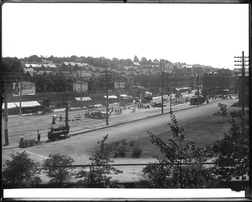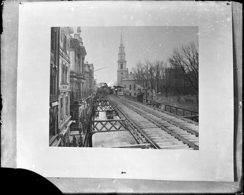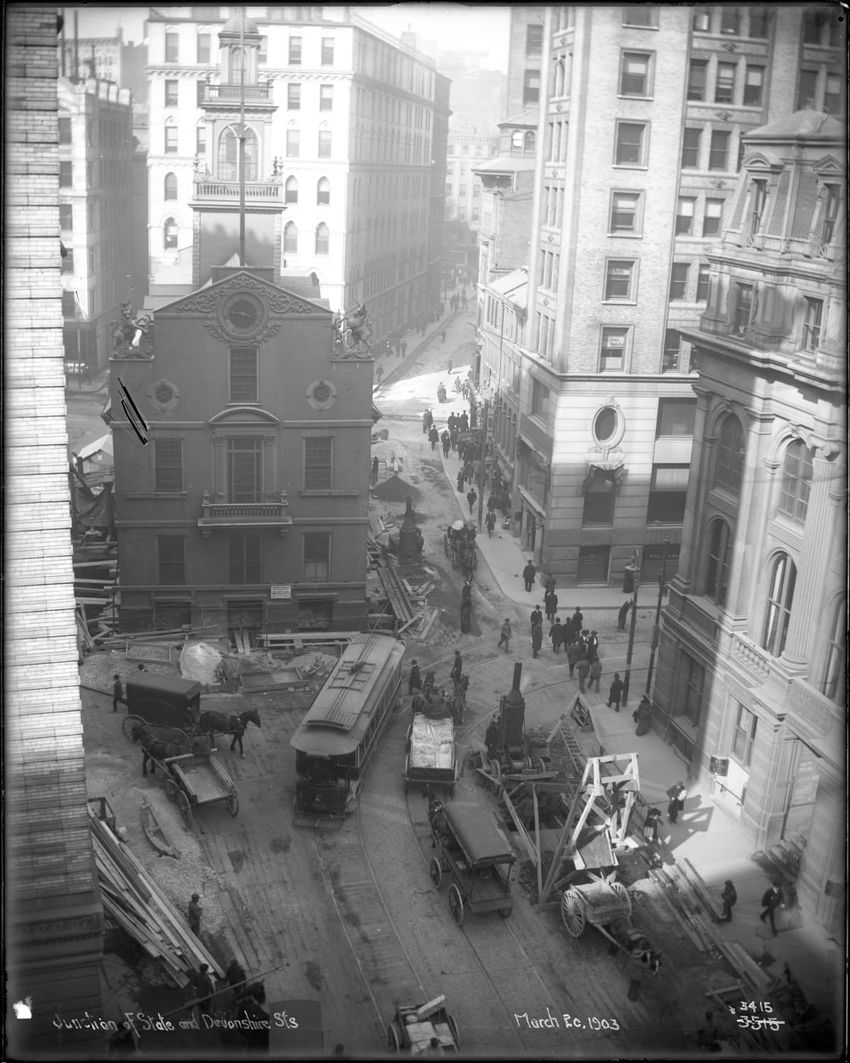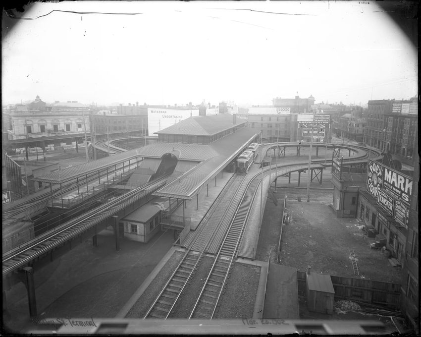 Transfer Market; Sing Lee, laundry; Fire Station, Hose House #1 and Chemical Engine #1 (140 Washington Street); P. J. Burns, Horse Shoe Forge; J. H. Pineo, carpenter and builder. Shops, signs, horse + wagons, people. Neg. Edge Peeled; corner 'chipped.' 6 1/2 X 8 1/2.