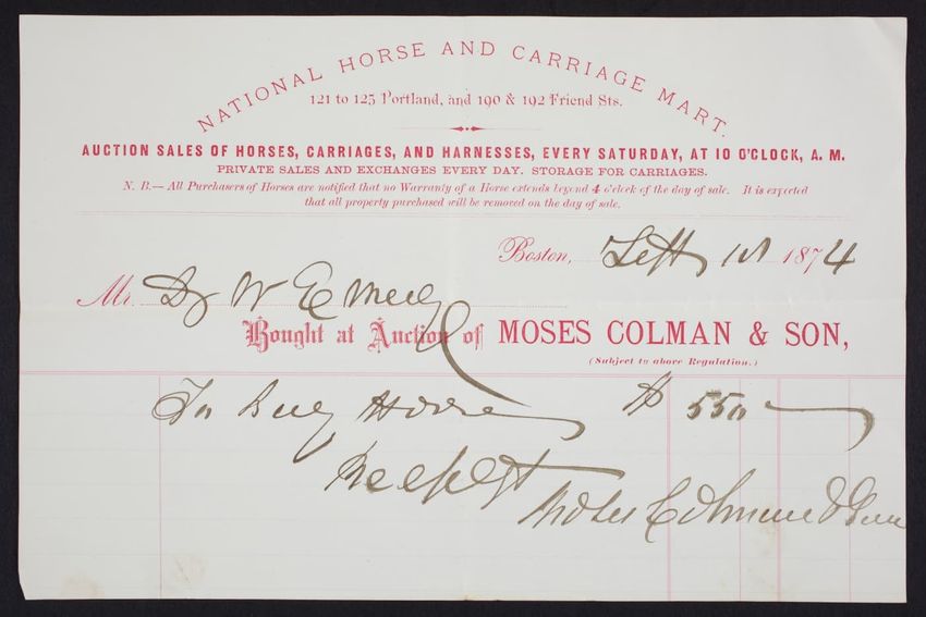 Billhead for Moses Colman & Son, National Horse and Carriage Mart, auction sales of horses, carriages, and harnesses, 121 to 125 Portland and 190 & 192 Friend Sts., Boston, Mass., dated September 10, 1874