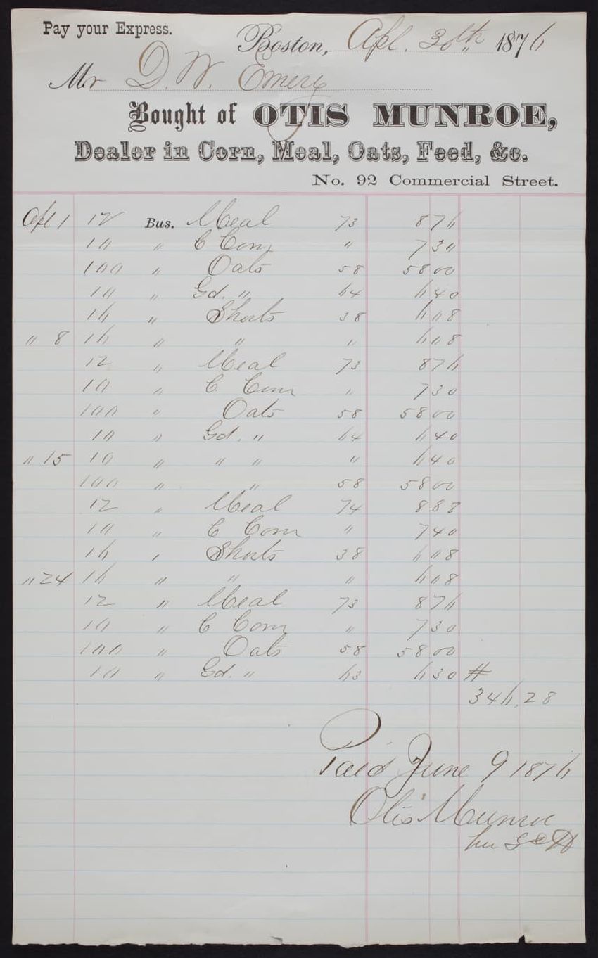 Billhead for Otis Munroe, dealer in corn, meal, oats & feed &c., no. 92 Commercial Street, Boston, Mass., dated April 30, 1876