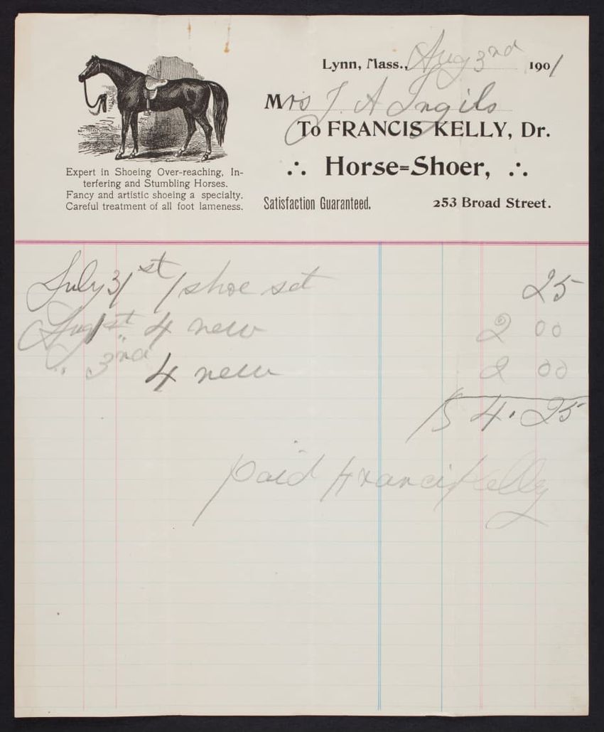 Billhead for Francis Kelly, Dr., horse-shoer, 253 Broad Street, Lynn, Mass, dated August 3, 1901