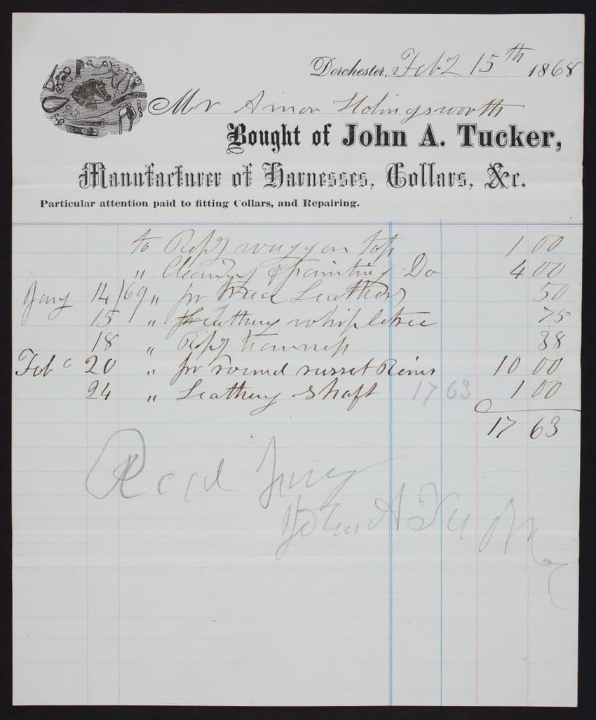 Billhead for John A. Tucker, manufacturer of harnesses, collars, &c., Dorchester, Mass., dated February 15, 1868