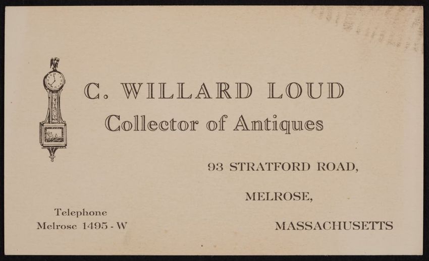 Business card for C. Willard Loud, Collector of Antiques, 93 Stratford Road, Melrose, Mass., undated