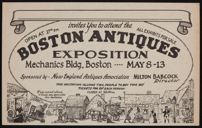 The card is an invitation for the Boston Antiques Exposition sponsored by the New England Antiques Association, Milton Babcock, Director. The bottom of the card has an illustration of a New England village.