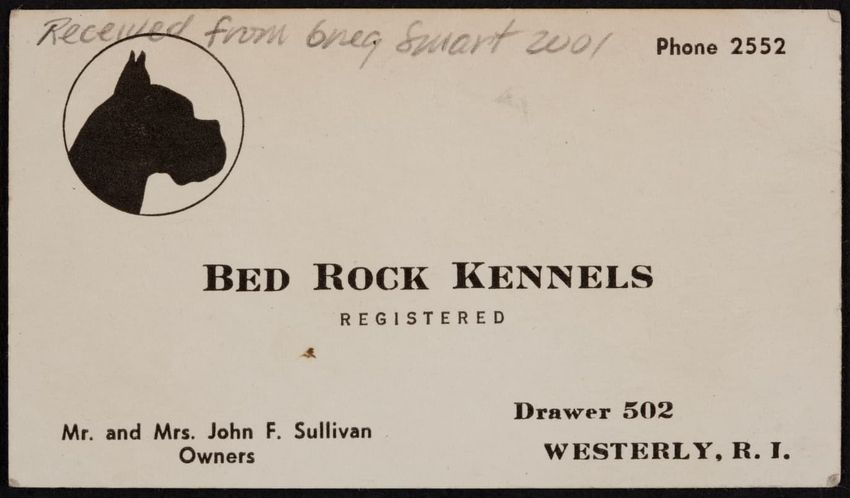Business card for Bed Rock Kennels, drawer 502, Westerly, Rhode Island, undated
