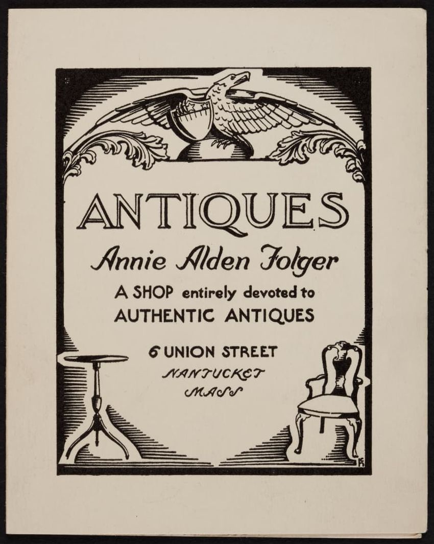 Trade card for Annie Alden Folger, antiques, 6 Union Street, Nantucket, Mass., undated