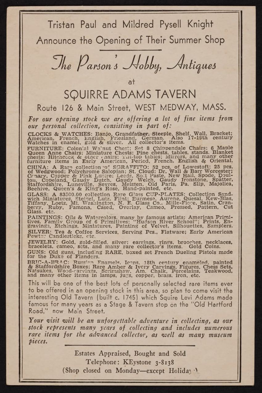 Trade card for The Parson's Hobby, antiques at Squirre Adams Tavern, Route 126 & Main Street, West Medway, Mass., undated