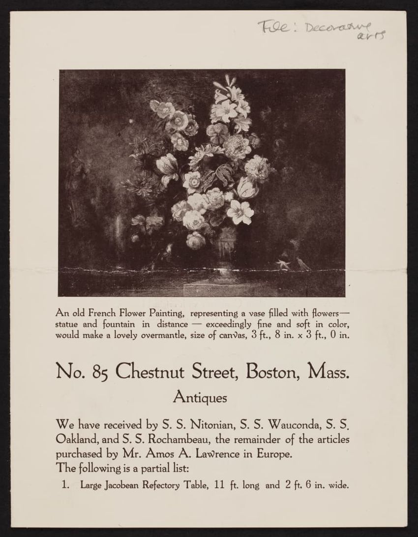 The leaflet is a partial listing of antique items, with photographs, purchased in Europe by Mr. Amos A. Lawrence and available for sale.