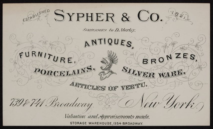Trade card for Sypher & Co., antiques, 739 & 741 Broadway, New York, undated