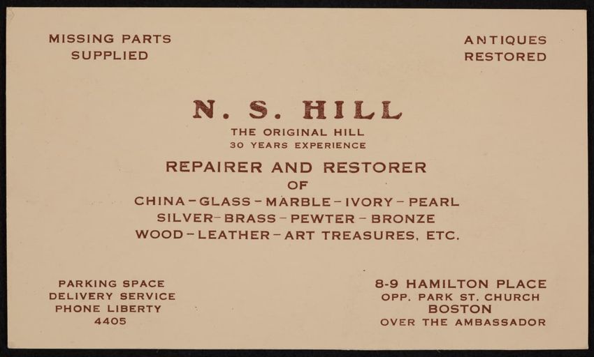 Business card for N.S. Hill, repairer and restorer, 8-9 Hamilton Place opp. Park St. Church over the Ambassador, Boston, Mass., undated