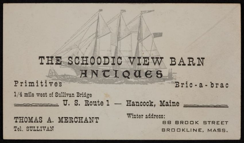 Business card for The Schoodic View Barn Antiques, U.S. Route 1, Hancock, Maine, 88 Brook Street, Brookline, Mass., undated