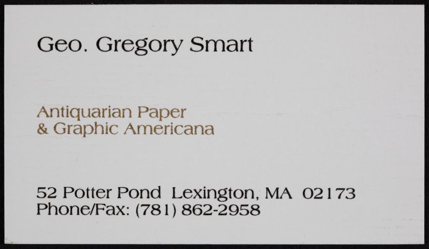Business card for Geo. Gregory Smart, antiquarian paper & graphic Americana, 52 Potter Pond, Lexington, Mass., undated