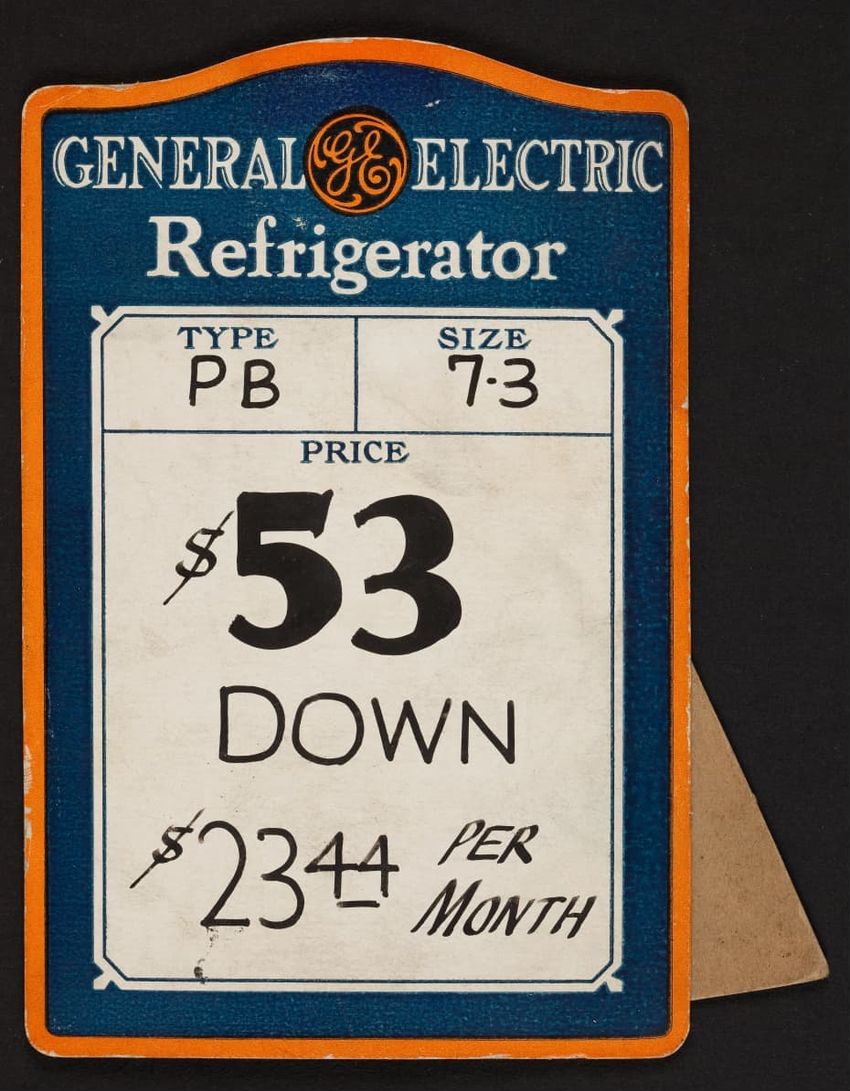 Advertisement tag for General Electric Refrigerator, location unknown, undated