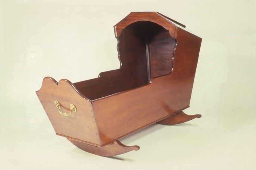Card table. Mahogany, mahogany veneer, tulip poplar, white pine secondary wood. Rectangular swiveling top folds into a square shape when leaf opened. Paneled skirt; urn-shaped pillar with brass inlay; shaped base. Rests on foliate acanthus scroll legs with paw feet with casters.