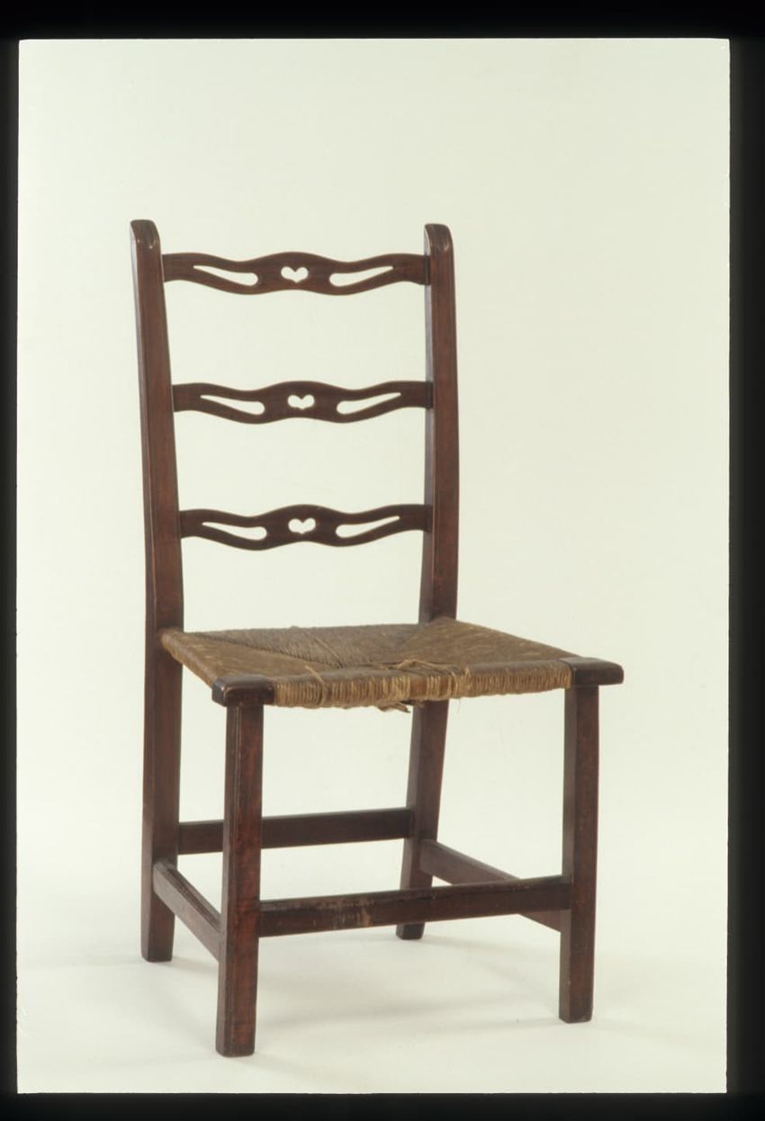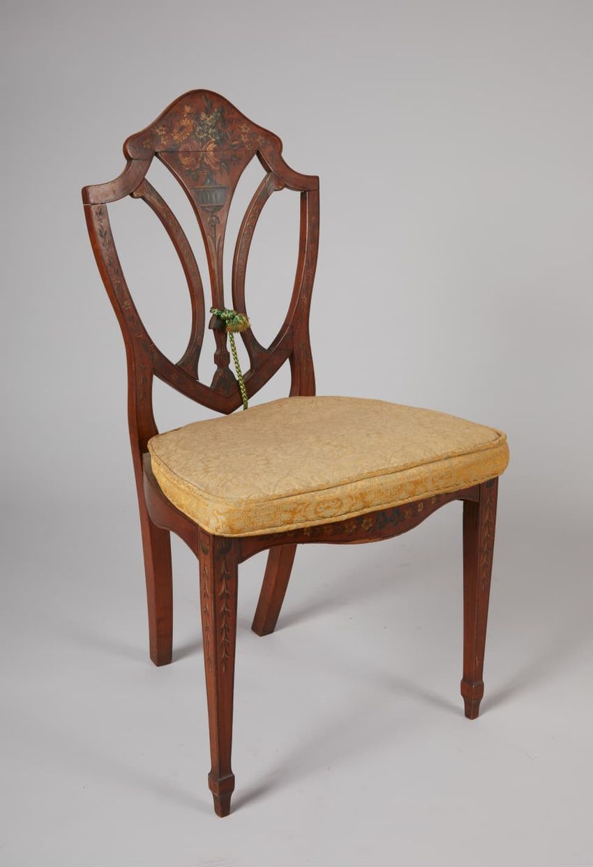 Chair, one of a pair. Painted oak. Continuous bent front leg to stile, bentwood back; original paint displays peacock feathers and banding.