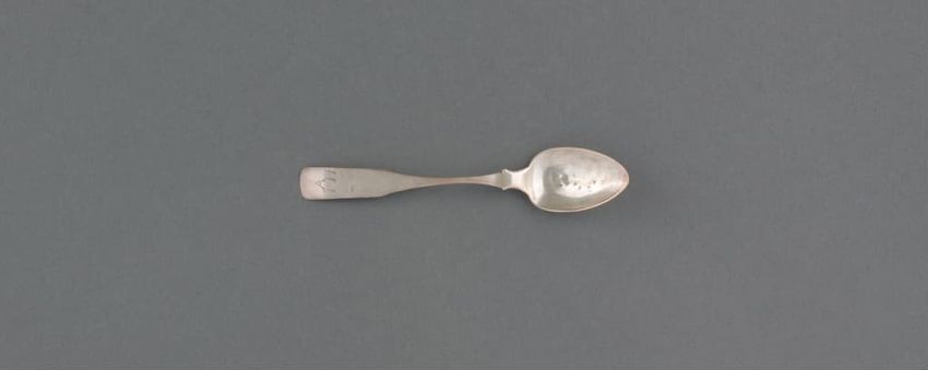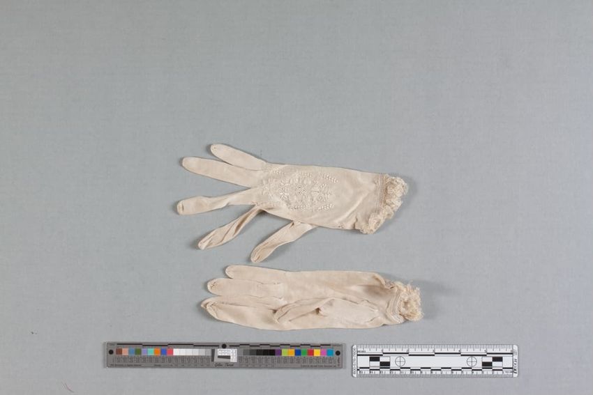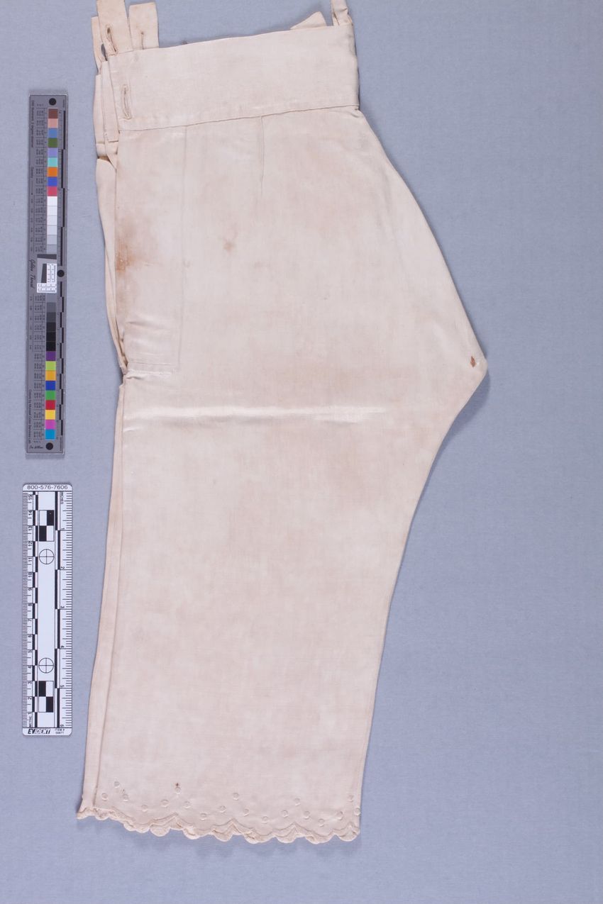 White woven plaid; printed floral band at neckline, sleeves and hem; skirt gathered all around at waistband; printed band in pink, purple and beige w/ floral garlands and floral medallion; 3 pearl buttons.