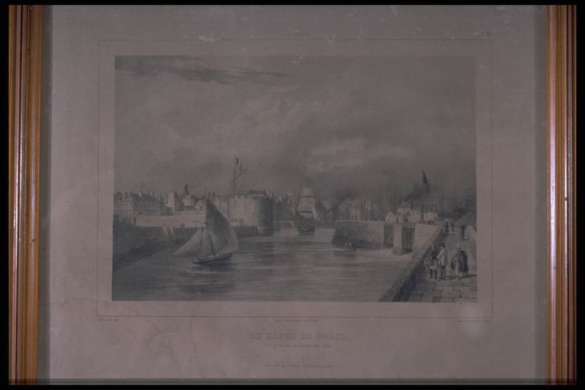 Engraving of Lady Jane Grey seated at a table signing her death warrant. A religious figure is also seated at the table signing a letter, and the male ordering the warrant points to where she should sign. Mounted in a 3 in. wood and gilt frame.