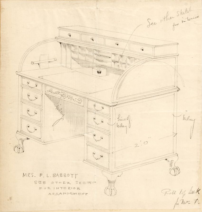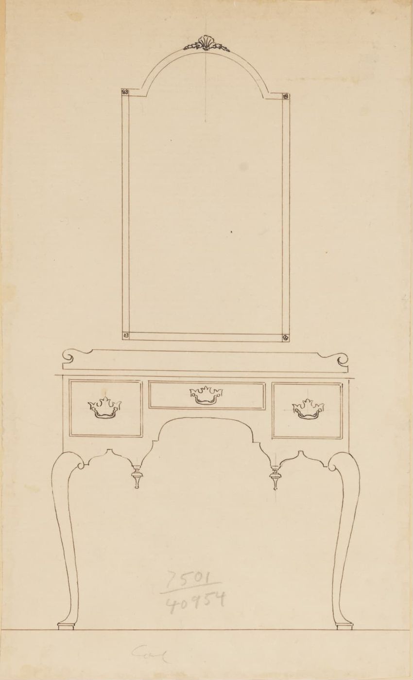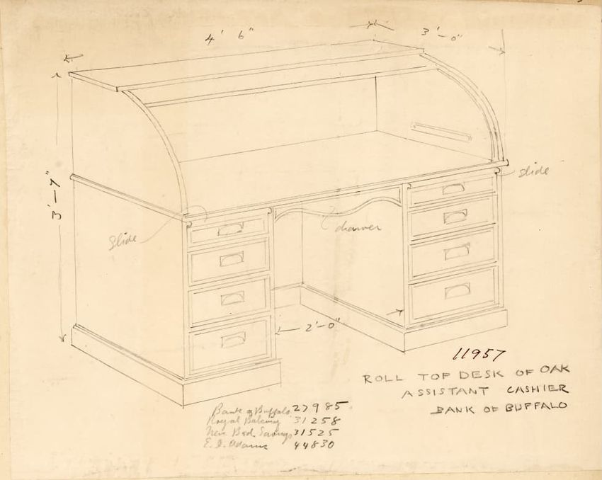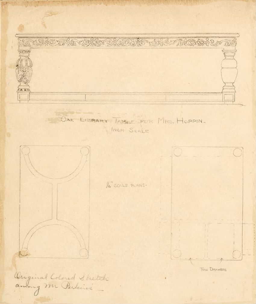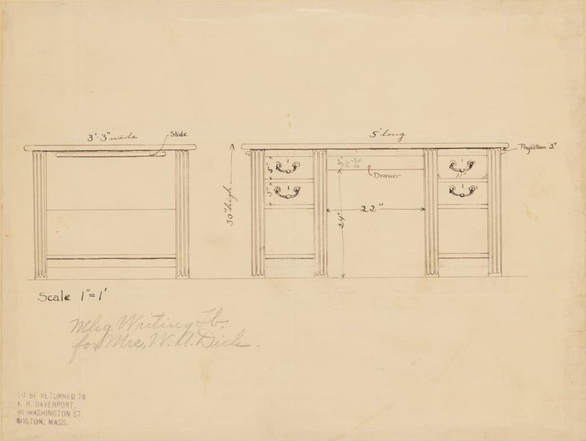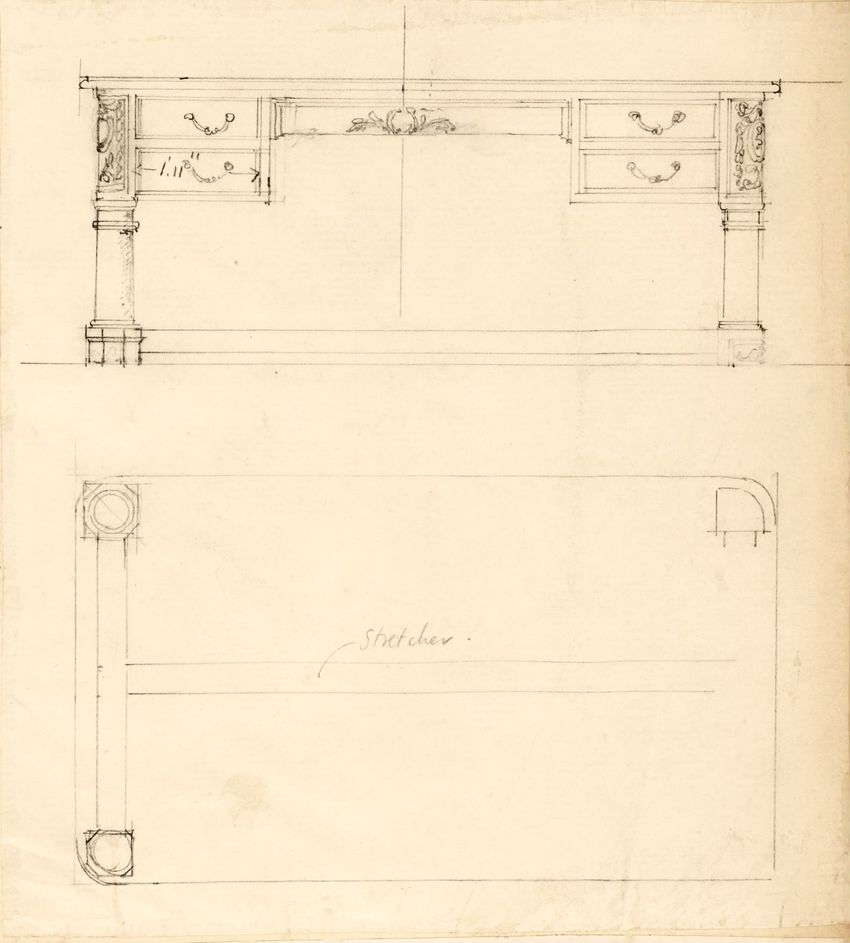 Untitled design drawing rendered in pencil on trace. Front and side views are shown. Rectangular pedestal desk has overhanging top with carved molded edge; deep frieze with molded bottom edge; two pedestals, each with three drawers with bail handles, that rest on bases with molded top edges; outer s...