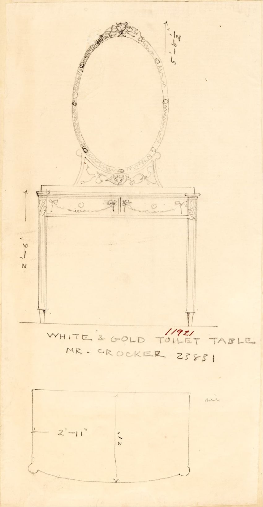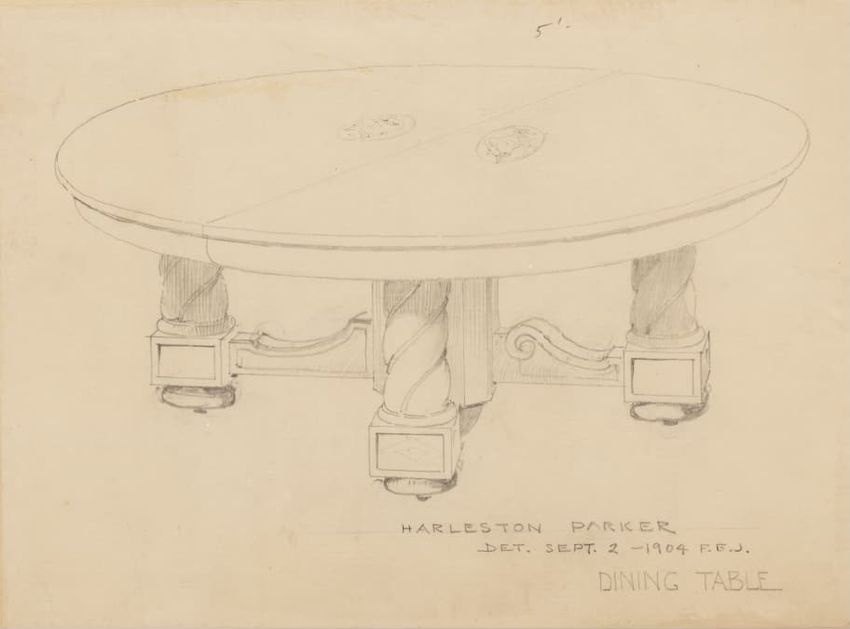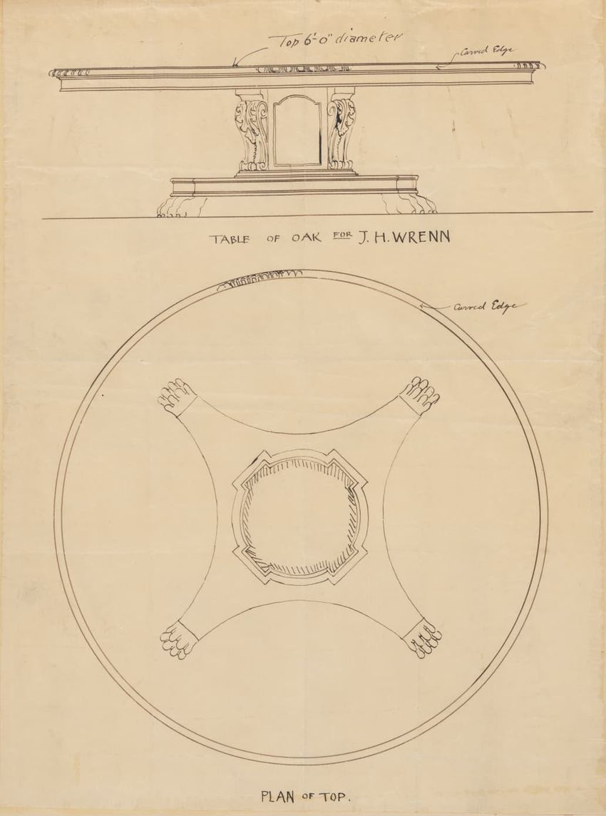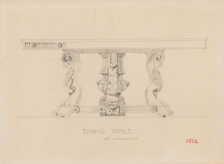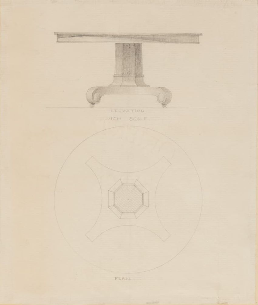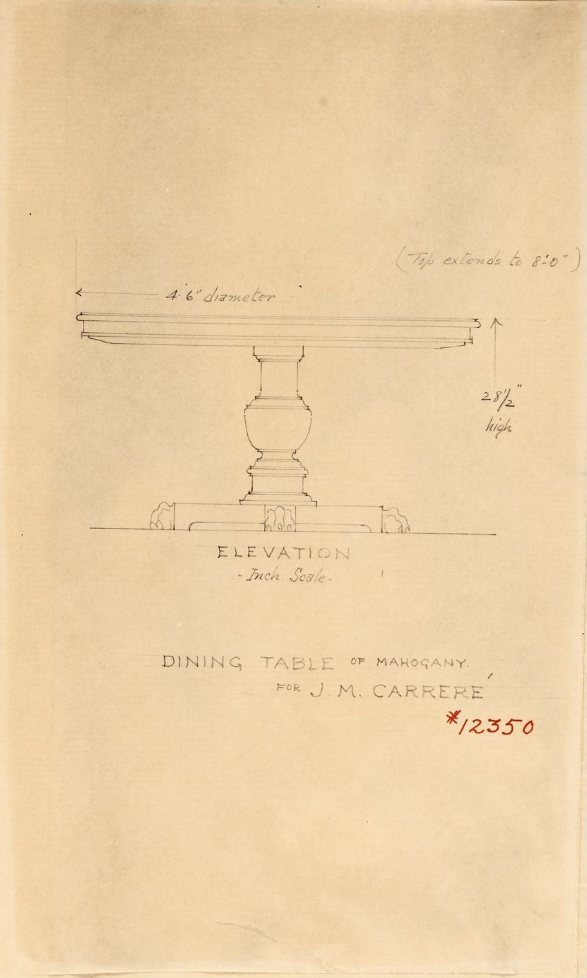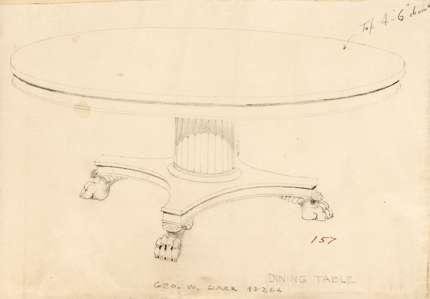 Design drawing titled "Dining Table" rendered in pencil on trace. Perspective view is shown. Round dining table has overhanging top; columnar reeded pedestal; cruciform base with concave sides; and large scrolled feet with carved rosettes on sides. Title, design notes, "172," "Mrs. J. B. Clark 48489...