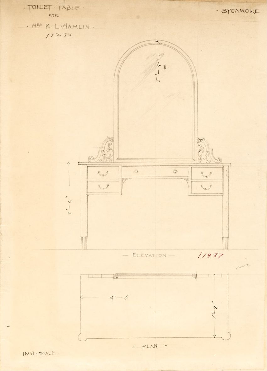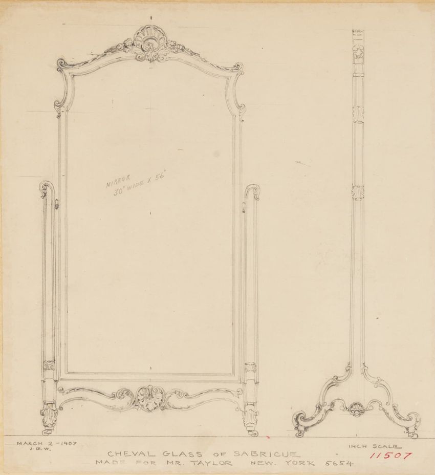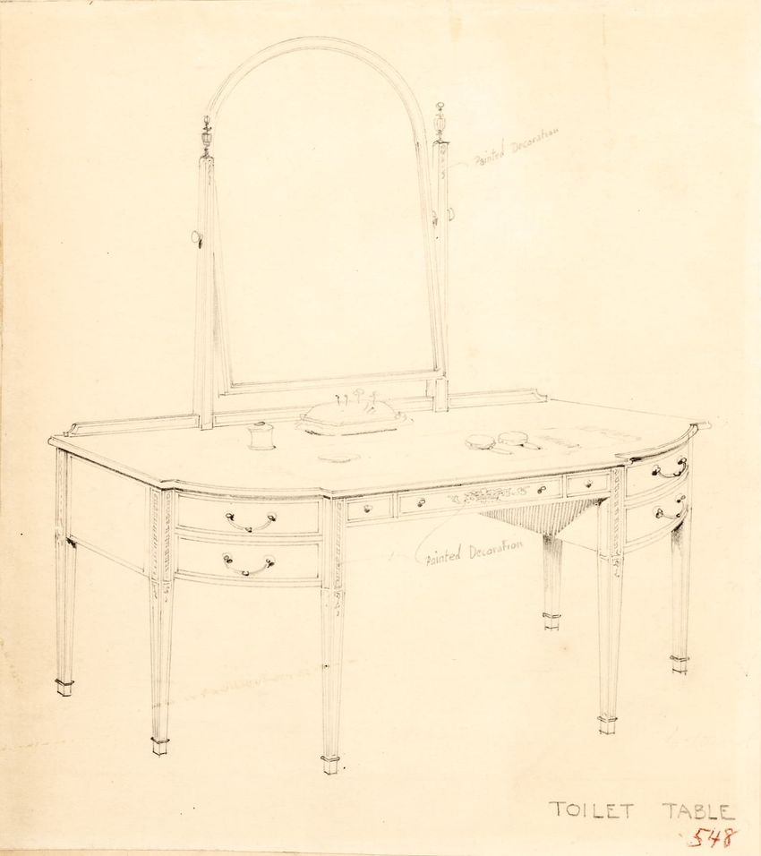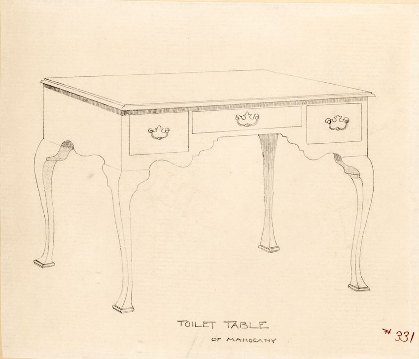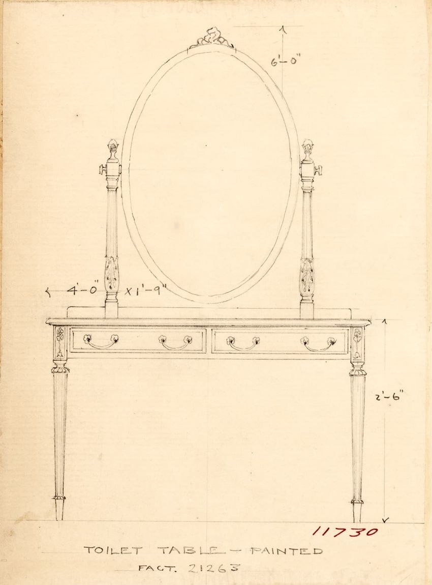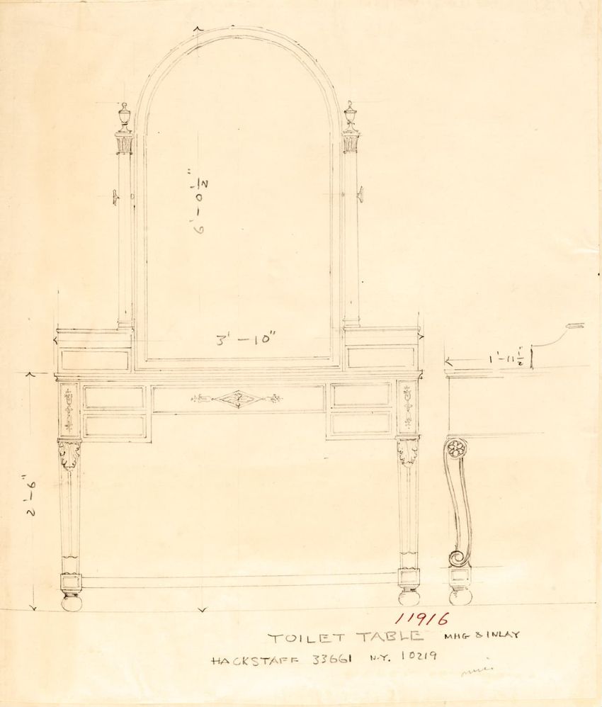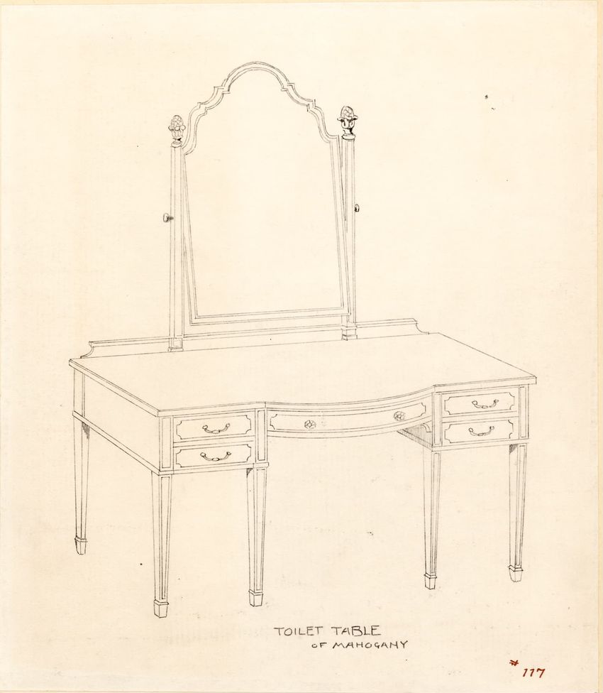 Design drawing titled "Dining Table" rendered in pencil on trace. Perspective view is shown. Round dining table has overhanging top; columnar reeded pedestal; cruciform base with concave sides; and large scrolled feet with carved rosettes on sides. Title, design notes, "172," "Mrs. J. B. Clark 48489...