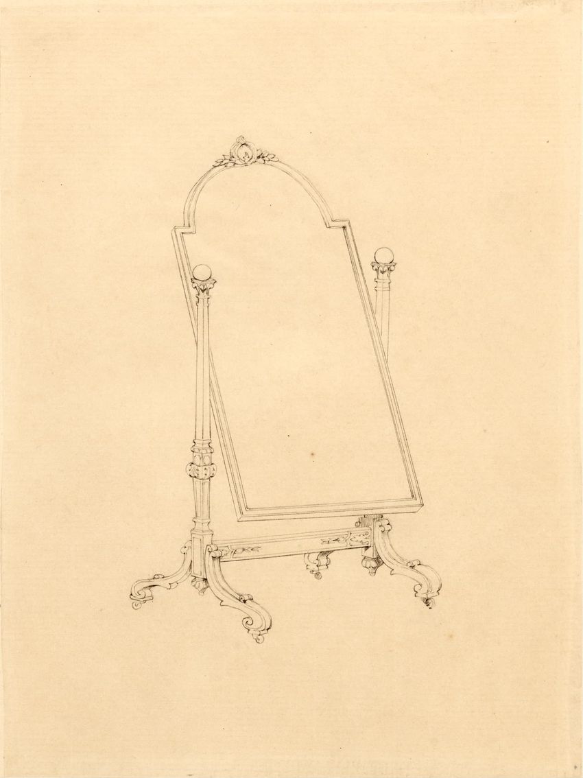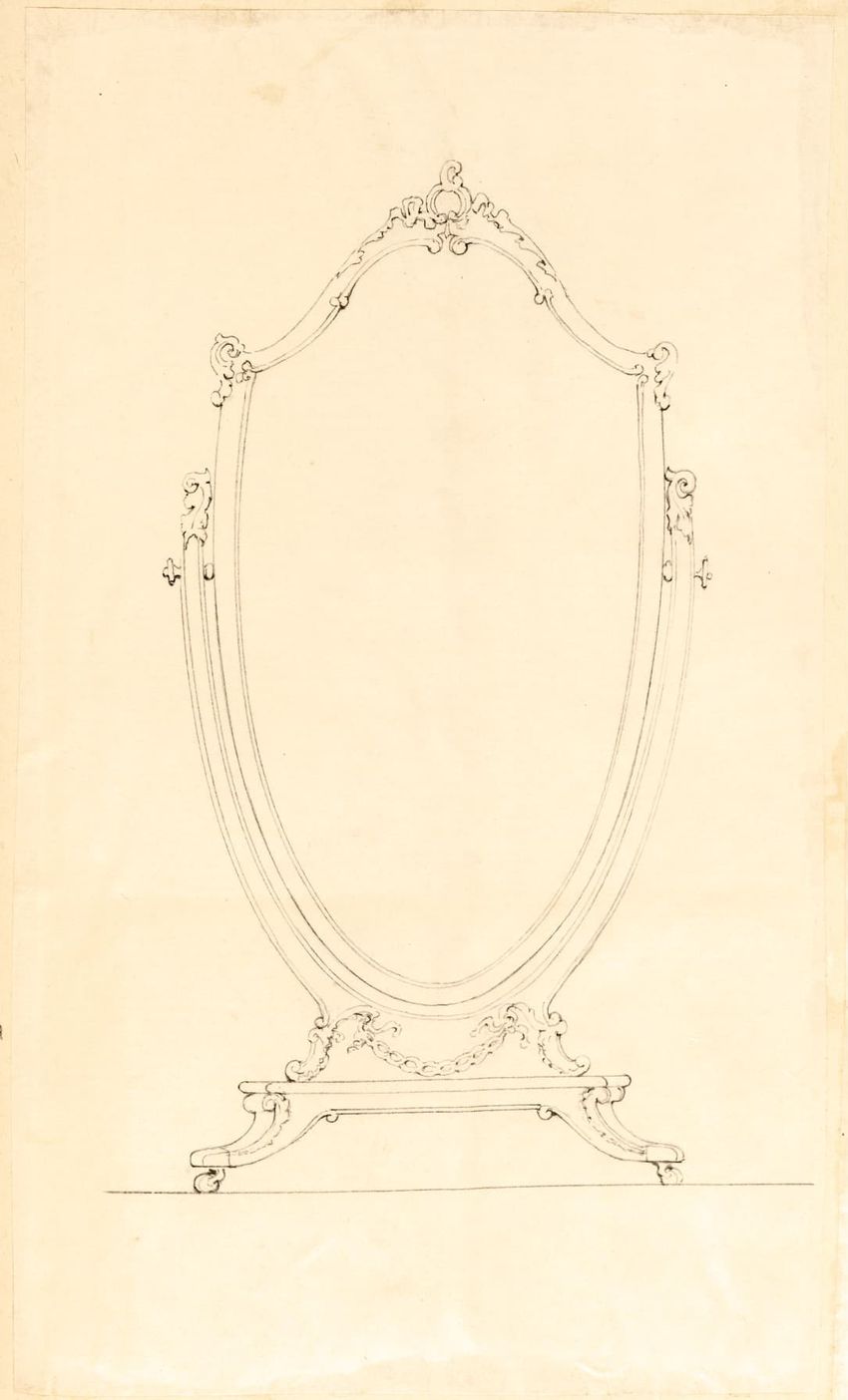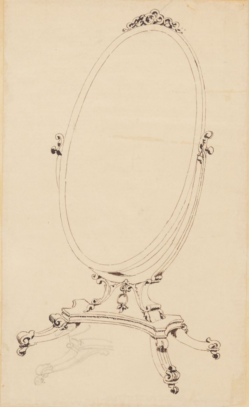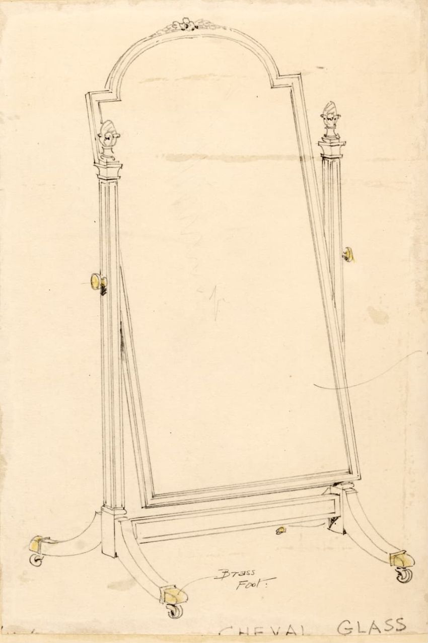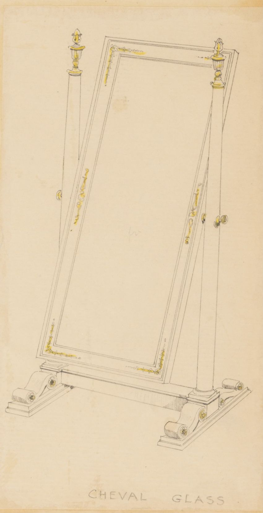 Design drawing titled "Dining Table" rendered in pencil on trace. Perspective view is shown. Round dining table has overhanging top; columnar reeded pedestal; cruciform base with concave sides; and large scrolled feet with carved rosettes on sides. Title, design notes, "172," "Mrs. J. B. Clark 48489...