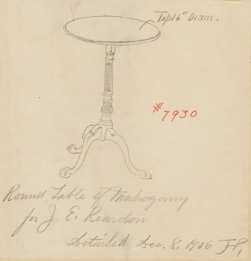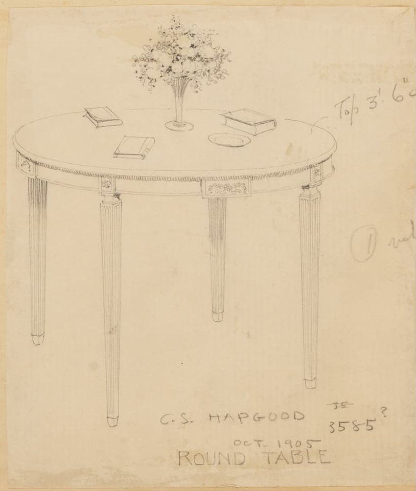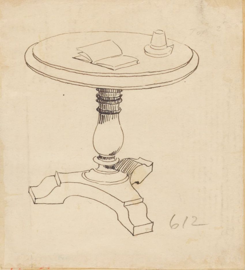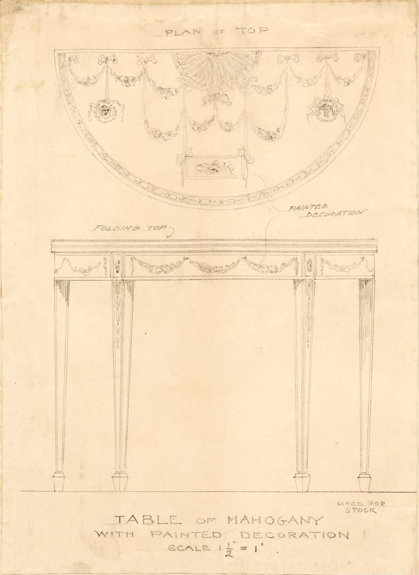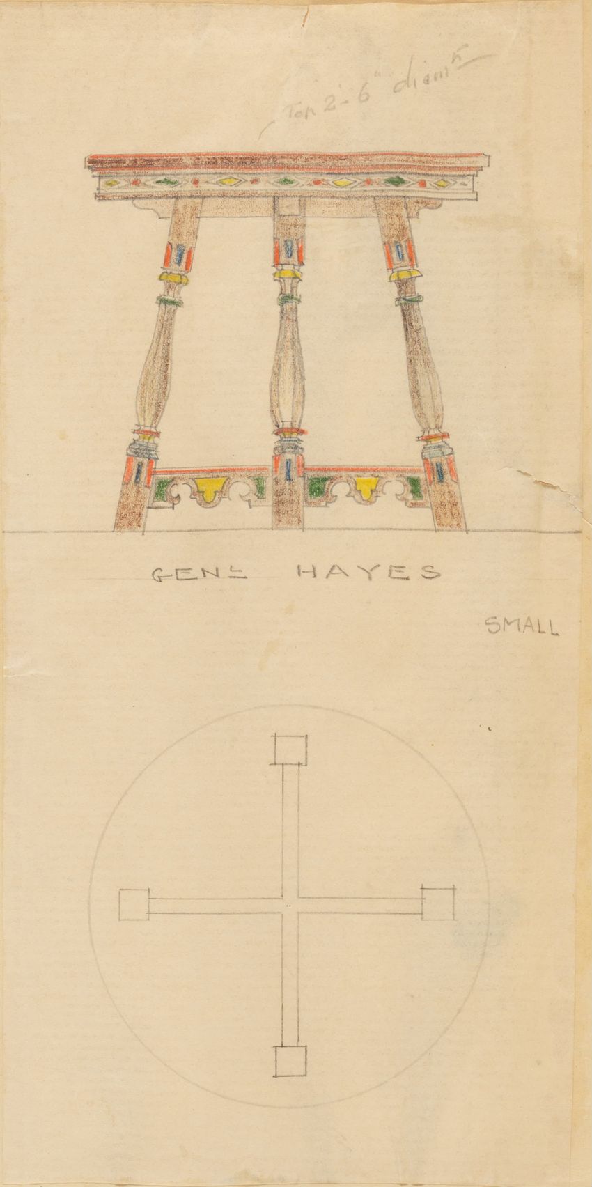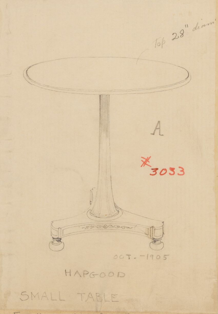 Design drawing titled "Small Table" rendered in pencil on trace. Perspective view is shown. Table has round top with molded edge; slender faceted columnar support that flares at bottom; flat tripod base with inlaid or painted stringing and floral motifs; and bun feet. Title, design notes, "Hapgood,"...