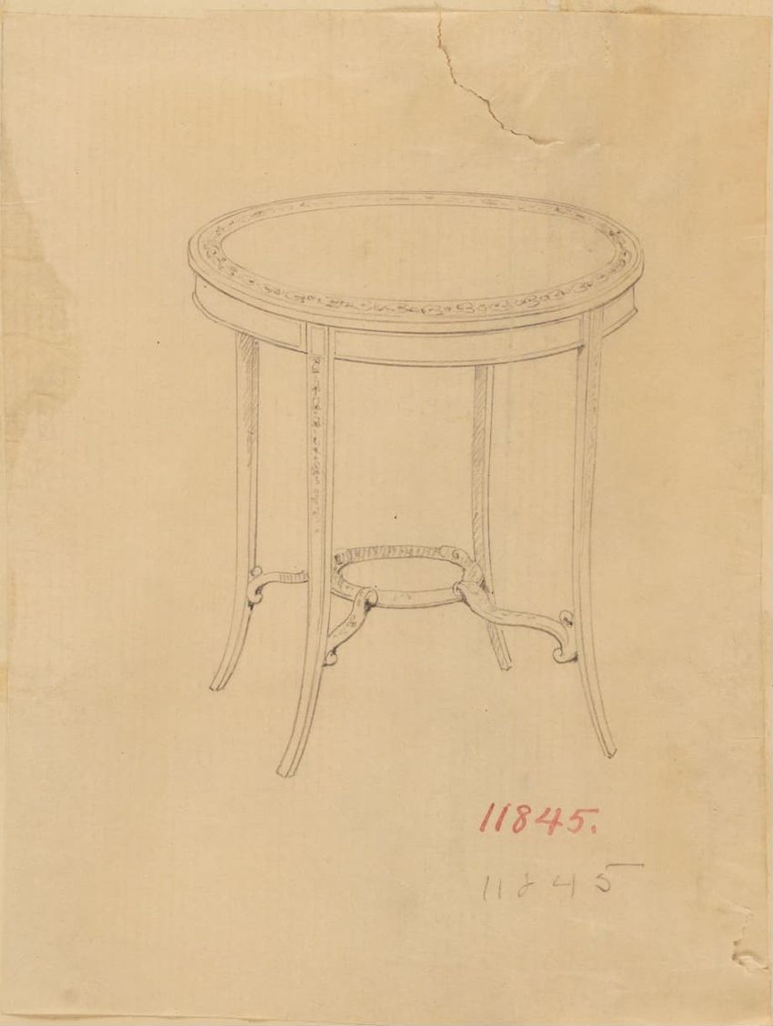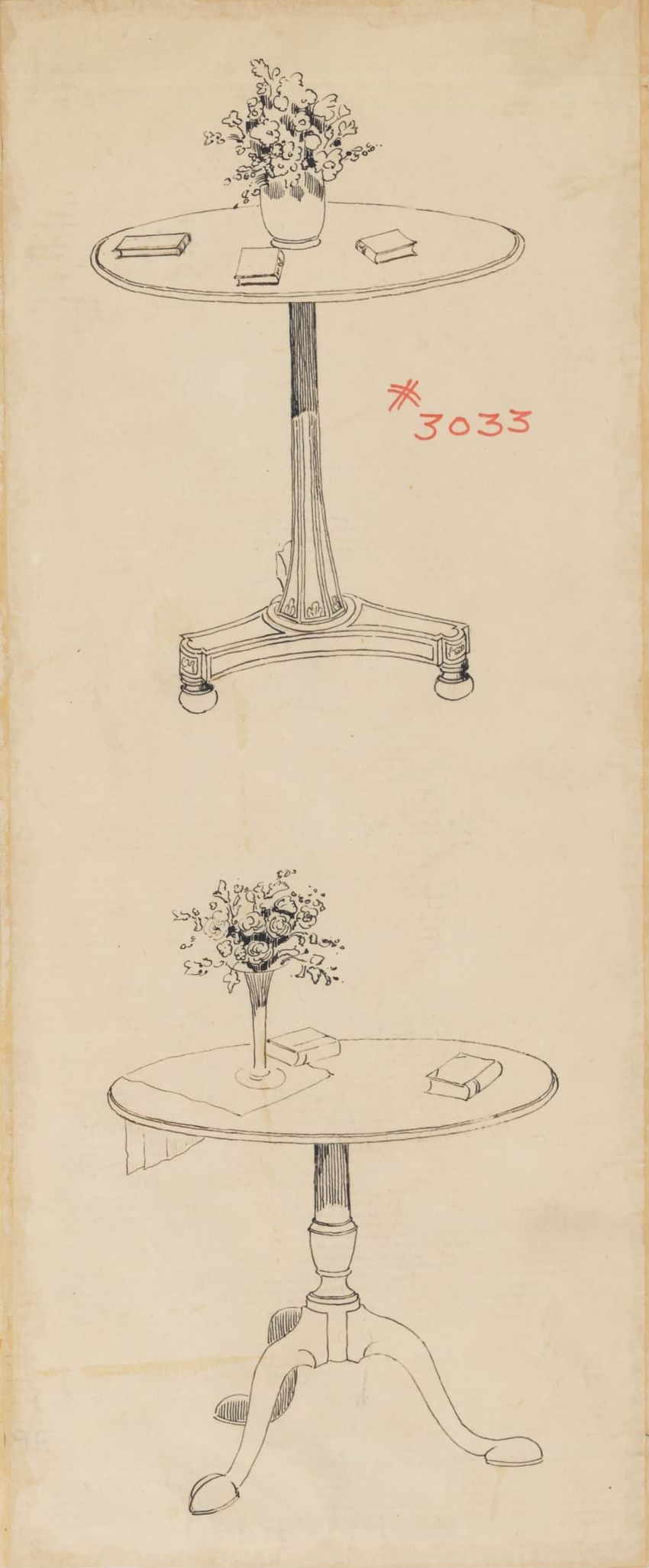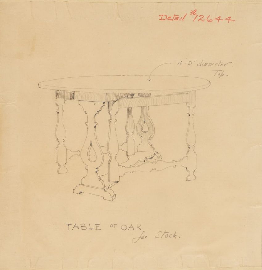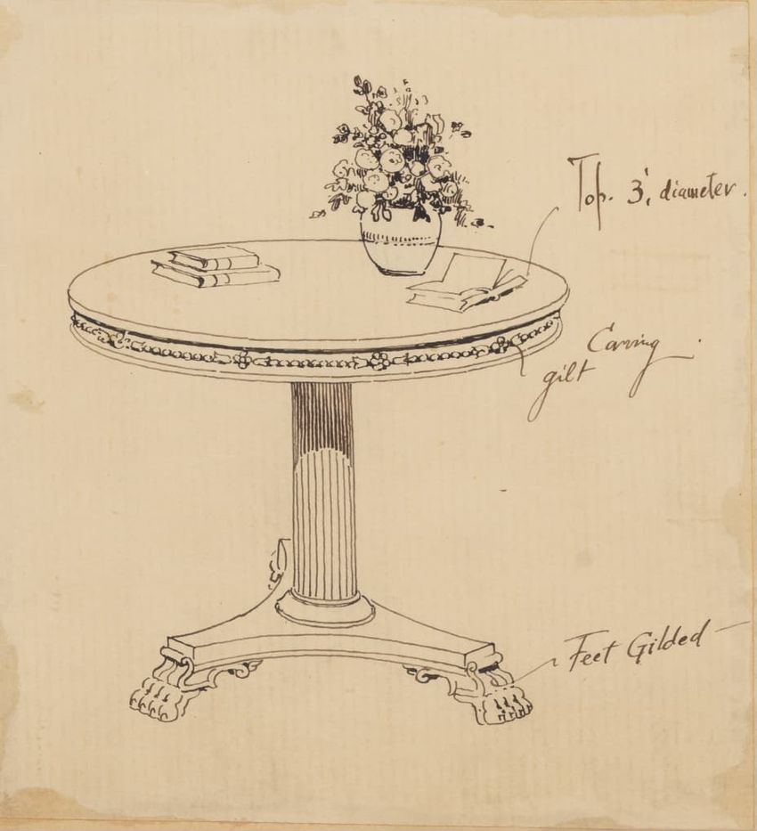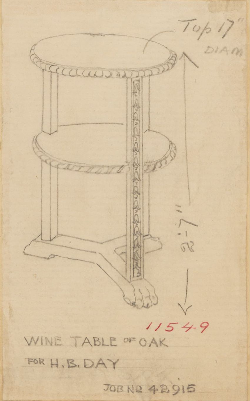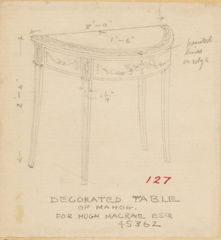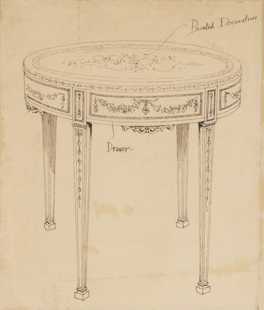 Design drawing titled "Small Table" rendered in pencil on trace. Perspective view is shown. Table has round top with molded edge; slender faceted columnar support that flares at bottom; flat tripod base with inlaid or painted stringing and floral motifs; and bun feet. Title, design notes, "Hapgood,"...