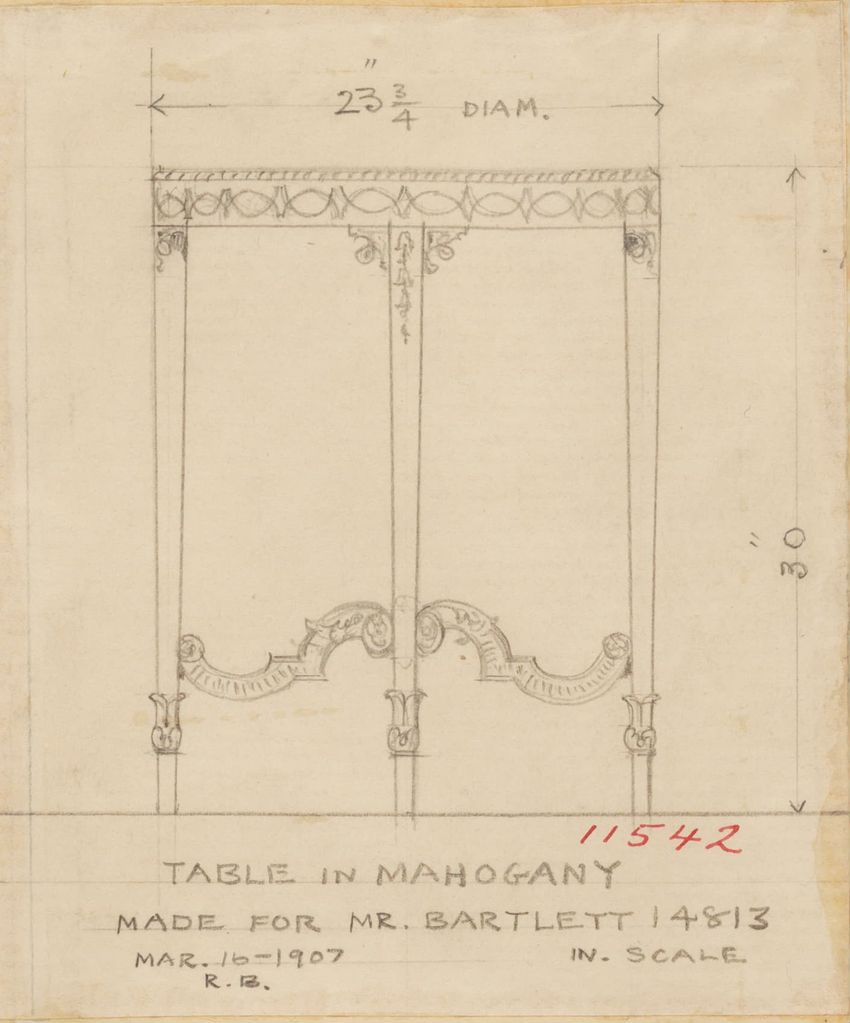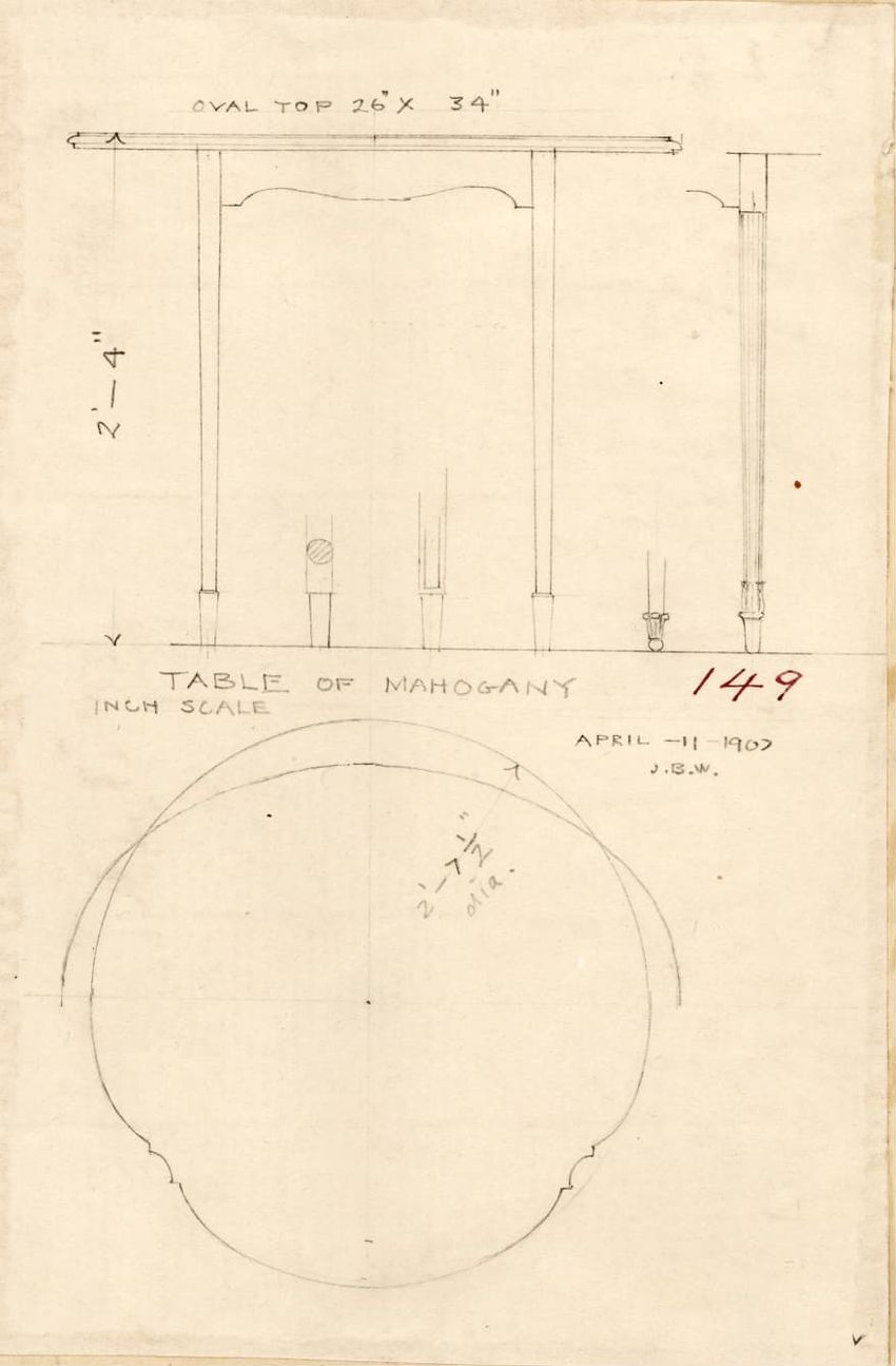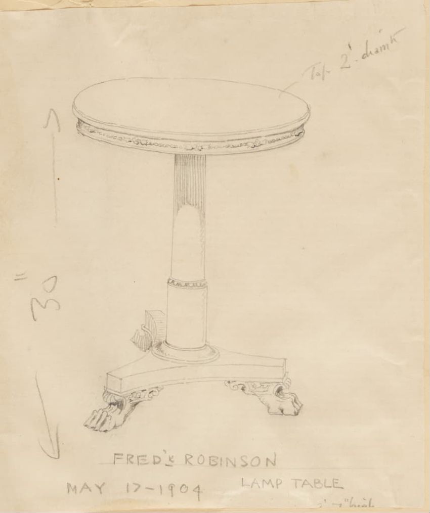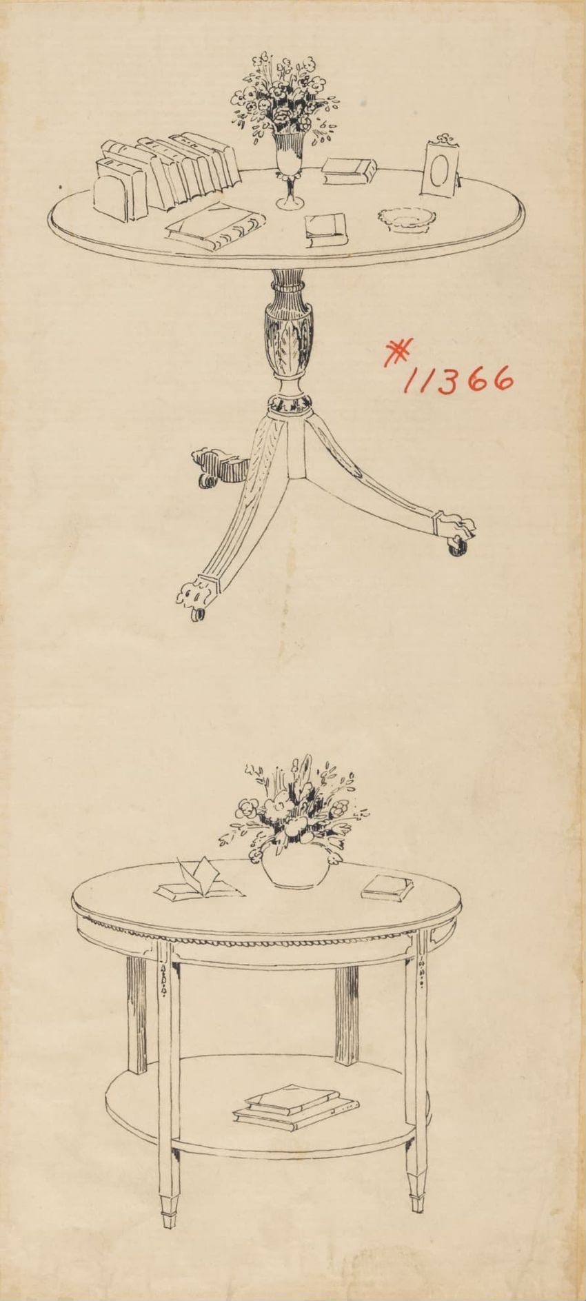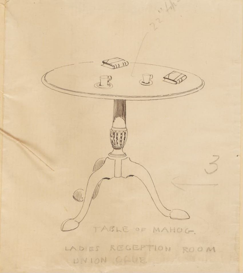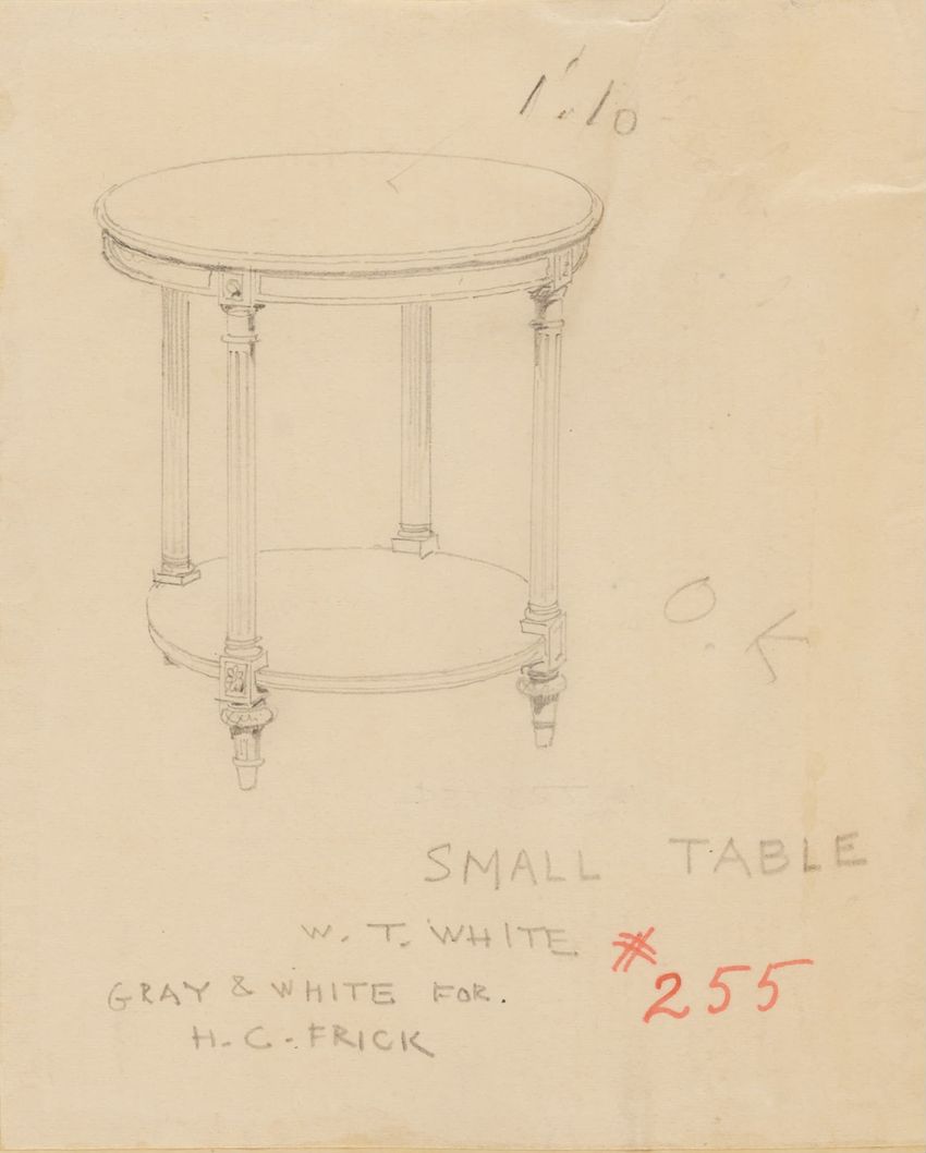 Design drawing titled "Small Table" rendered in pencil on trace. Perspective view is shown. Table has round top with molded edge; slender faceted columnar support that flares at bottom; flat tripod base with inlaid or painted stringing and floral motifs; and bun feet. Title, design notes, "Hapgood,"...