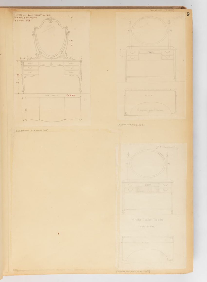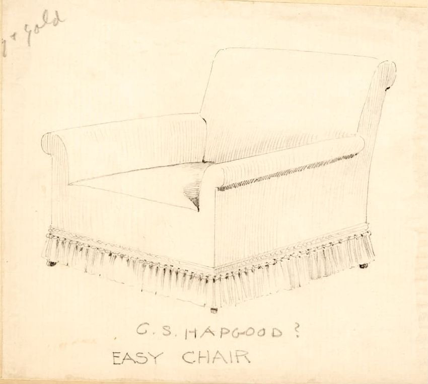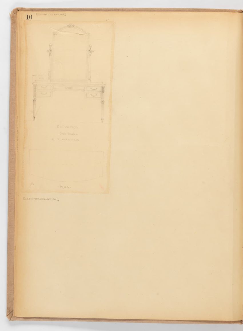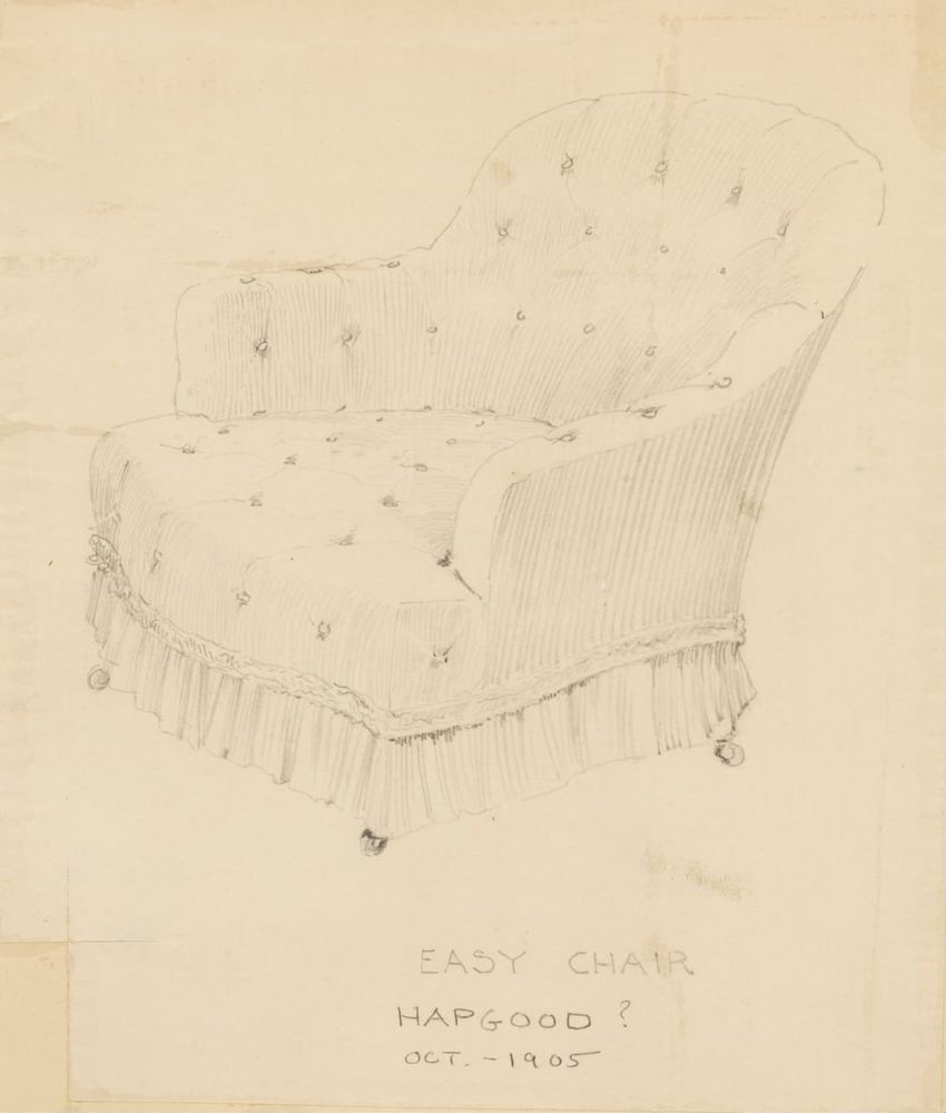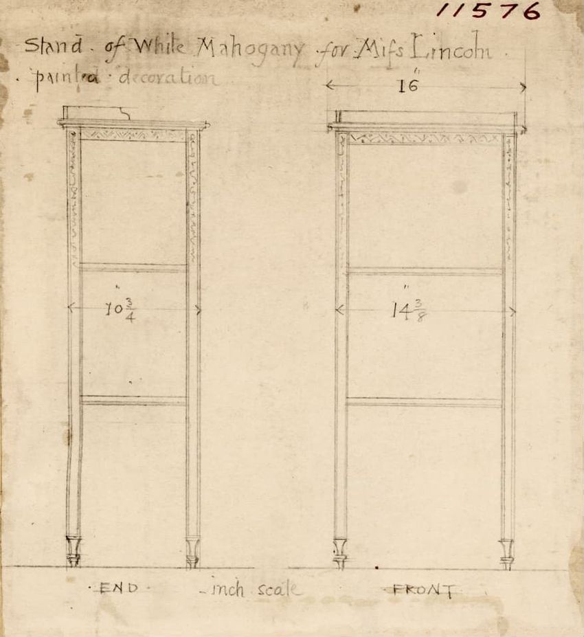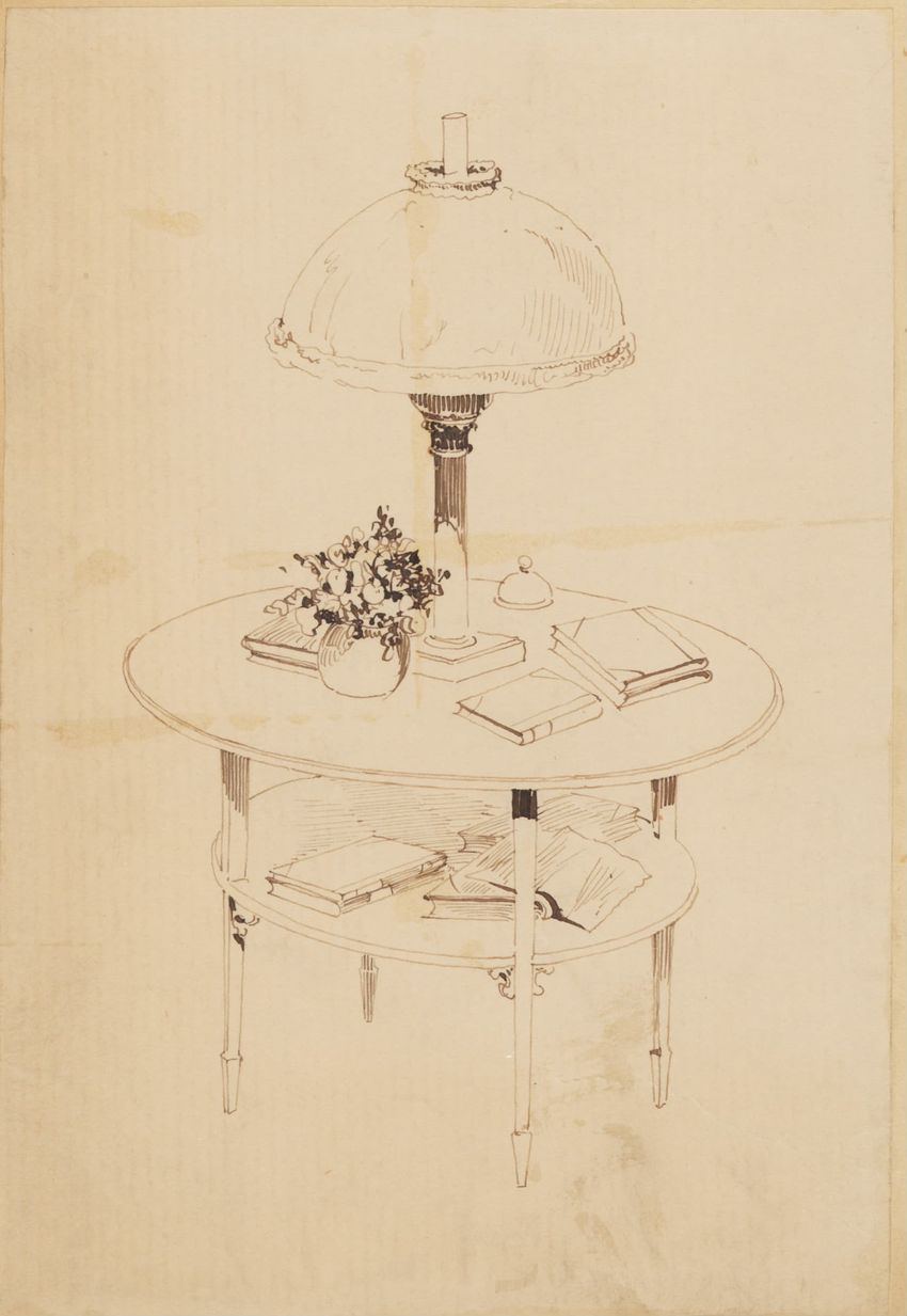 Design drawing titled "Small Table" rendered in pencil on trace. Perspective view is shown. Table has round top with molded edge; slender faceted columnar support that flares at bottom; flat tripod base with inlaid or painted stringing and floral motifs; and bun feet. Title, design notes, "Hapgood,"...