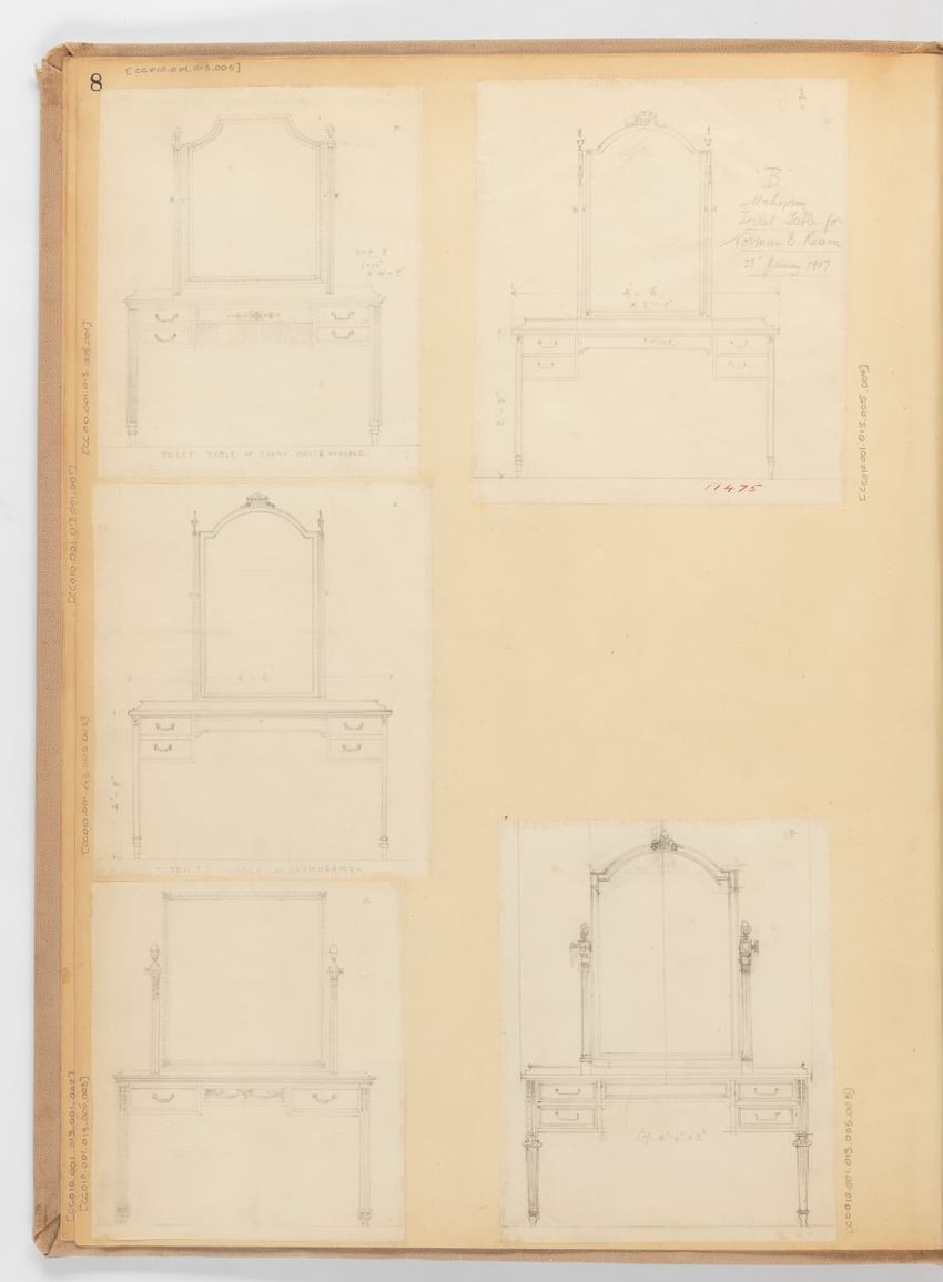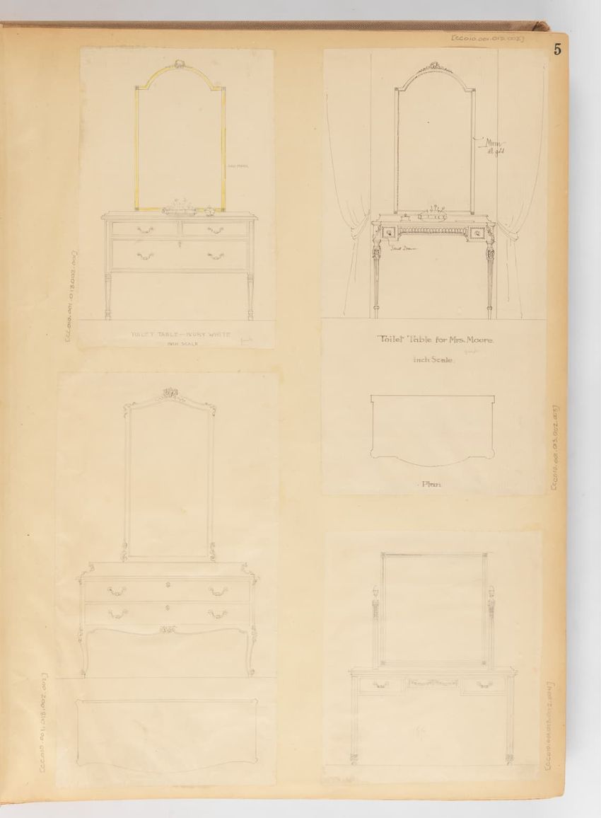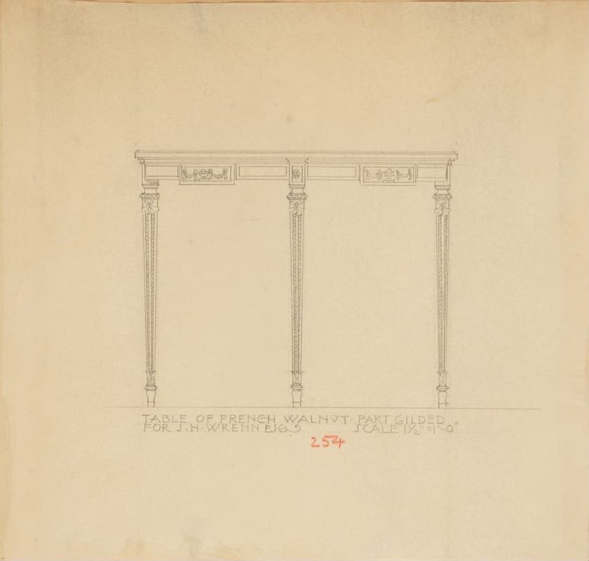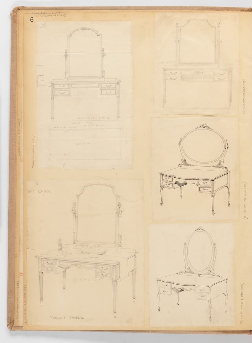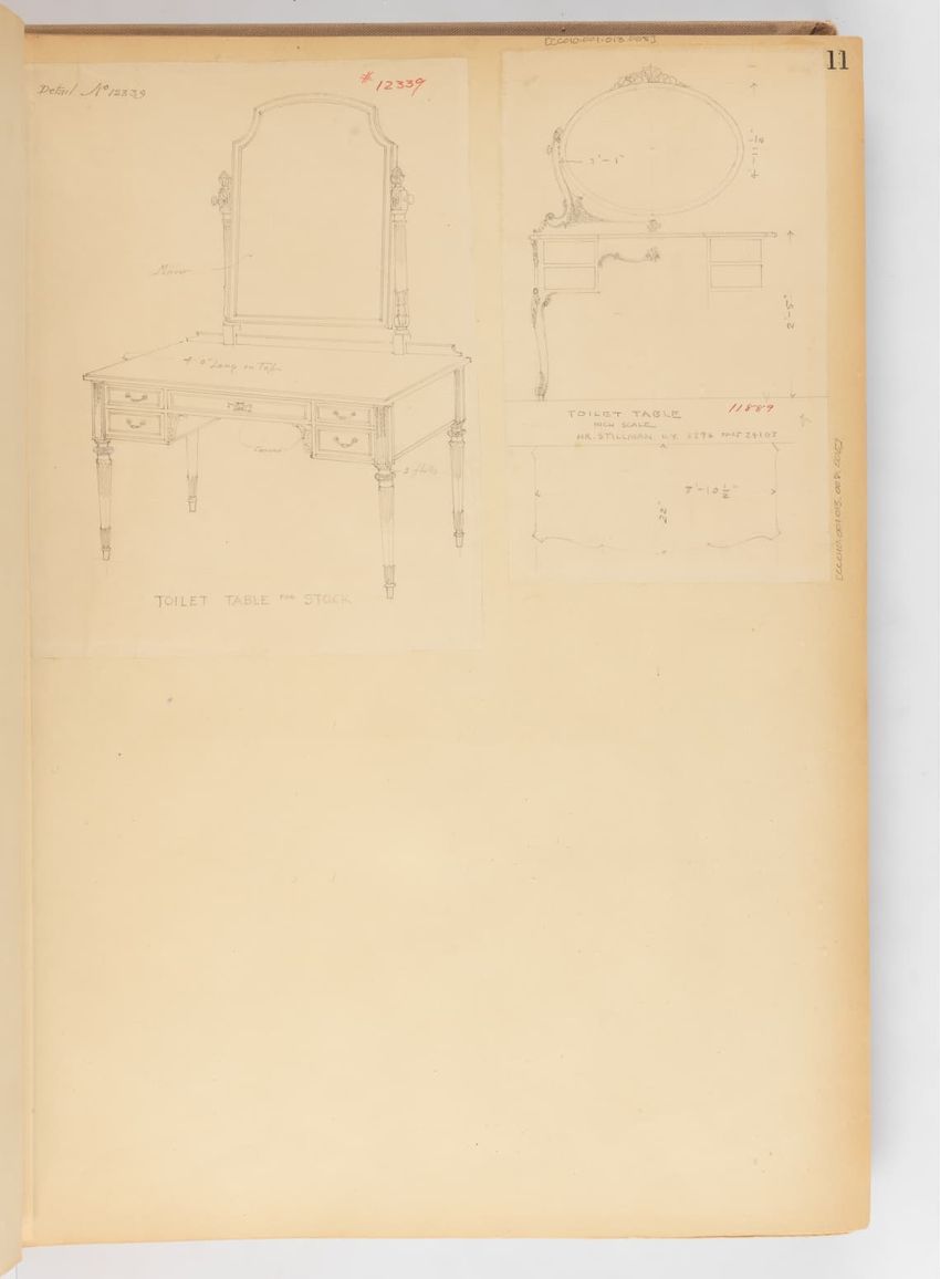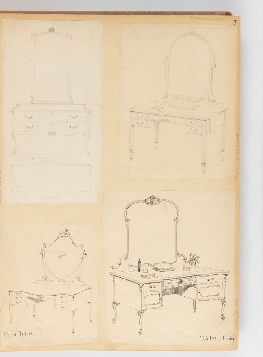 Design drawing titled "Small Table" rendered in pencil on trace. Perspective view is shown. Table has round top with molded edge; slender faceted columnar support that flares at bottom; flat tripod base with inlaid or painted stringing and floral motifs; and bun feet. Title, design notes, "Hapgood,"...