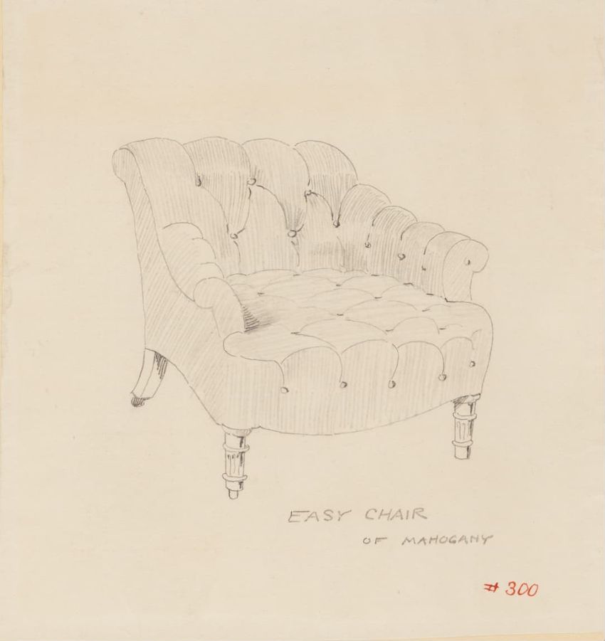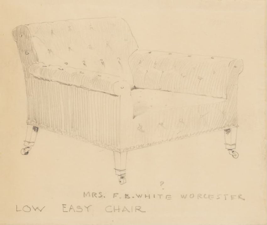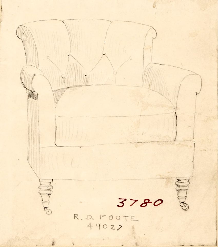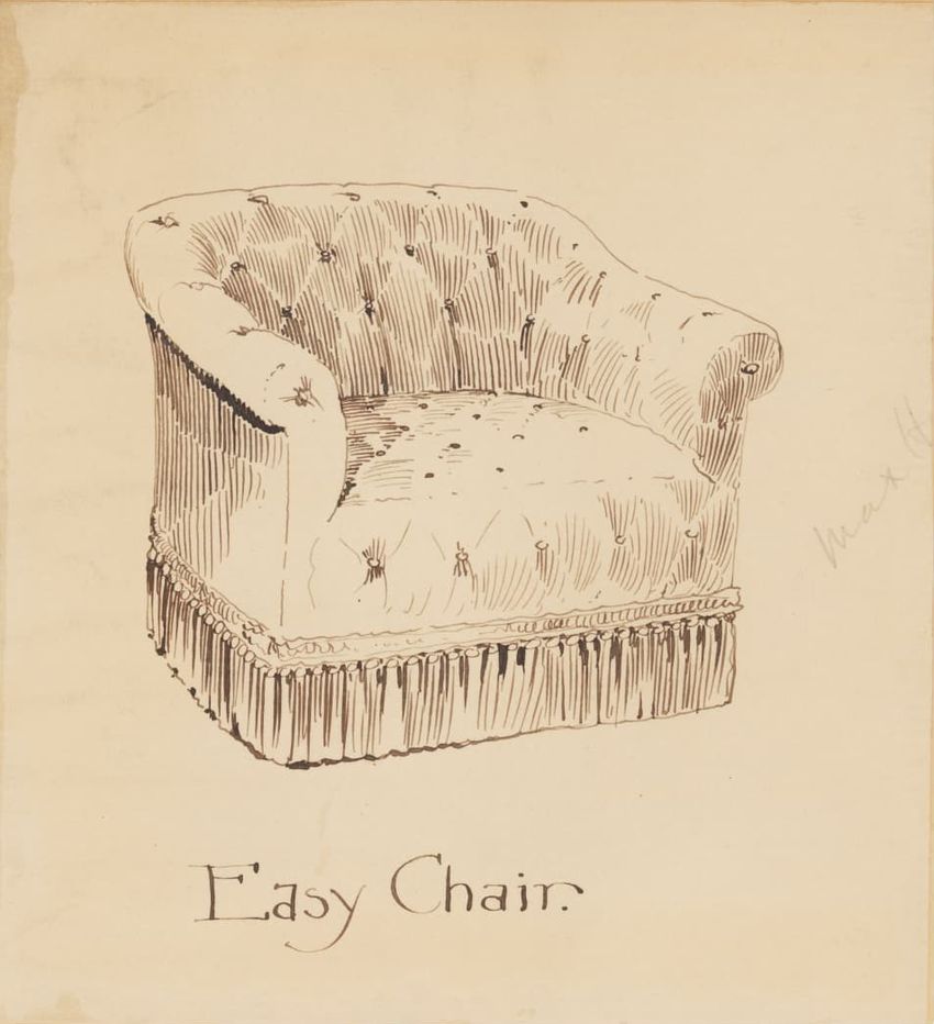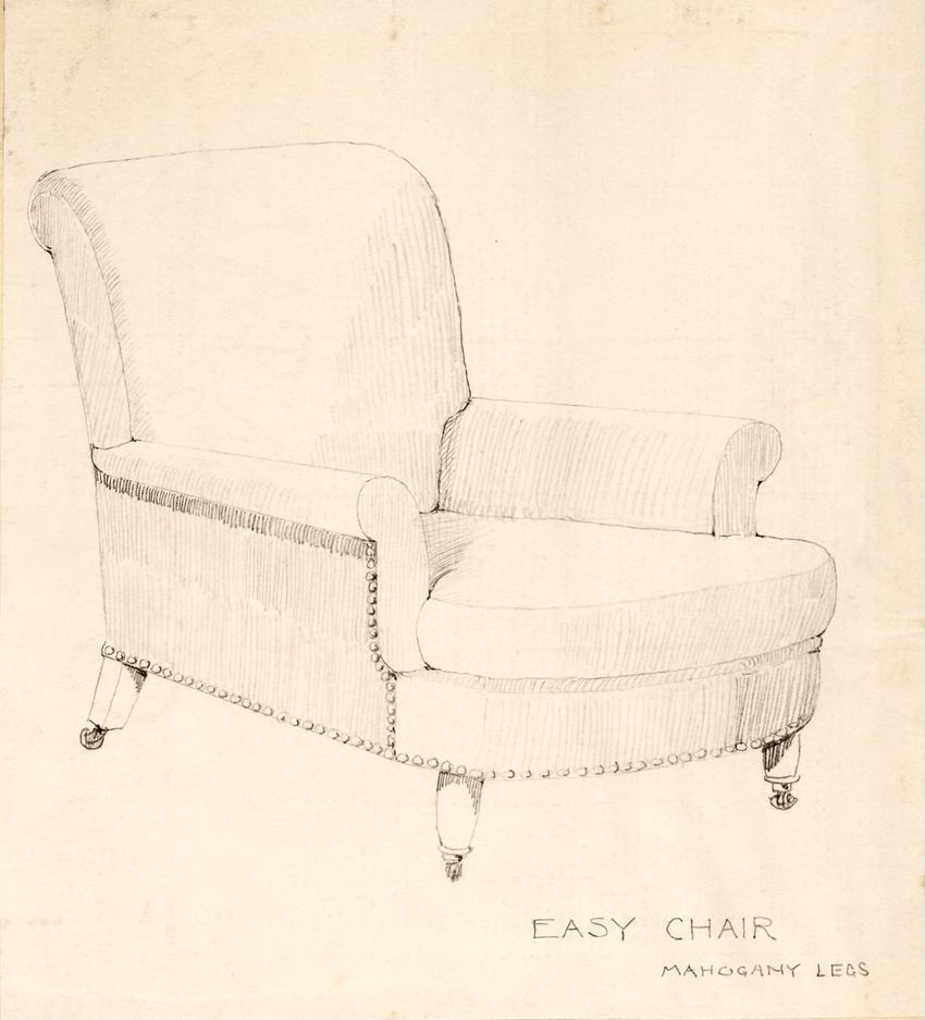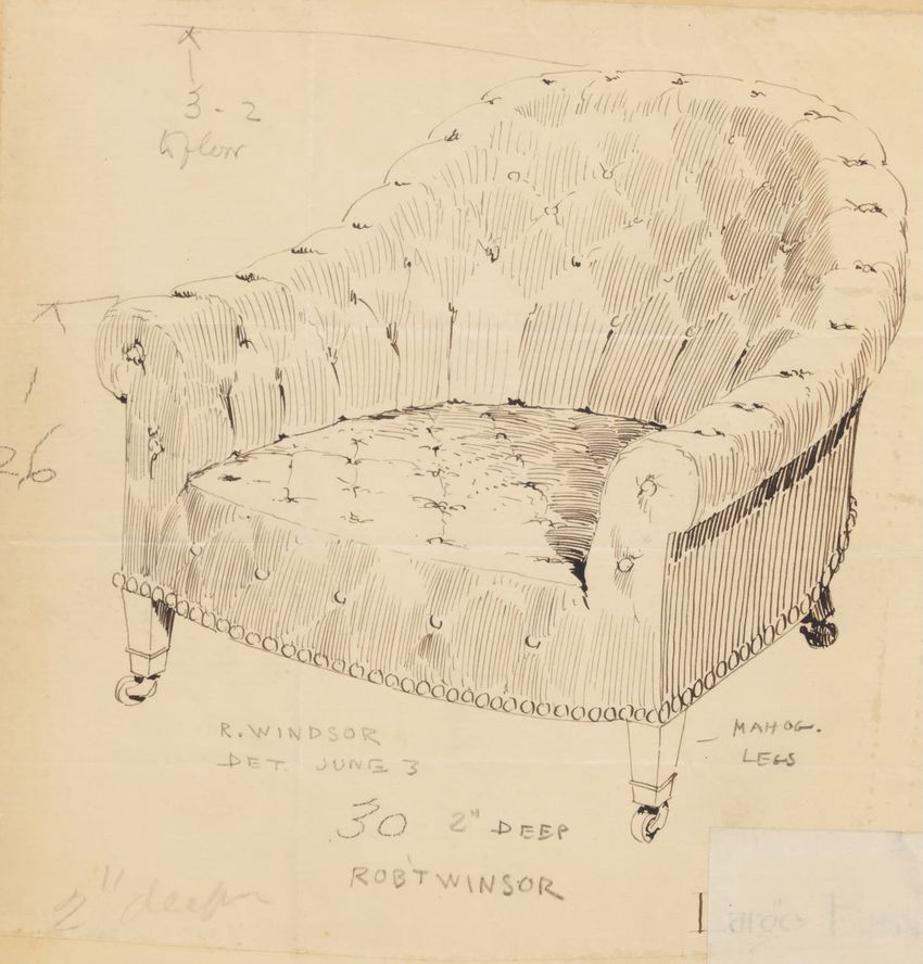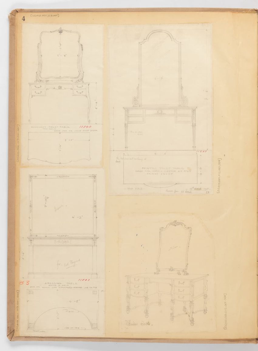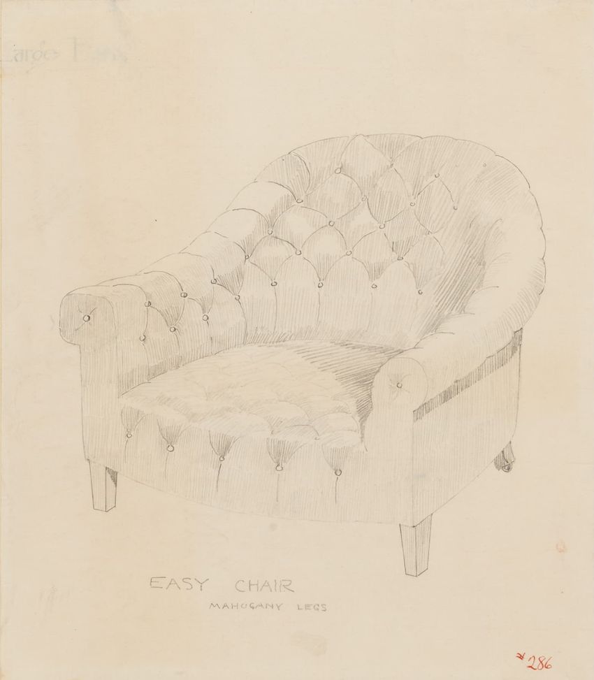 Design drawing titled "Small Table" rendered in pencil on trace. Perspective view is shown. Table has round top with molded edge; slender faceted columnar support that flares at bottom; flat tripod base with inlaid or painted stringing and floral motifs; and bun feet. Title, design notes, "Hapgood,"...