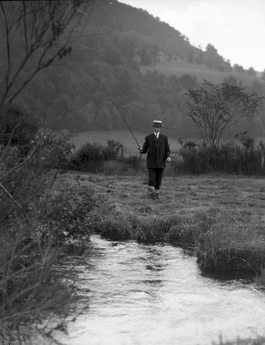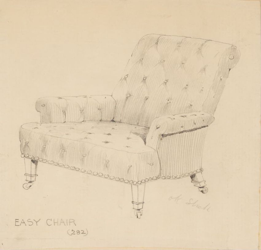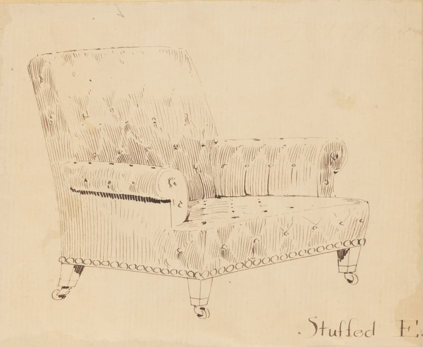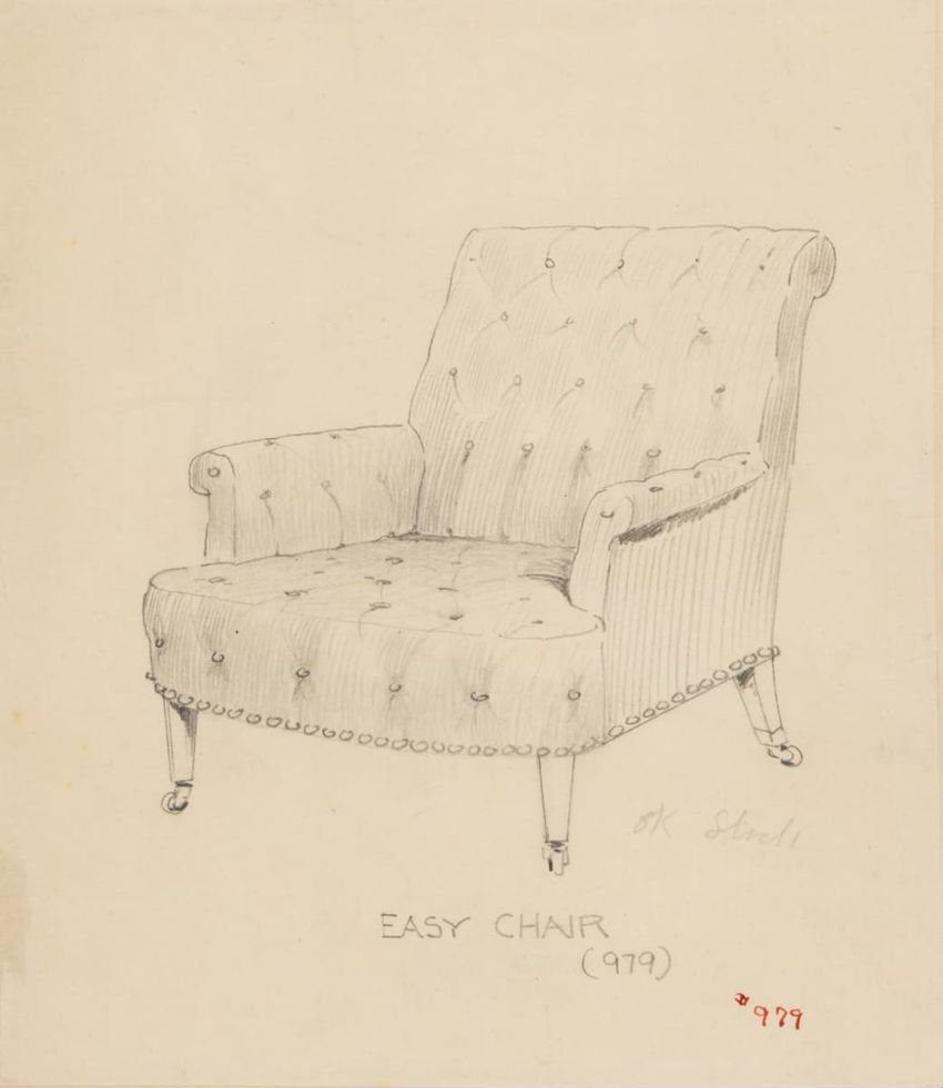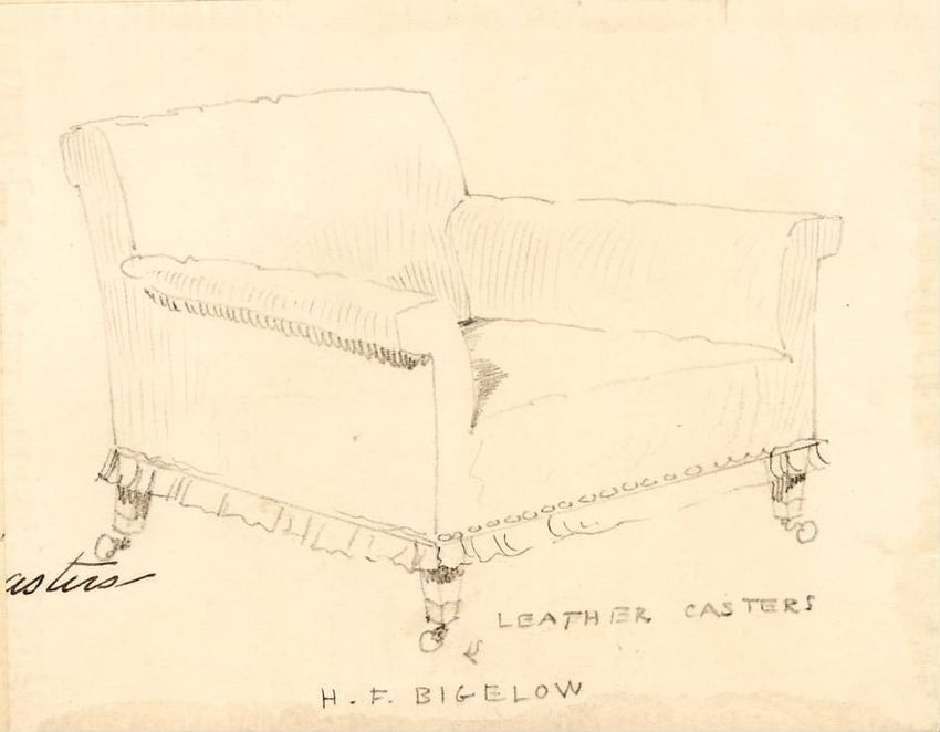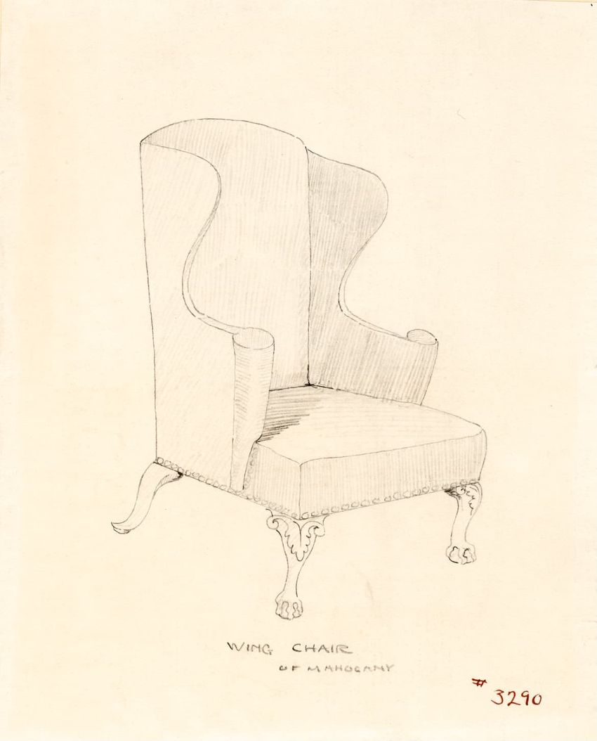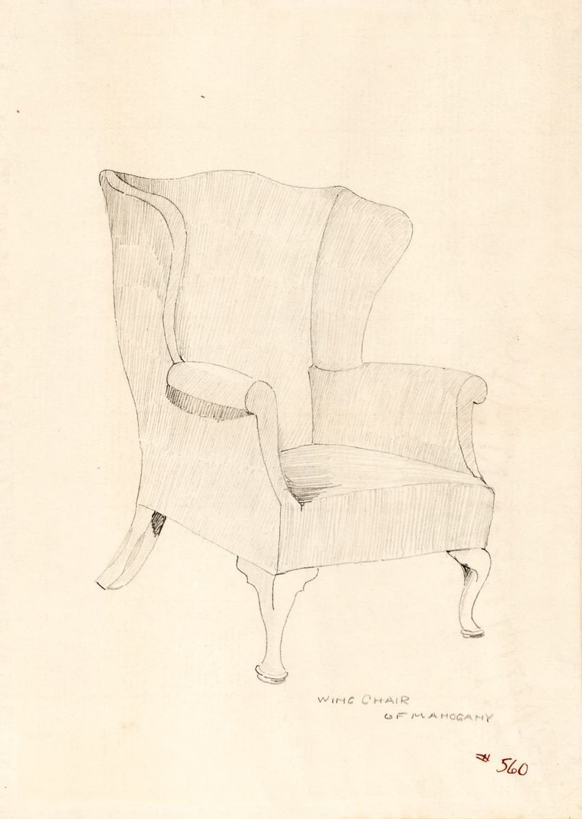 Design drawing titled "Small Table" rendered in pencil on trace. Perspective view is shown. Table has round top with molded edge; slender faceted columnar support that flares at bottom; flat tripod base with inlaid or painted stringing and floral motifs; and bun feet. Title, design notes, "Hapgood,"...