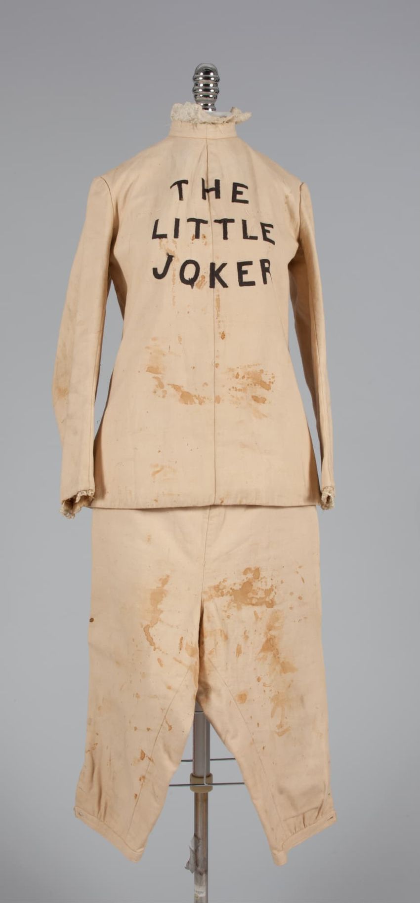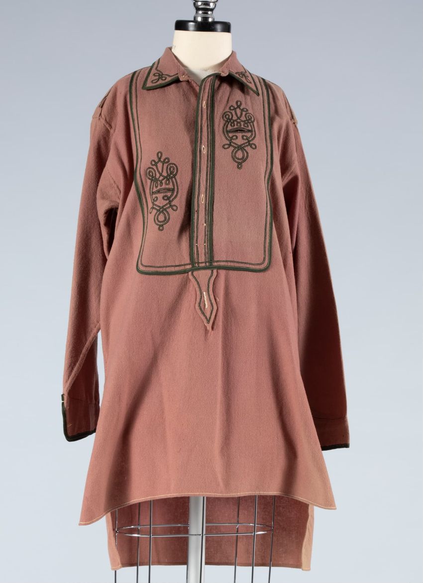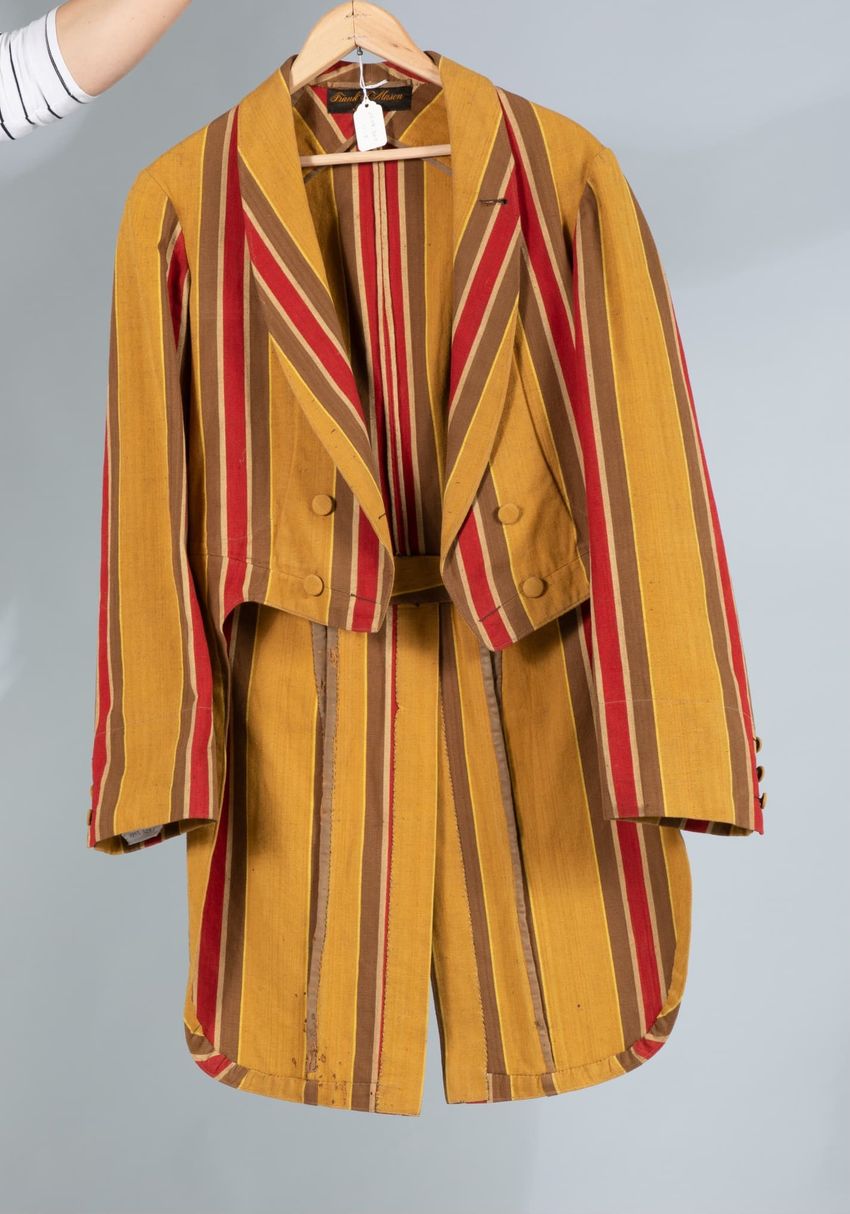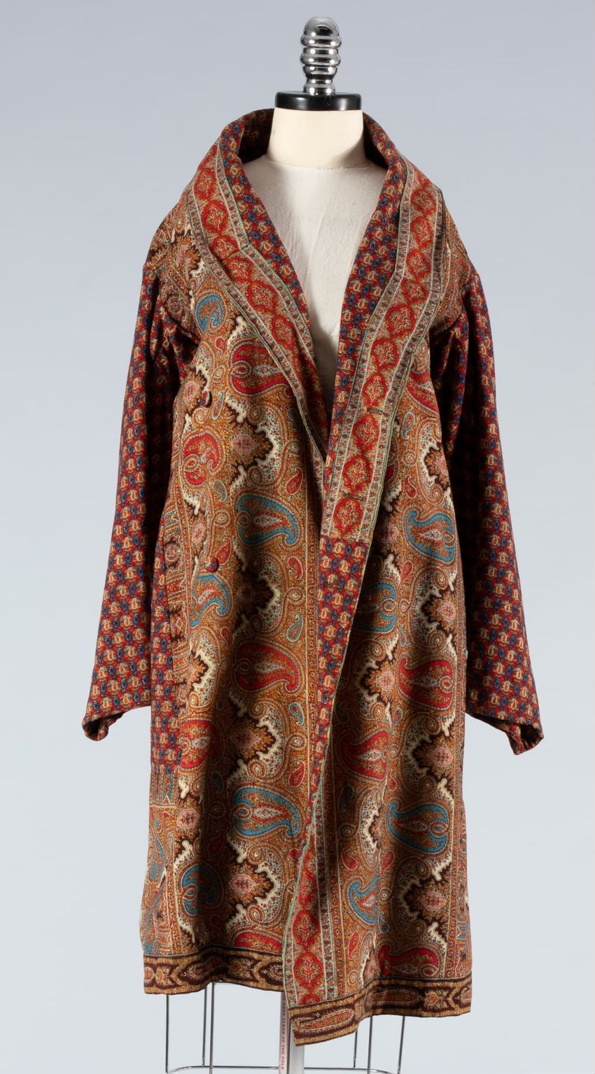Two printed paisley's on wool; 1st white ground large scale print in red, brown, and blue; 2nd red ground with small repeating pattern in green, blue, and orange. Shawl collar, front panels and hem in 1st pattern, faced with 2nd pattern; double breasted; sleeves and body in 2nd pattern; fully line...