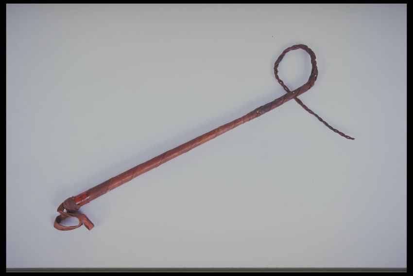 Small maple hinged box containing repousse tools. Brass pinch-opening in front. Orange label inside lid. Contents include: hammer, eleven iron spikes used for stamps, asst. screws and washers, one pattern, letter of instruction, 2 receipts, copper pegs. Unfinished box.
