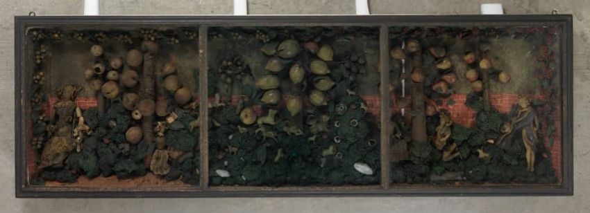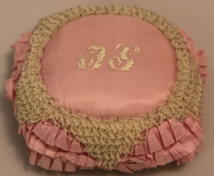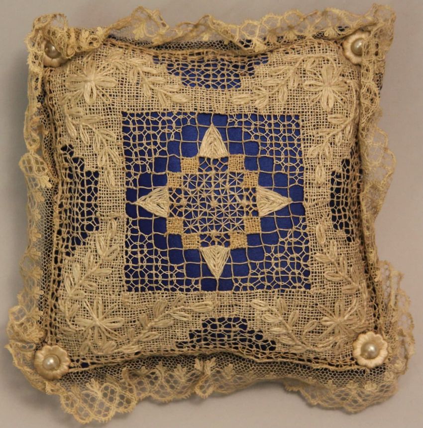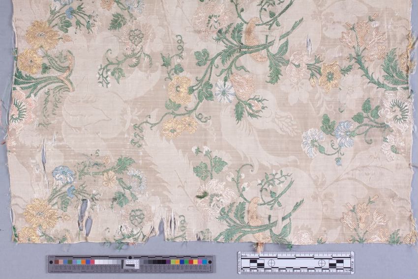 appliqué (technique), felt (textile), glazing (coating), linen (material), silk (textile), textiles, wool (textile), tin (metal)