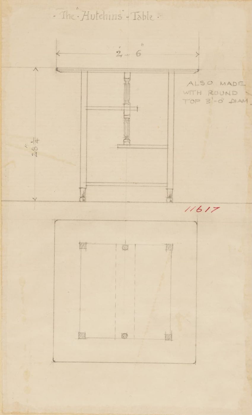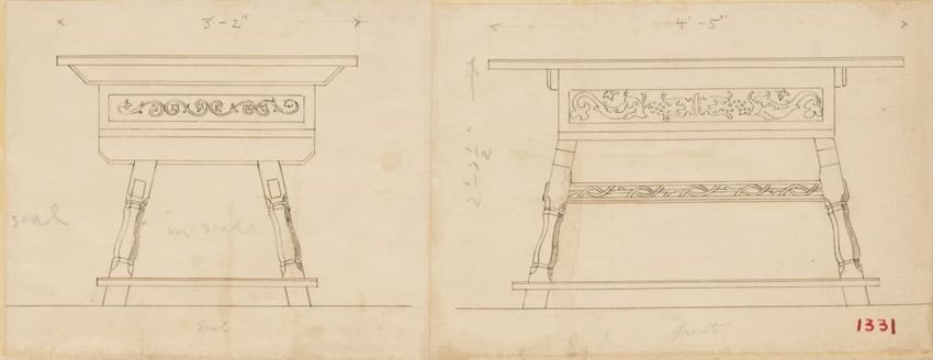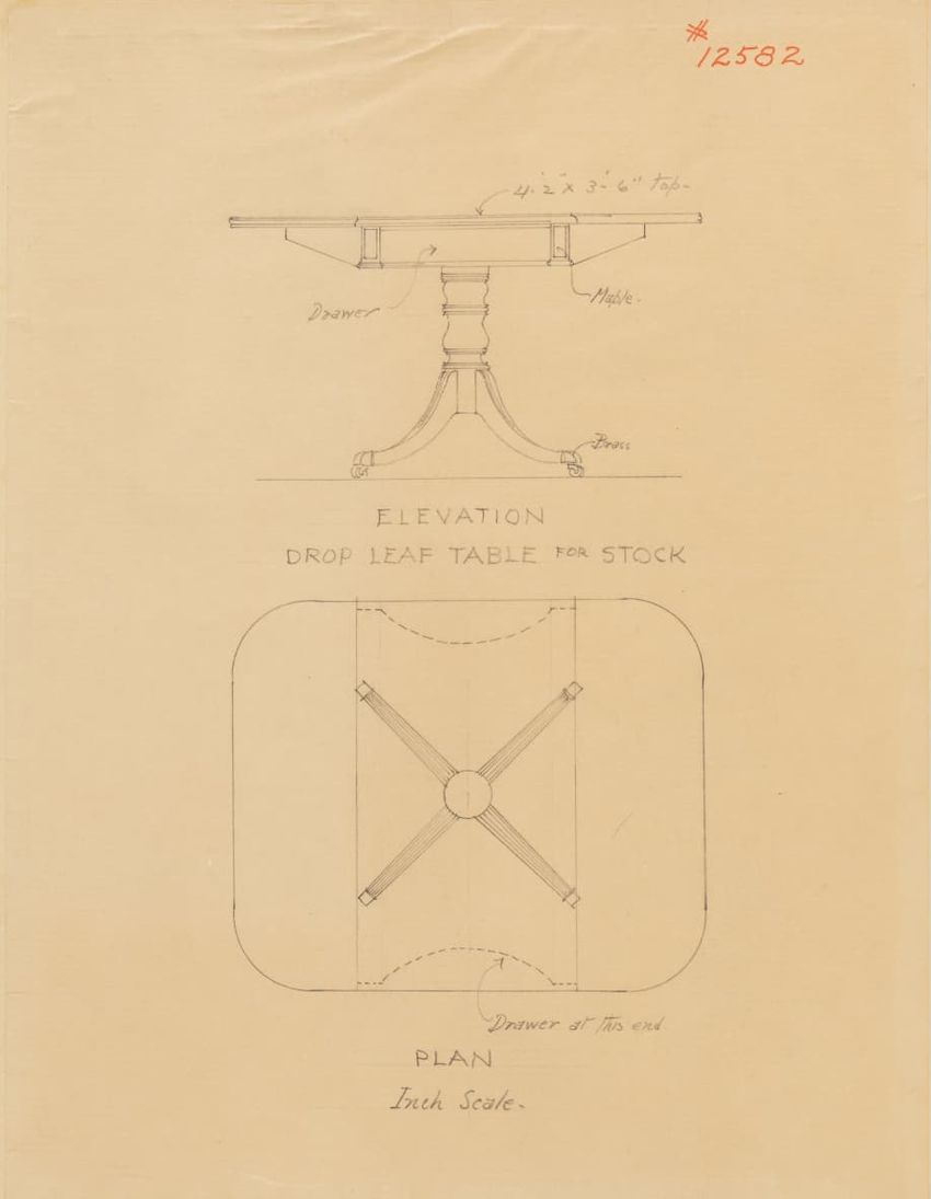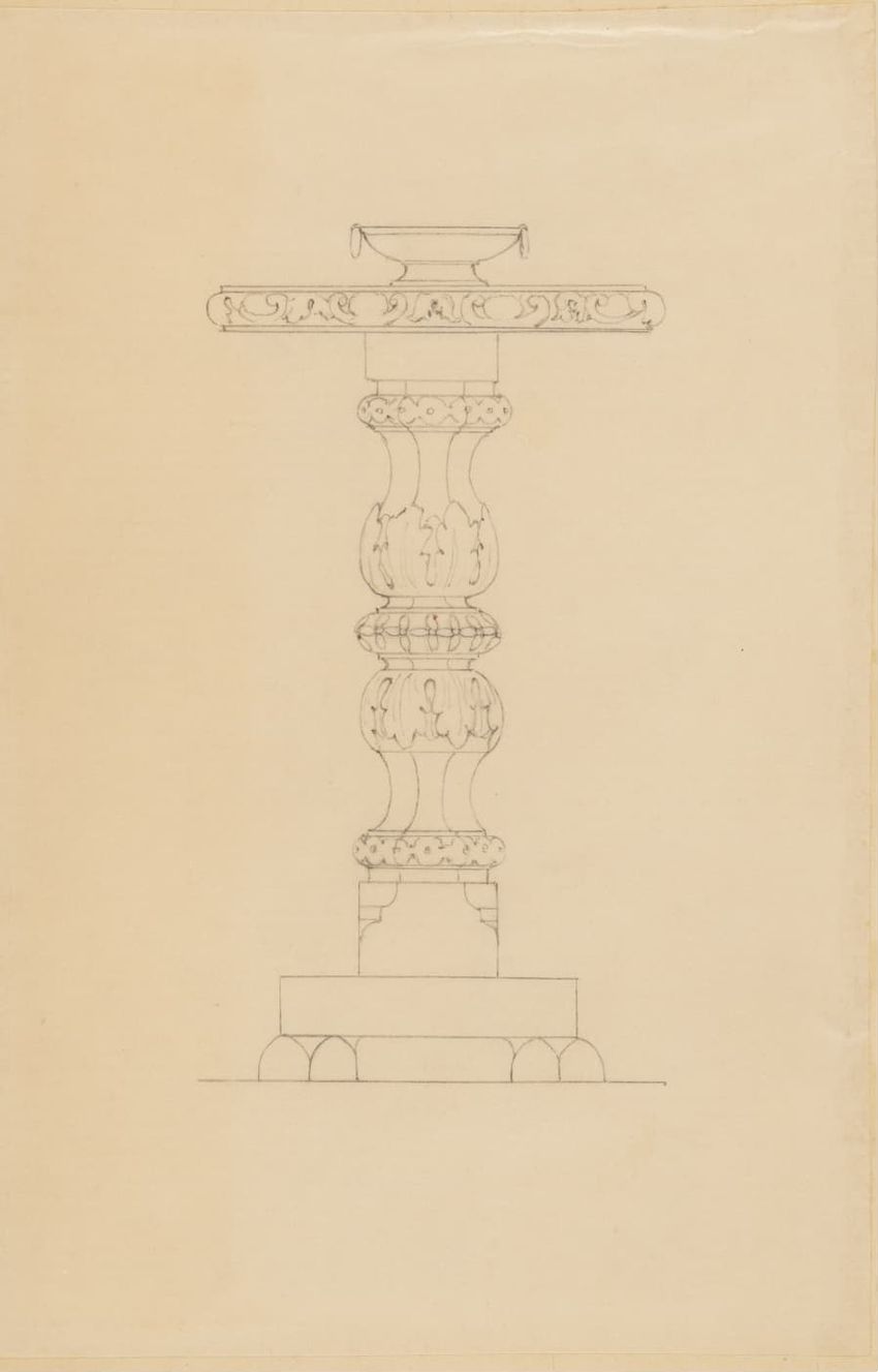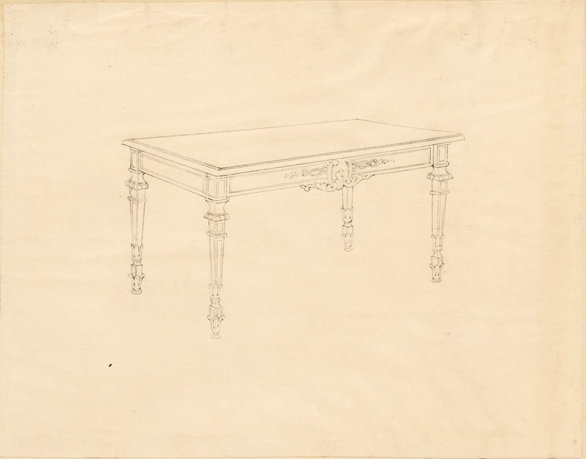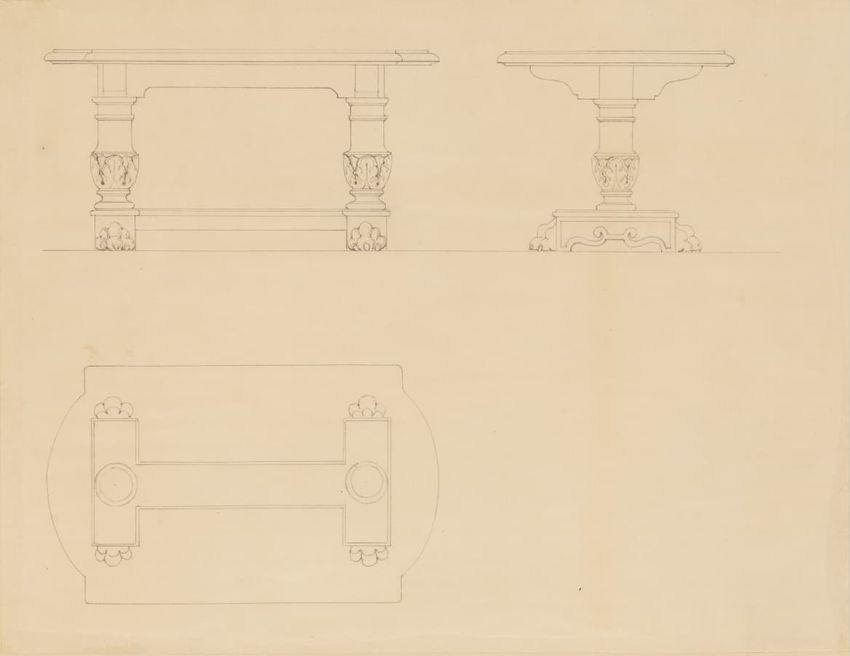 Untitled design drawing rendered in pencil on trace. Front view is shown; plan of top is also provided. Renaissance Revival-style table has square top with carved sides; pedestal support with block, ovoid and vasiform turnings; elaborate carving on pedestal including fluting, rosettes, trefoils, ac...