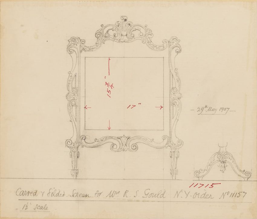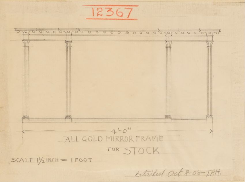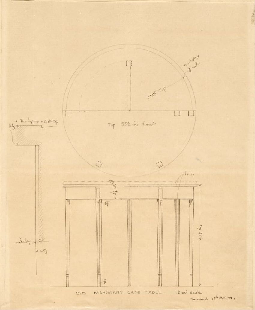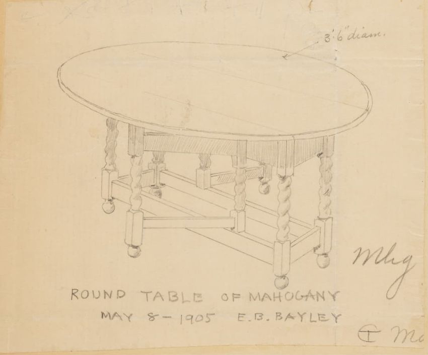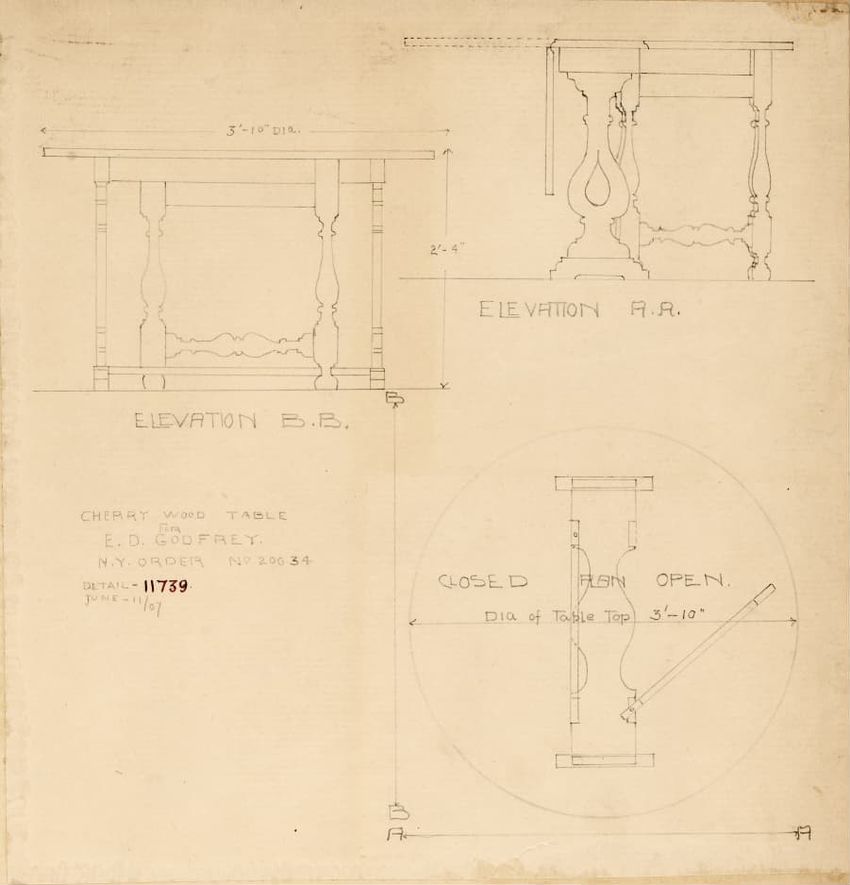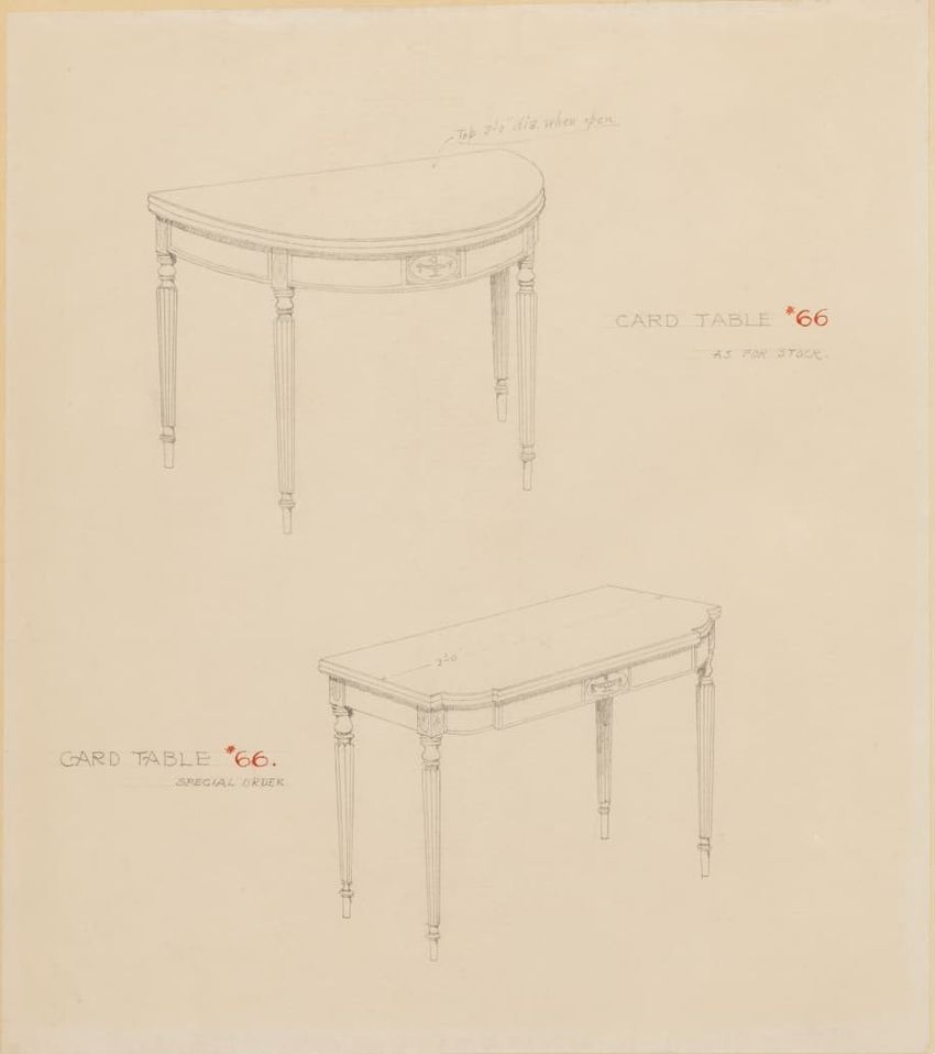 Untitled design drawing rendered in pencil on trace. Front view is shown; plan of top is also provided. Renaissance Revival-style table has square top with carved sides; pedestal support with block, ovoid and vasiform turnings; elaborate carving on pedestal including fluting, rosettes, trefoils, ac...