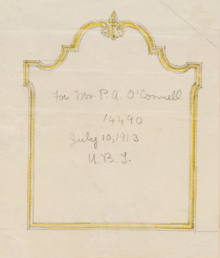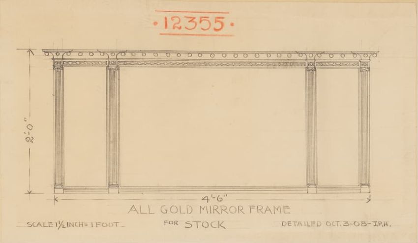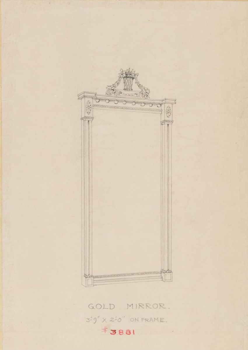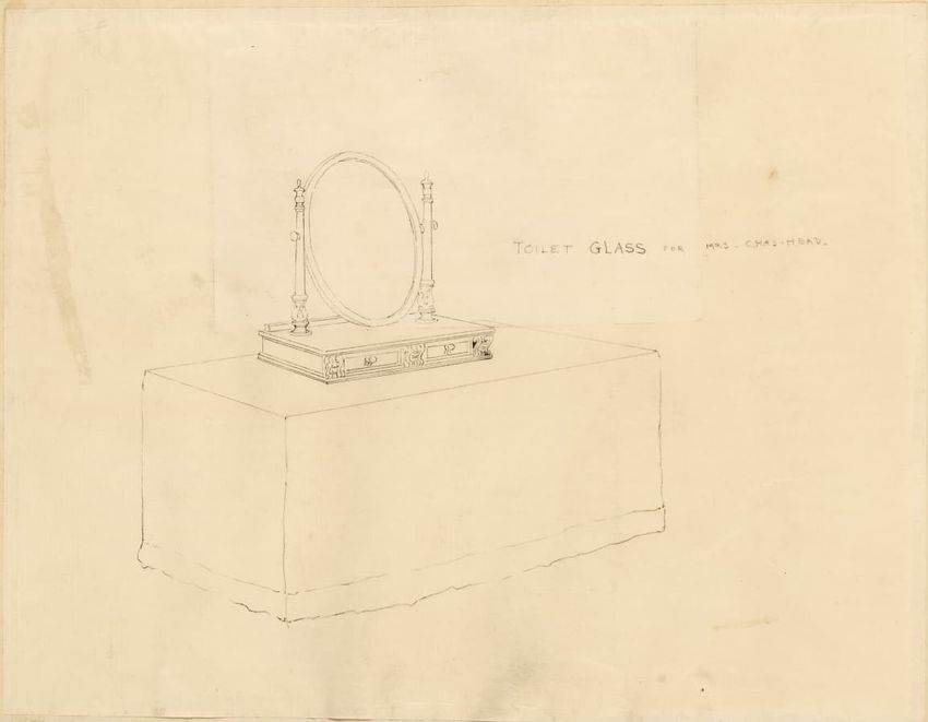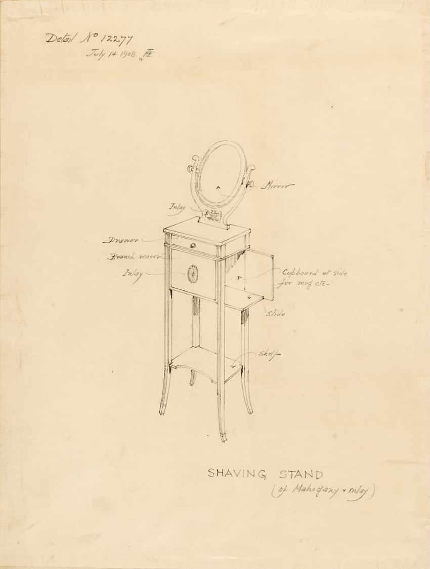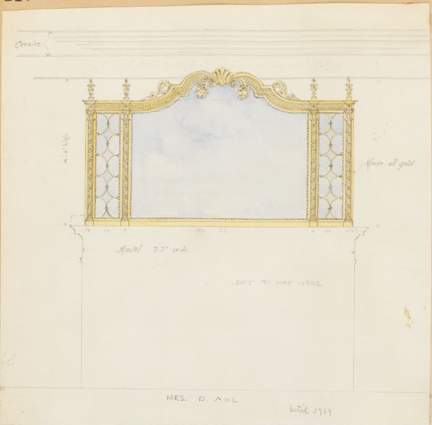 Untitled design drawing rendered in pencil on trace. Front view is shown; plan of top is also provided. Renaissance Revival-style table has square top with carved sides; pedestal support with block, ovoid and vasiform turnings; elaborate carving on pedestal including fluting, rosettes, trefoils, ac...