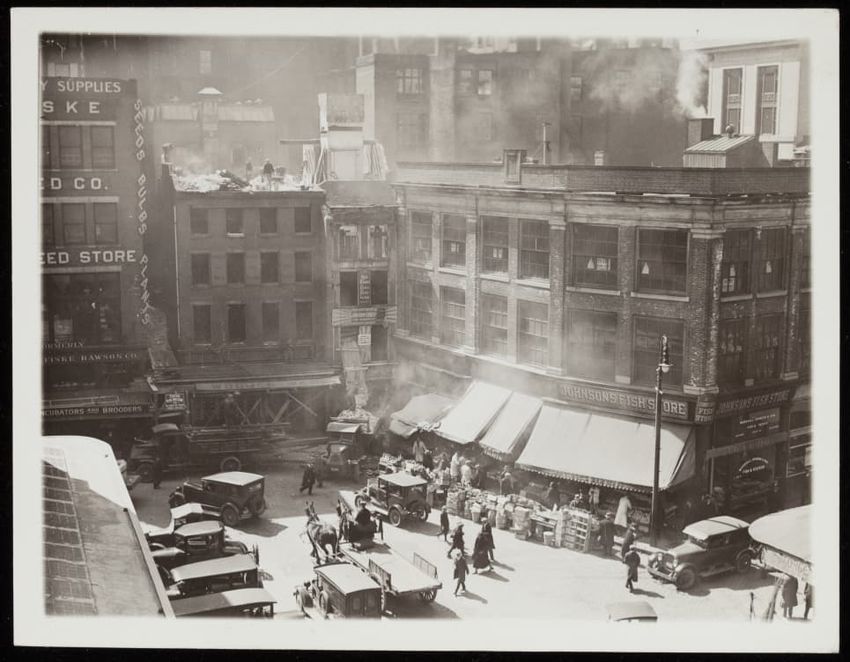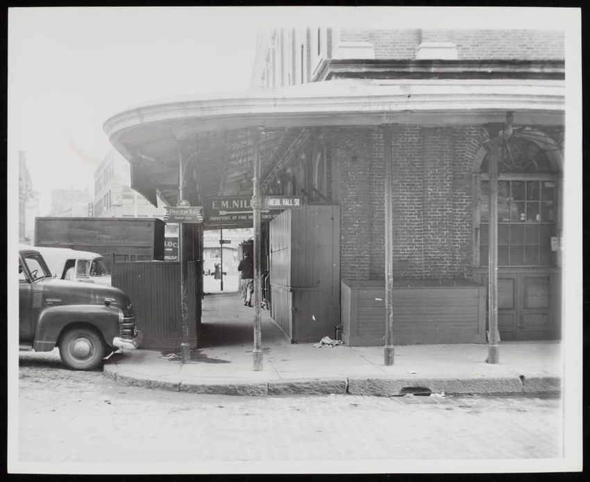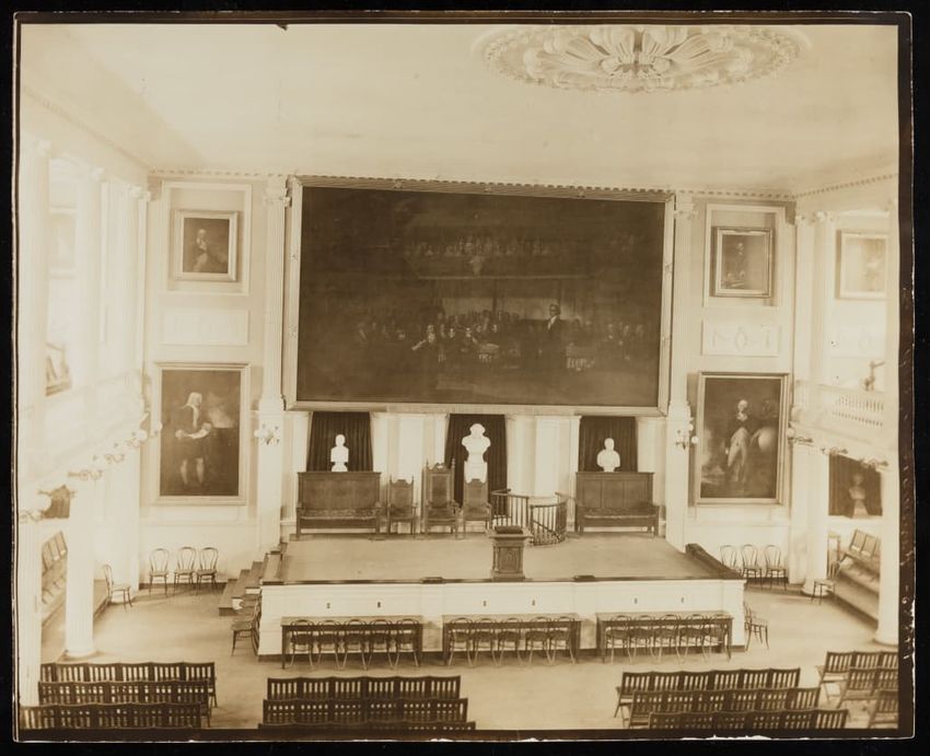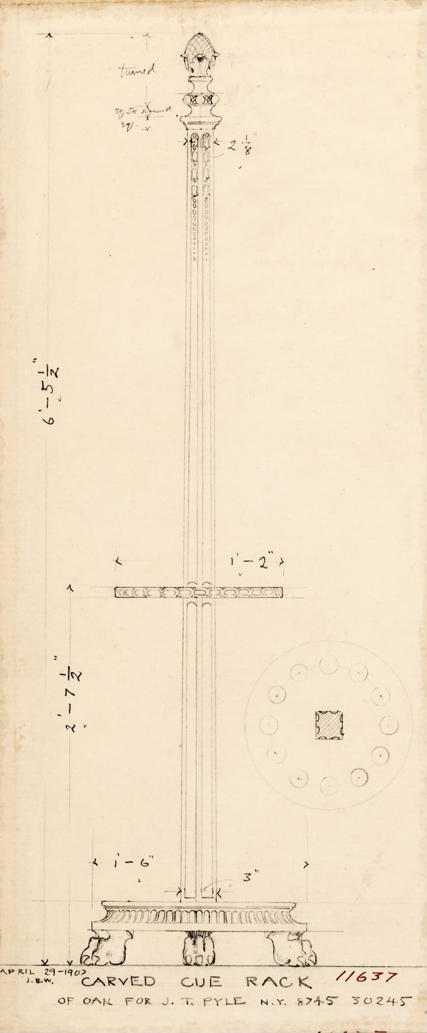 Untitled design drawing rendered in pencil on trace. Front view is shown. Folding screen has three panels, each of which has rectangular frame with domed crest rail; four columnar supports with turned finials and carved acanthus leaves at bottom; casters; fabric or leather covering with single row o...