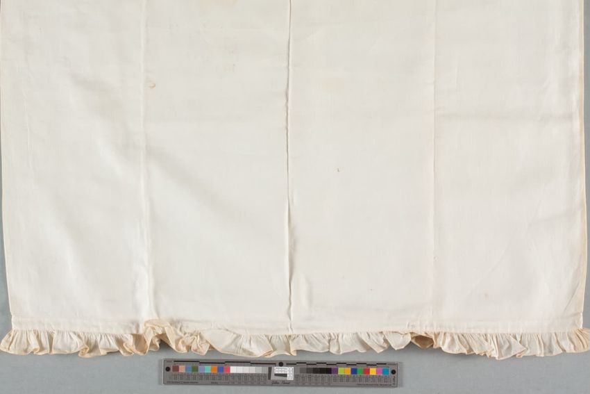 Nearly square, off white, fine linen; 2" wide border; white embroidered wreath of morning glories and wheat with ribbon. Flap at end with five button holes. Made of two pieces.