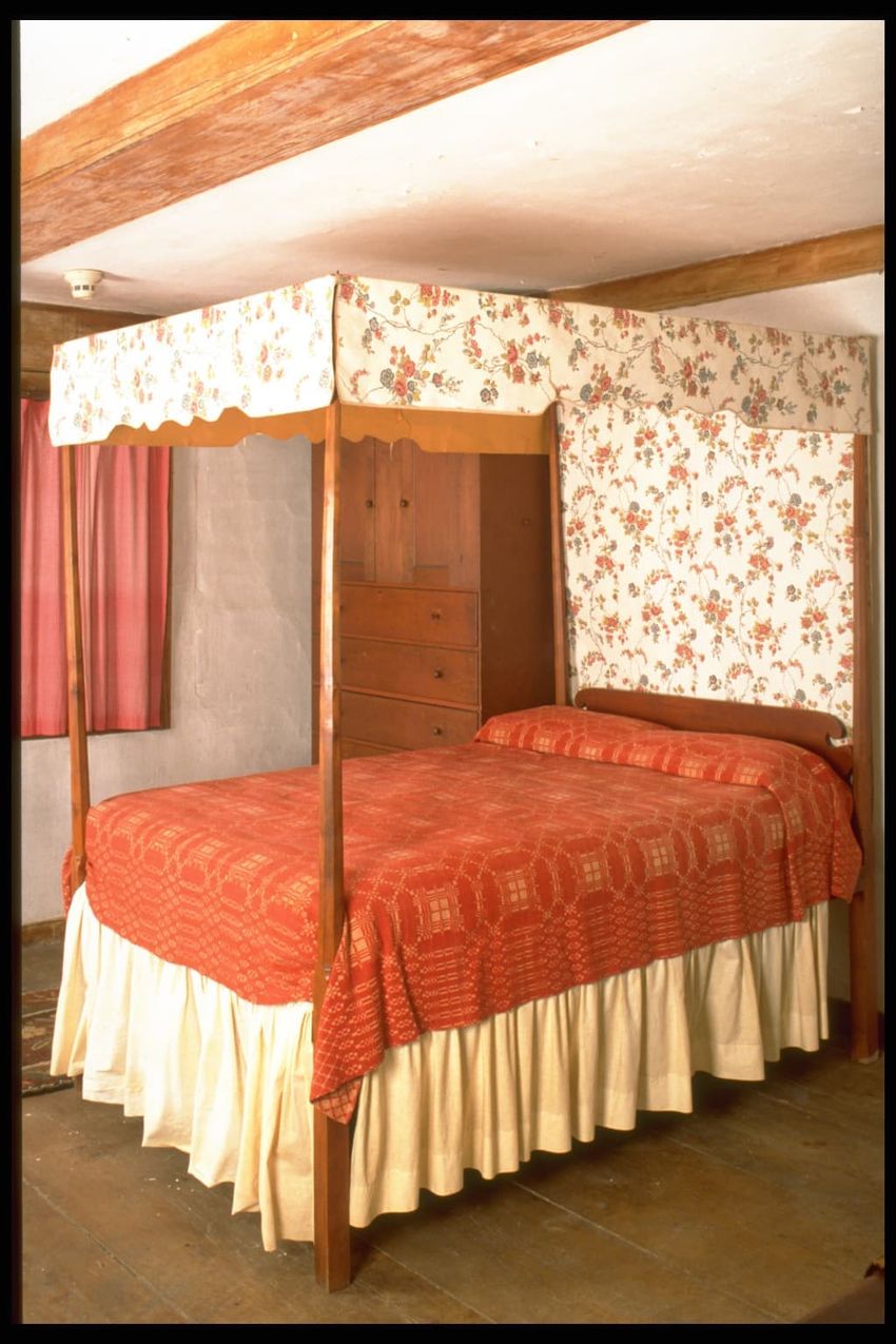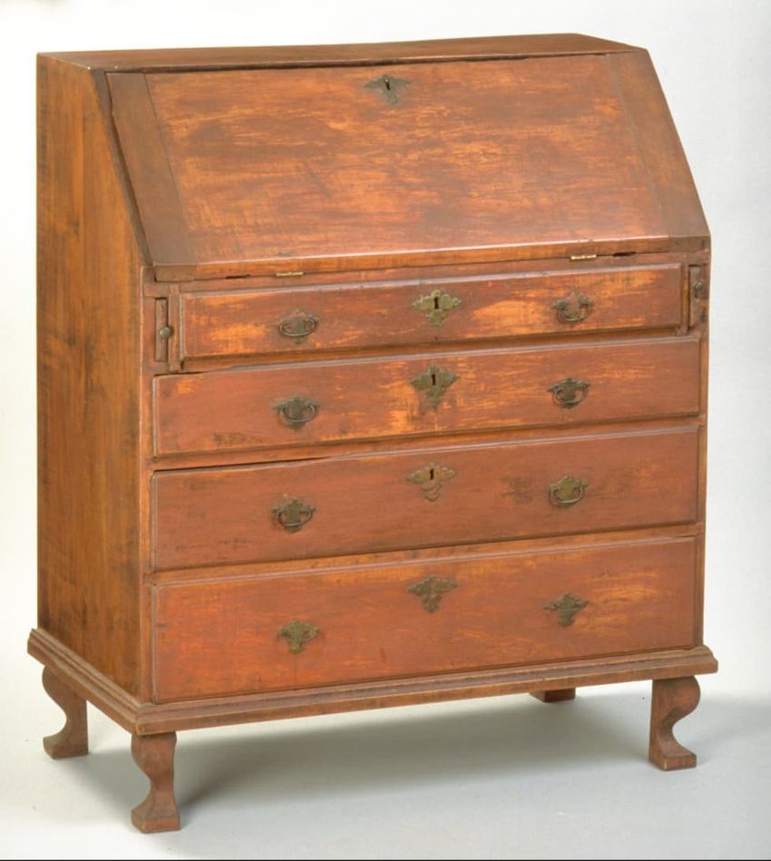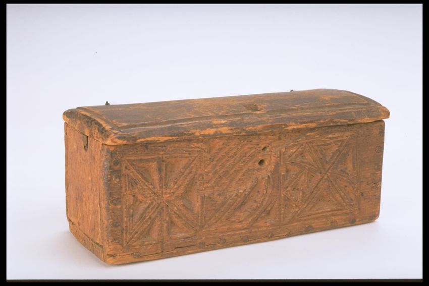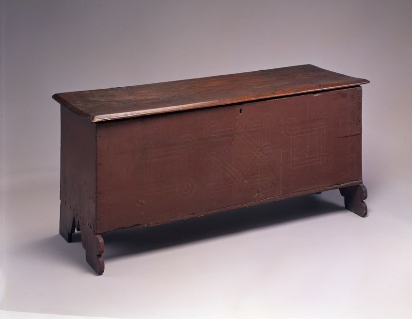 Six-board chest. Pine, paint, cotter pins, nails, wrought-iron nails. Painted red. Rectangular form; beveled top hinged with large cotter pins above bootjack sideb oards with double V-cuts and scalloped shaped protruding front feet. Front corner edges are notched. Shallow gauge-carved front pan...