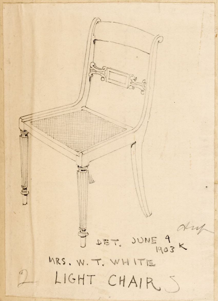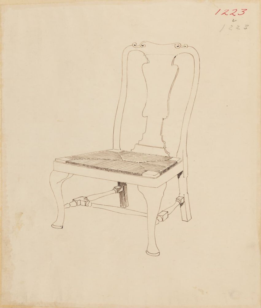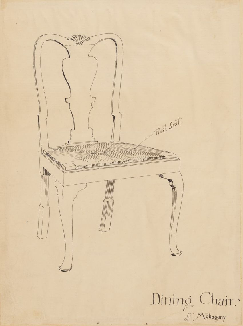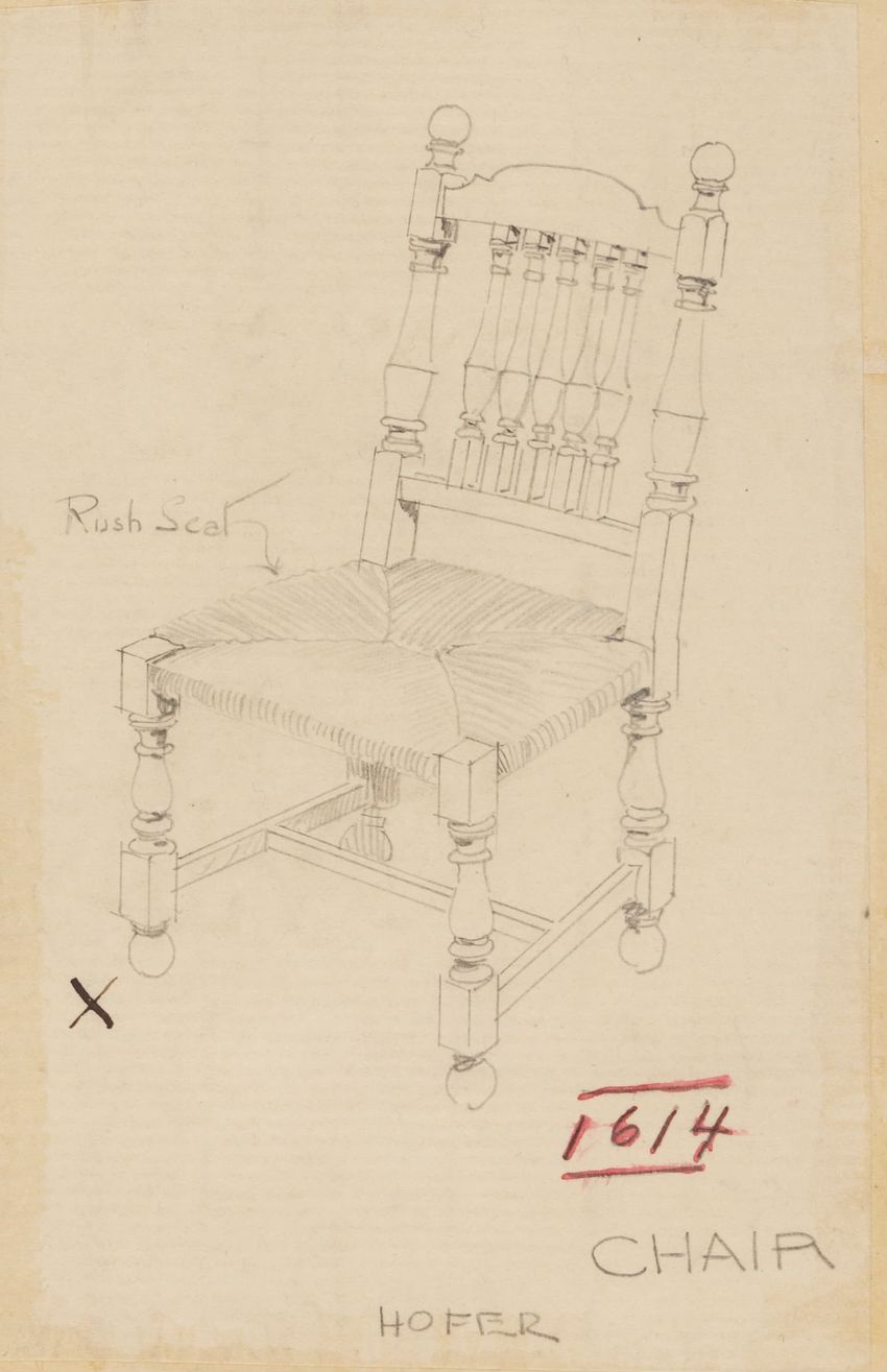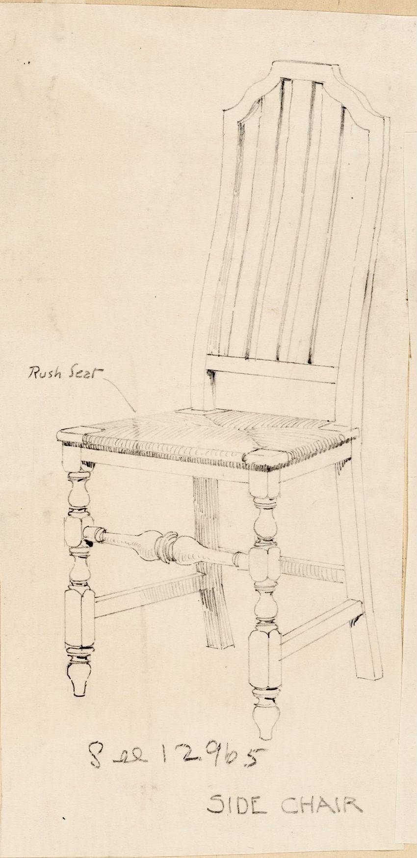 Design drawing titled "Chair" rendered in pencil on trace. Perspective view is shown. Side chair has back withshaped arched crest rail, five vasiform turned spindles, and straight lower rail; stiles with block, ring and vasiform turnings and ball finials; rush seat; legs with block, ring and vasifor...