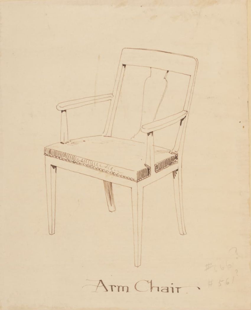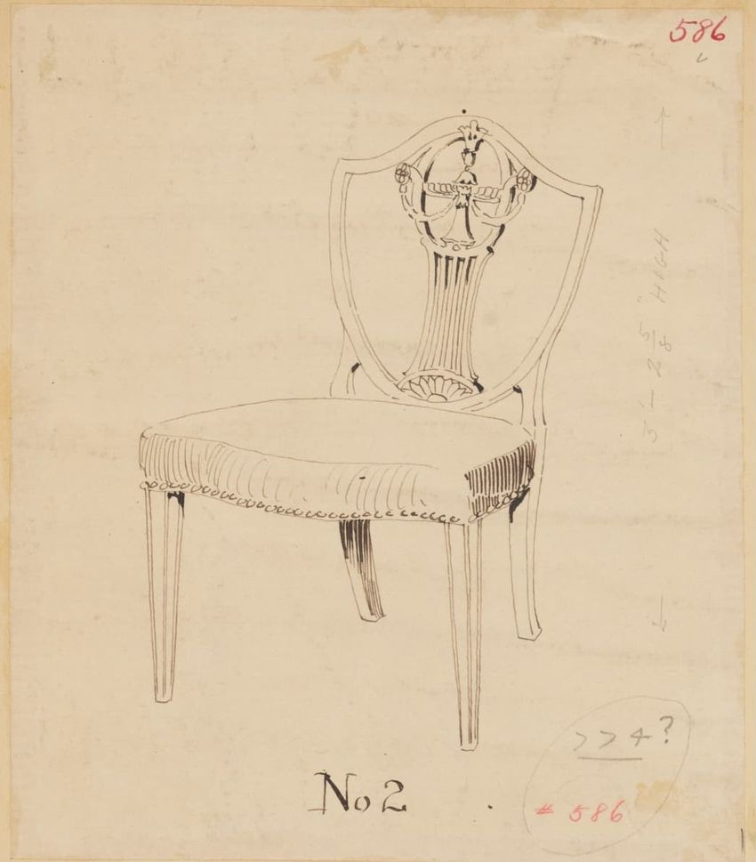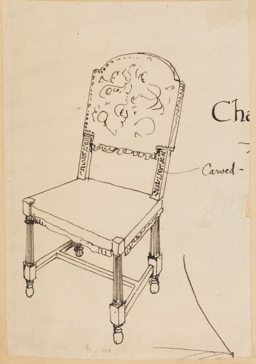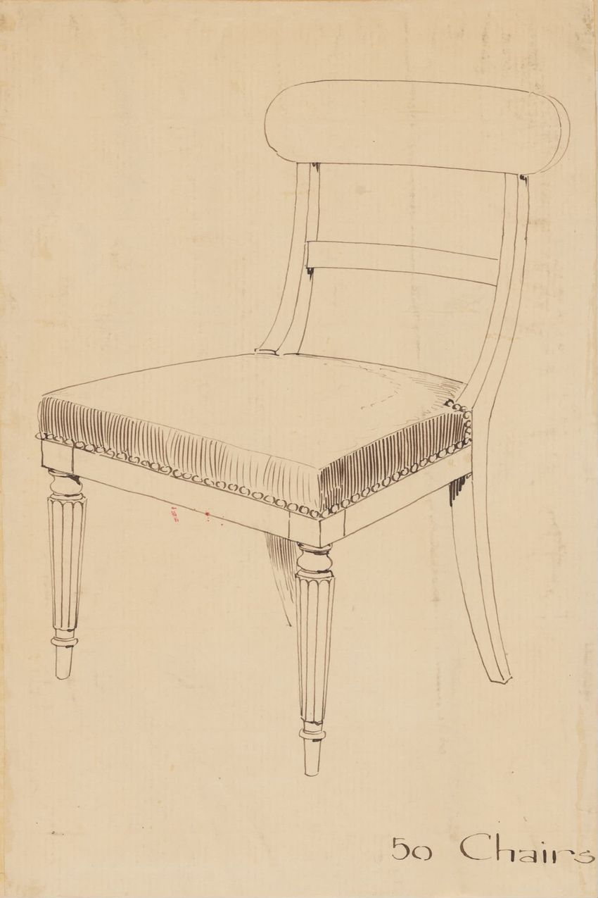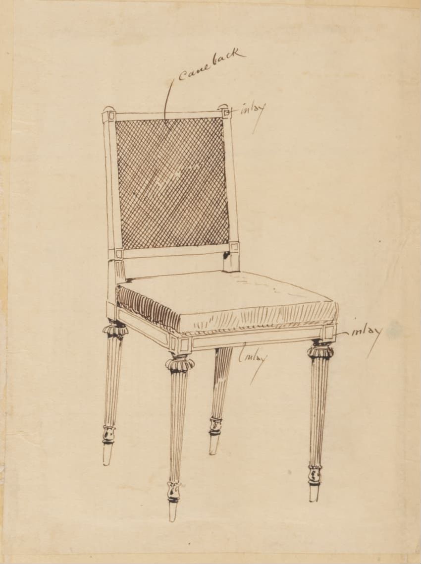 Design drawing titled "Chair" rendered in pencil on trace. Perspective view is shown. Side chair has back withshaped arched crest rail, five vasiform turned spindles, and straight lower rail; stiles with block, ring and vasiform turnings and ball finials; rush seat; legs with block, ring and vasifor...