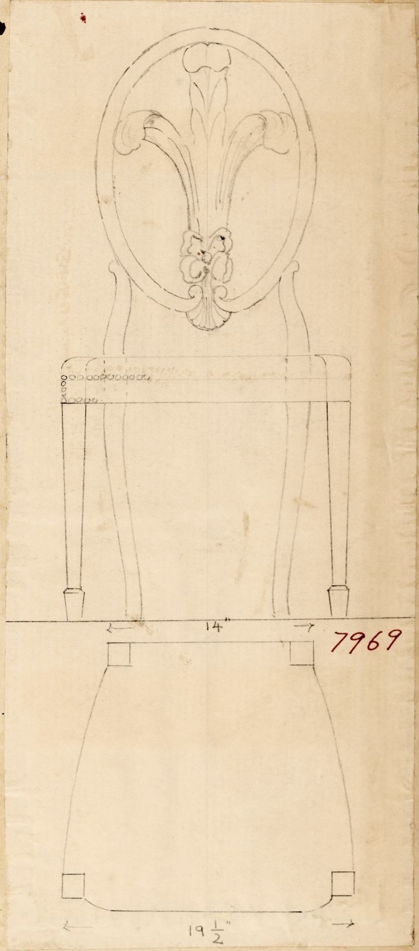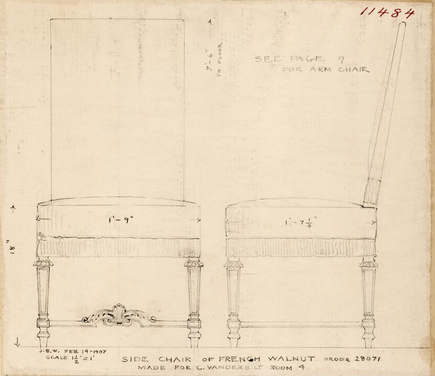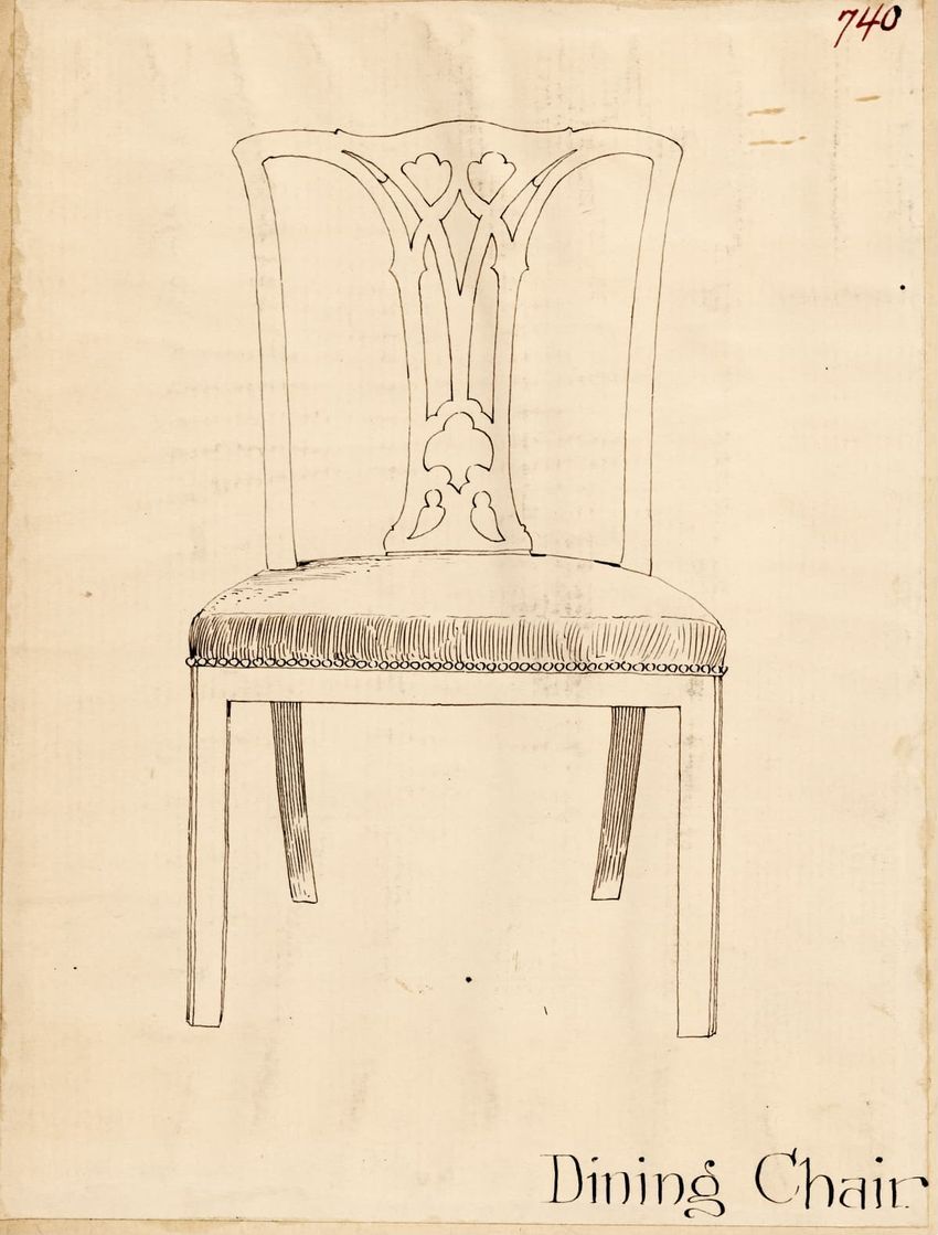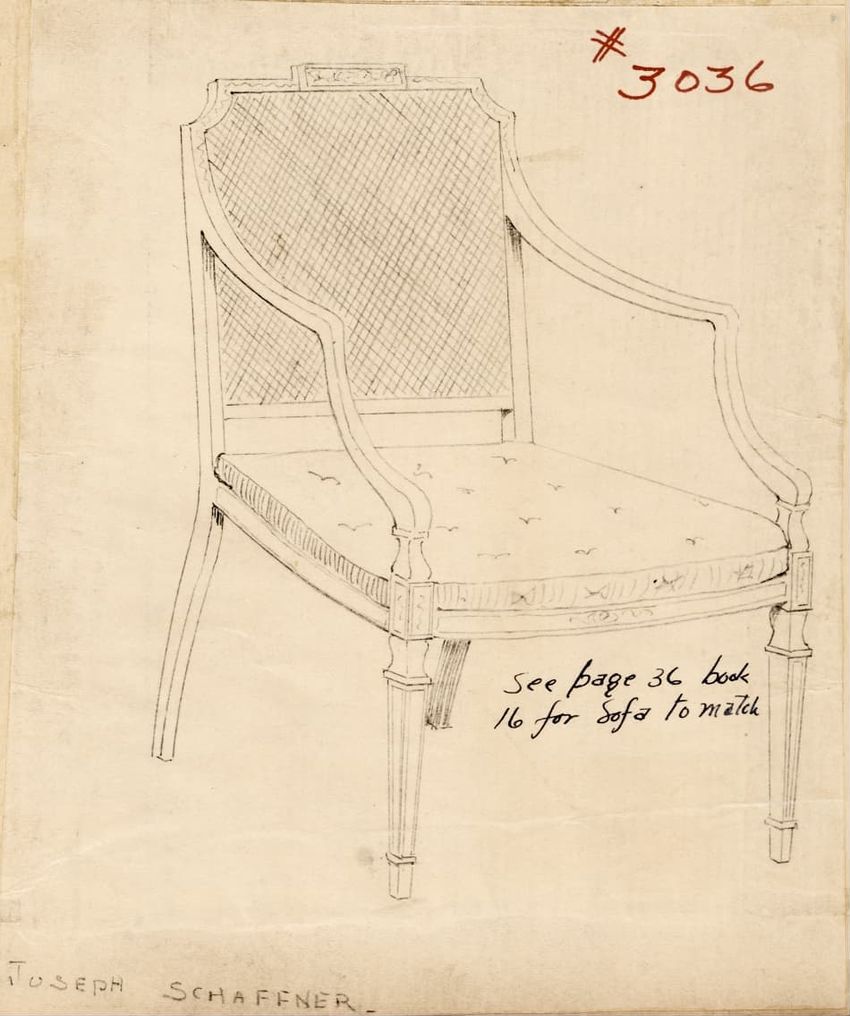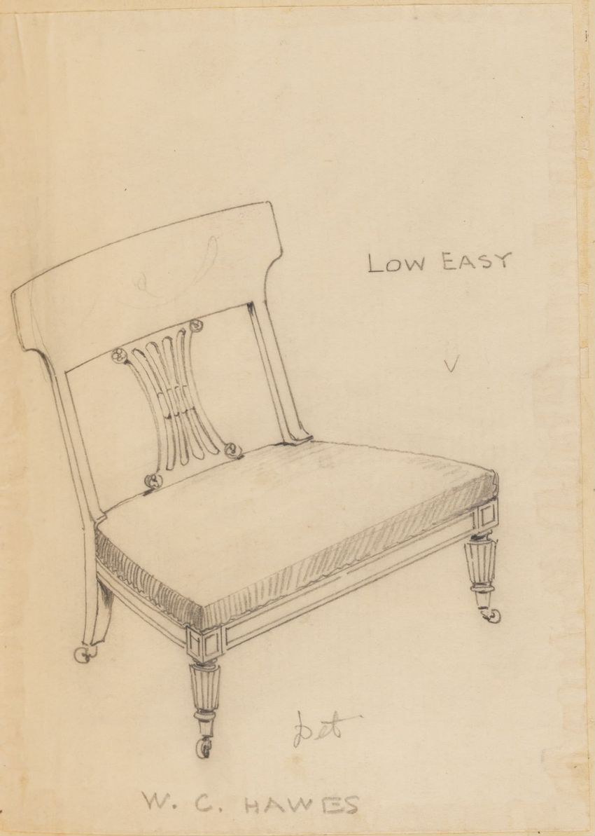 Design drawing titled "Chair" rendered in pencil on trace. Perspective view is shown. Side chair has back withshaped arched crest rail, five vasiform turned spindles, and straight lower rail; stiles with block, ring and vasiform turnings and ball finials; rush seat; legs with block, ring and vasifor...