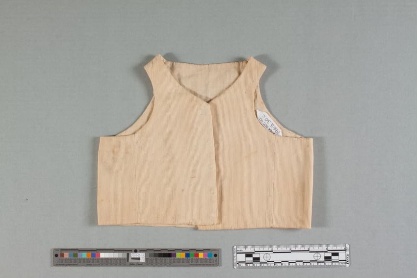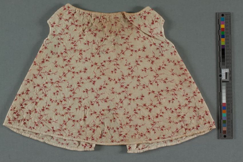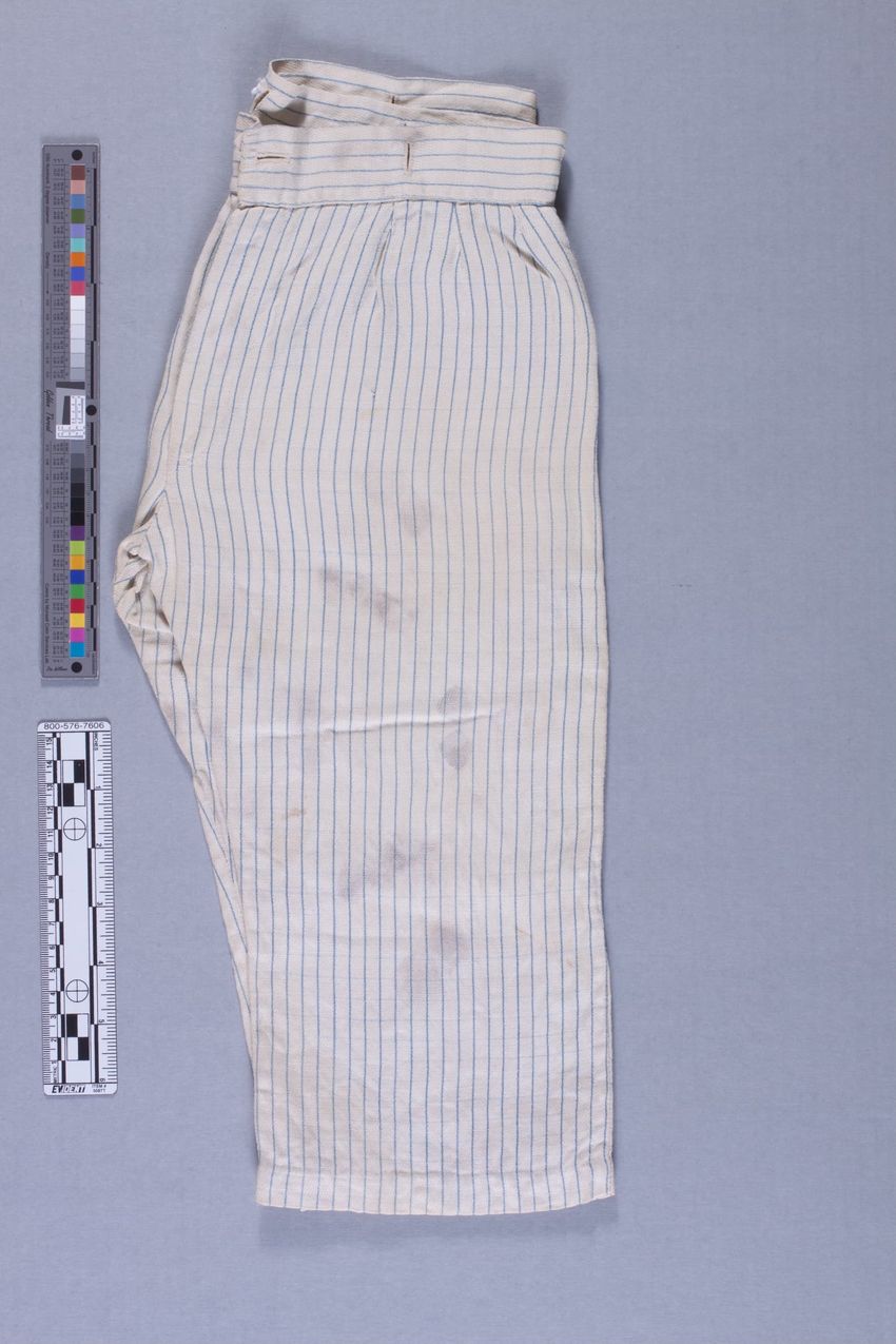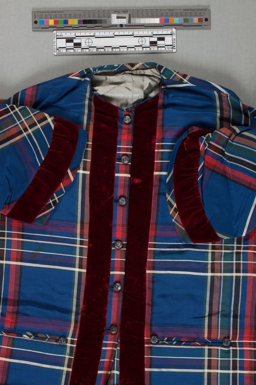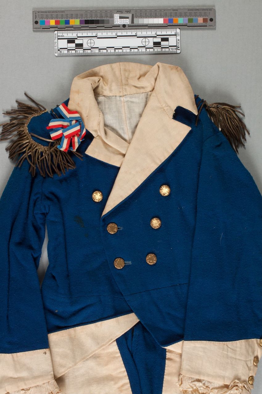 Jacket is red wool with white stripes, trimmed with gold braid on collar, shoulders, cuffs and back. The jacket is lightly padded with a tan cotton lining. It closes up the center front with gilt round buttons. Two rows of decorative buttons flank the center opening. Part of a suit.
