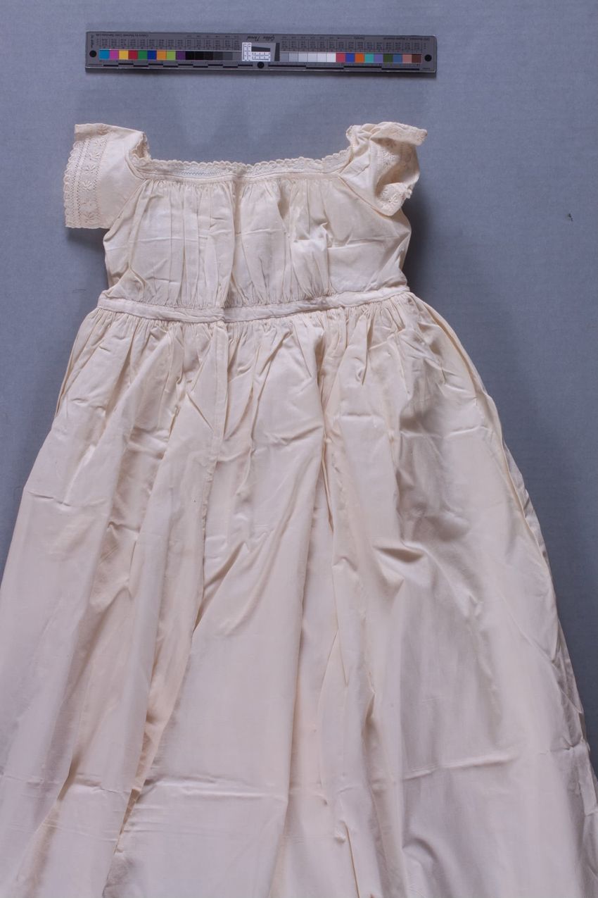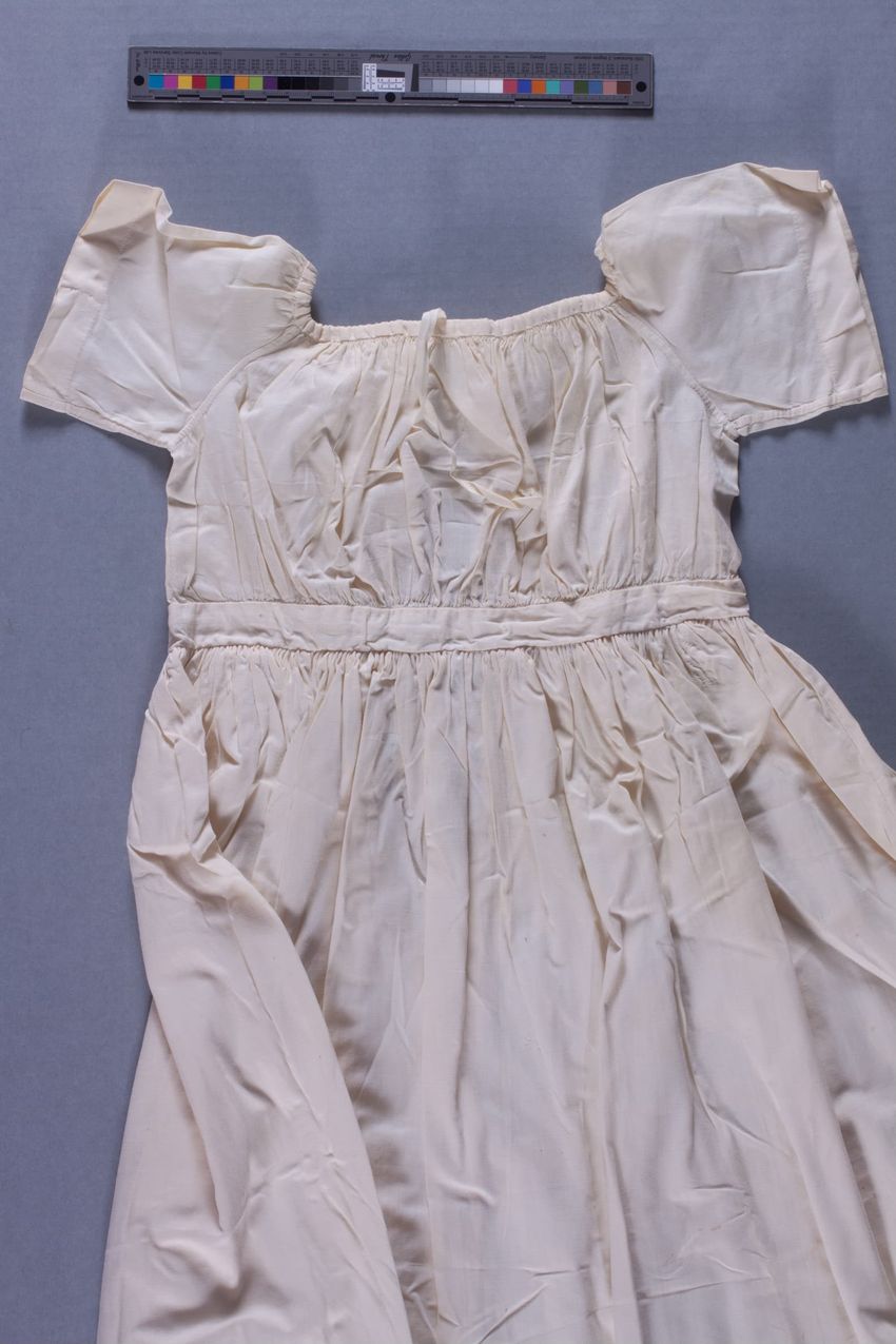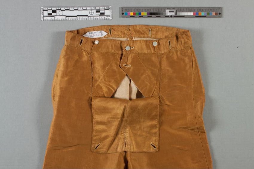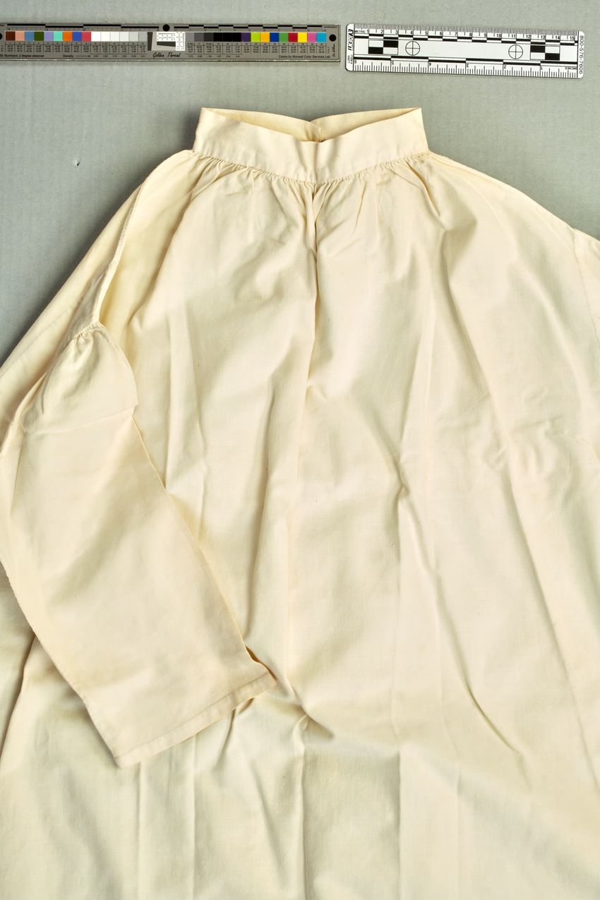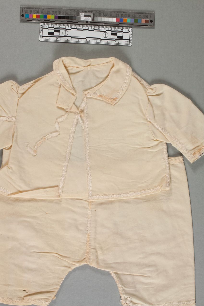 Jacket is red wool with white stripes, trimmed with gold braid on collar, shoulders, cuffs and back. The jacket is lightly padded with a tan cotton lining. It closes up the center front with gilt round buttons. Two rows of decorative buttons flank the center opening. Part of a suit.