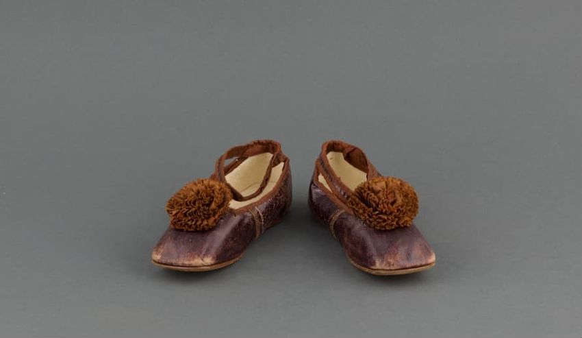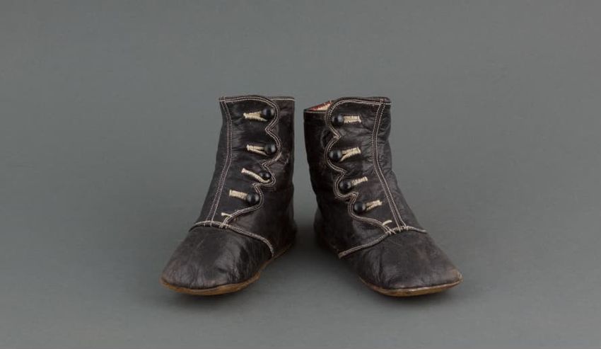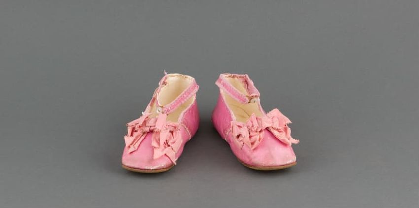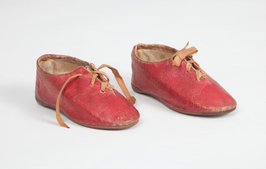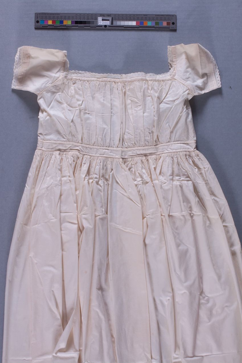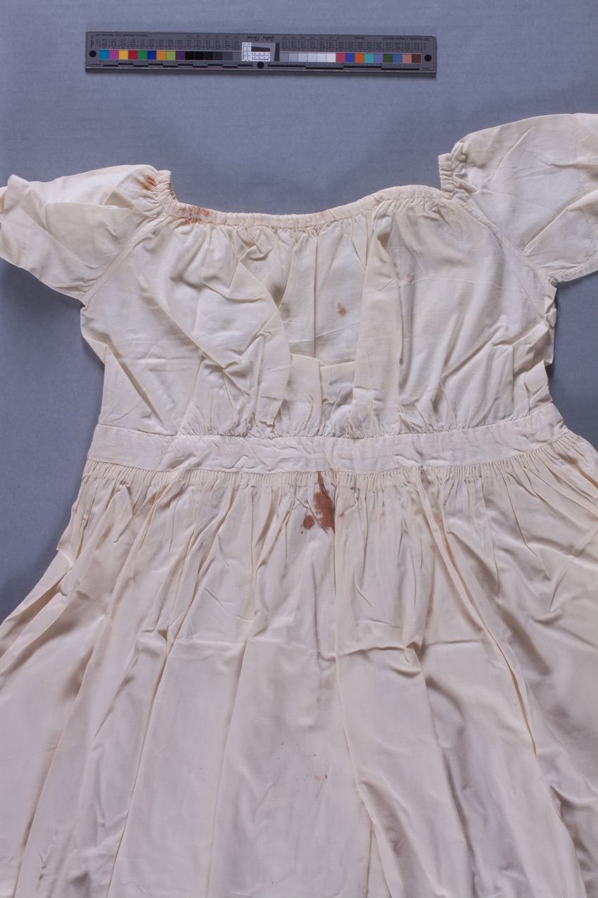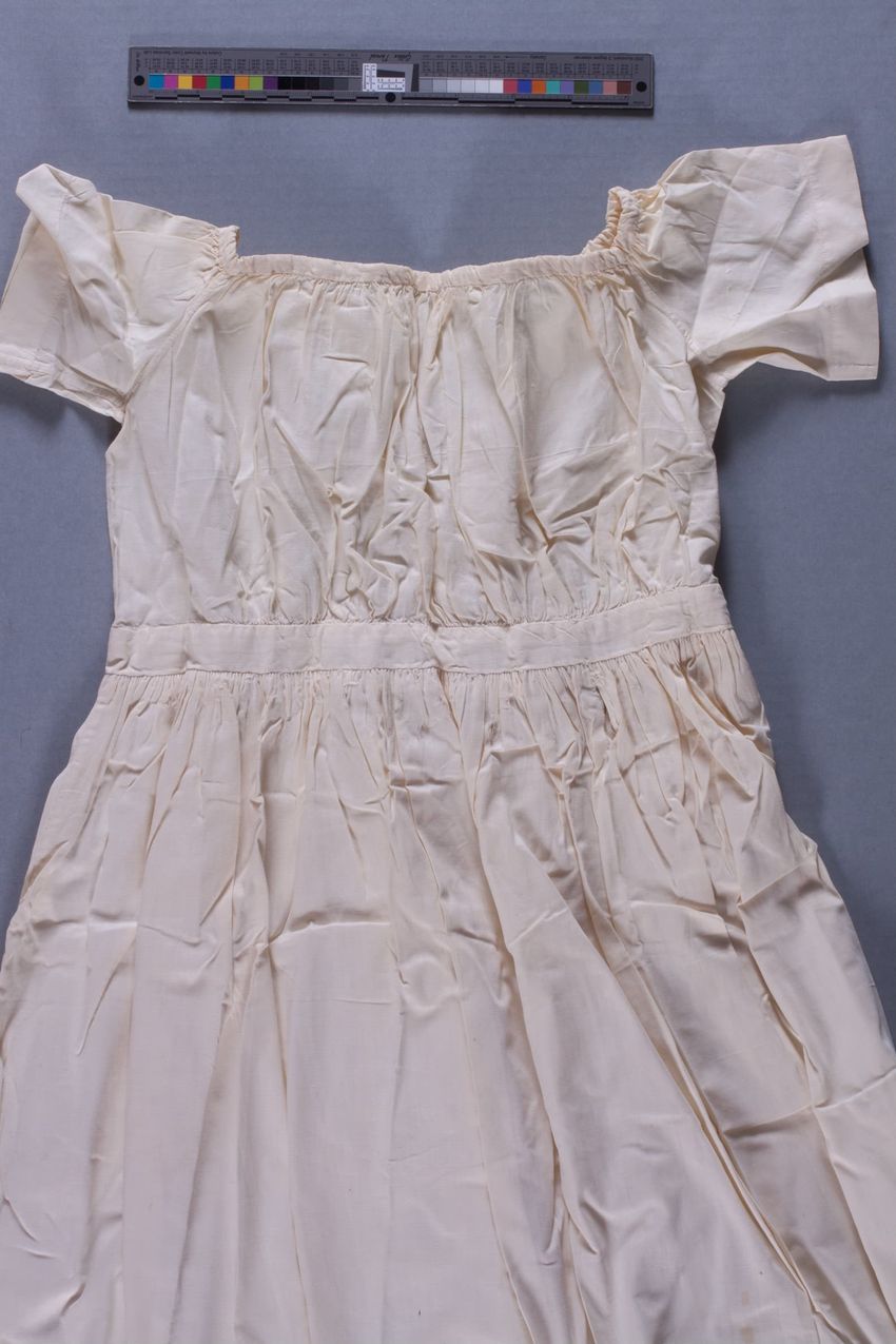 Jacket is red wool with white stripes, trimmed with gold braid on collar, shoulders, cuffs and back. The jacket is lightly padded with a tan cotton lining. It closes up the center front with gilt round buttons. Two rows of decorative buttons flank the center opening. Part of a suit.