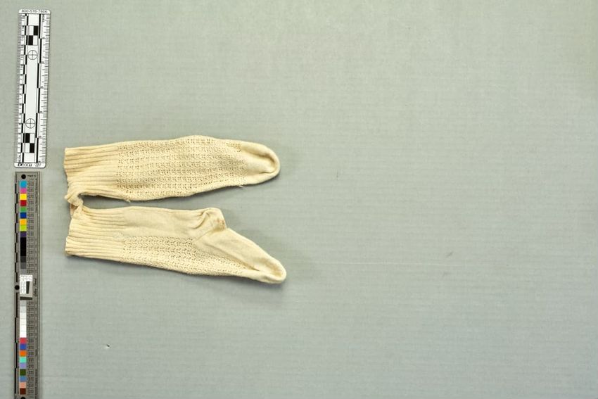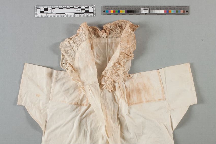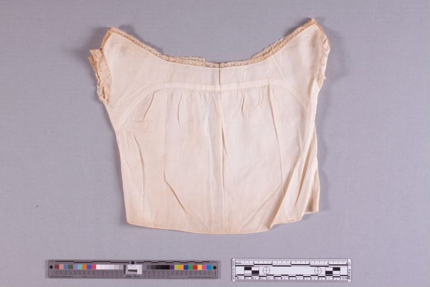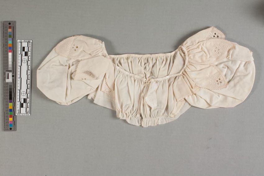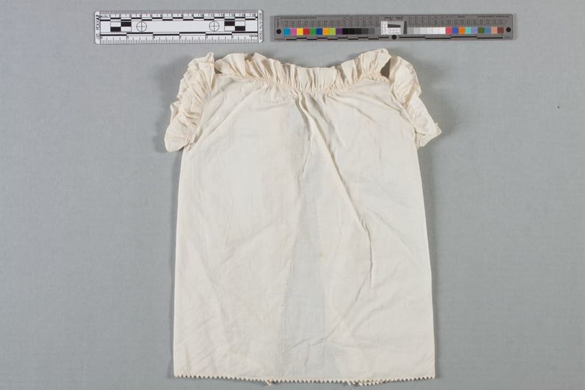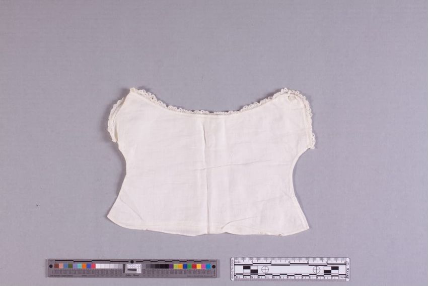 Boy's shirt of cream-colored cotton with a deep square linen collar trimmed with a band of needle lace, short sleeves set with underarm triangular gussets and deep vents at each side seam, finished with small stabilizing plackets.