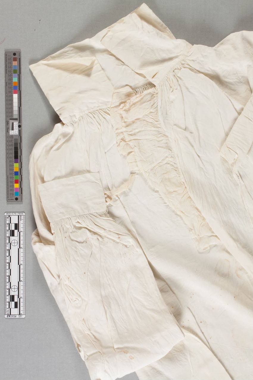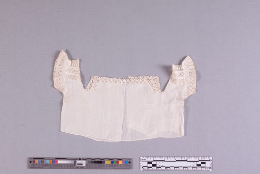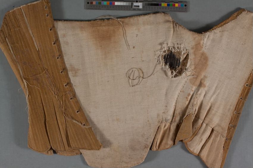 Brown, blue plaid, standing collar, long sleeves, lace front with pearl buttons, hook and eye back with small strap closer and flared skirt, laced with blue, string and tassle.